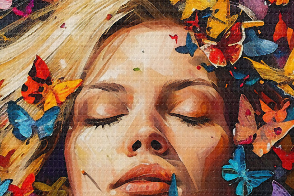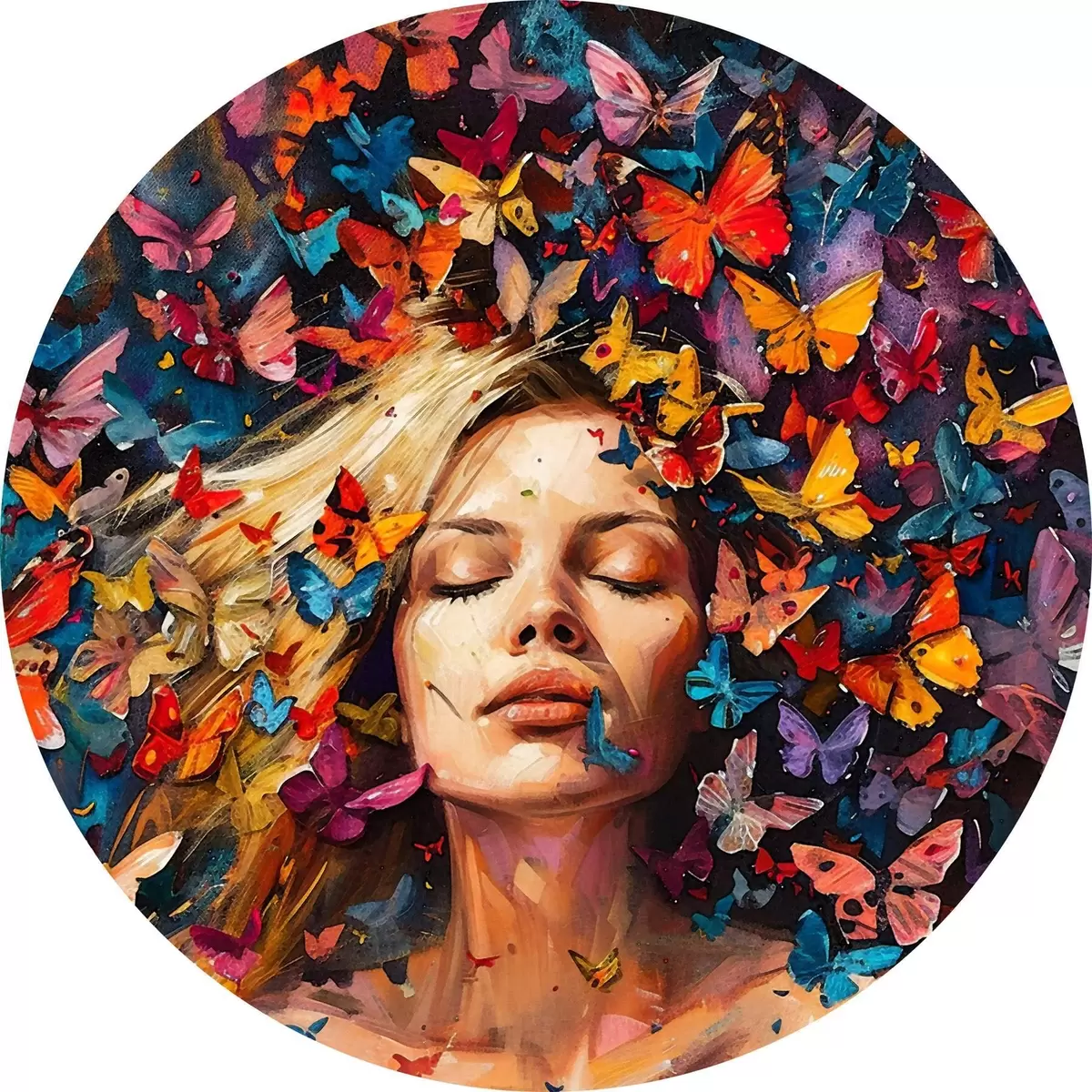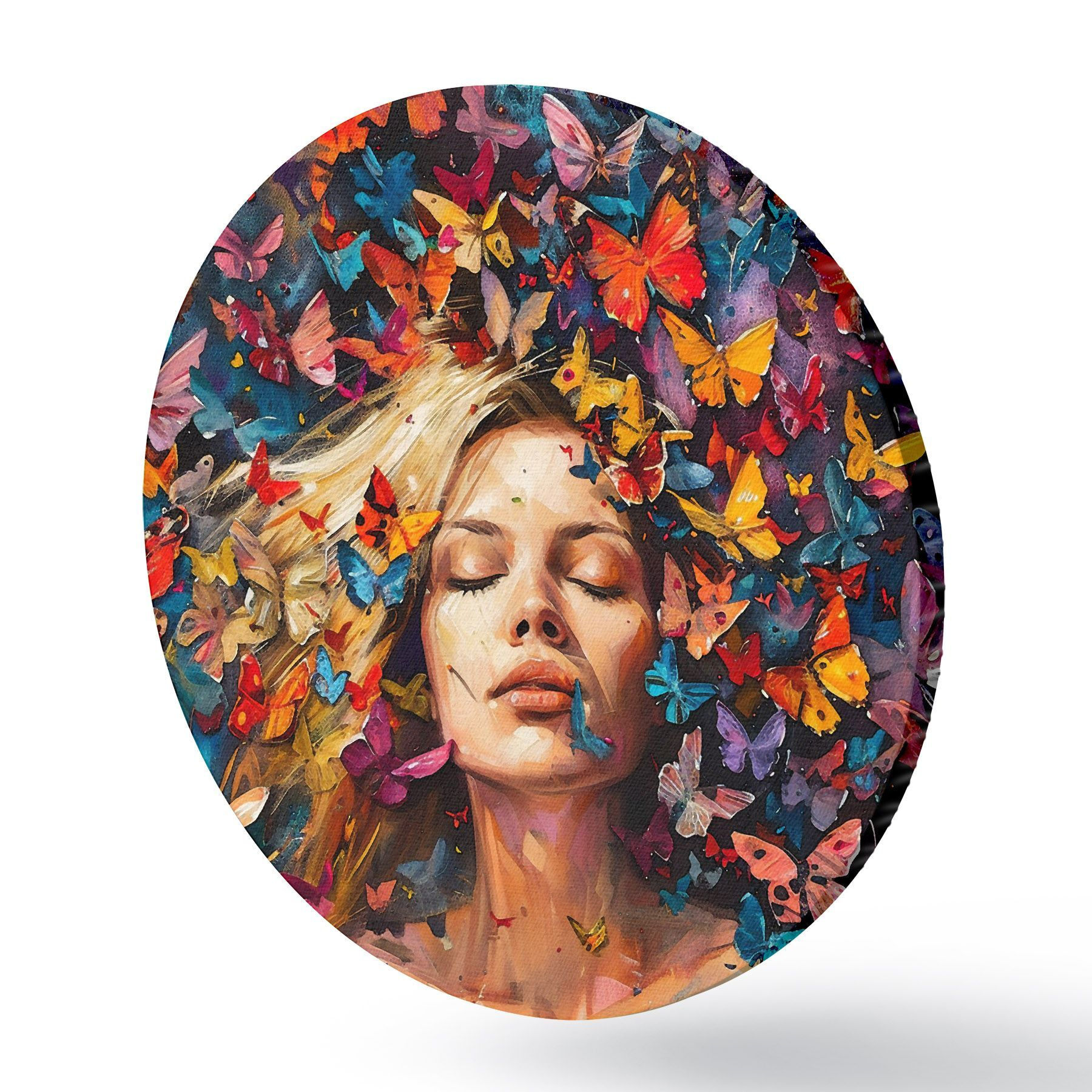 Pilt Õlimaal noorest naisest, keda ümbritseb värviliste liblikate parv tumedal taustal Nr r38972