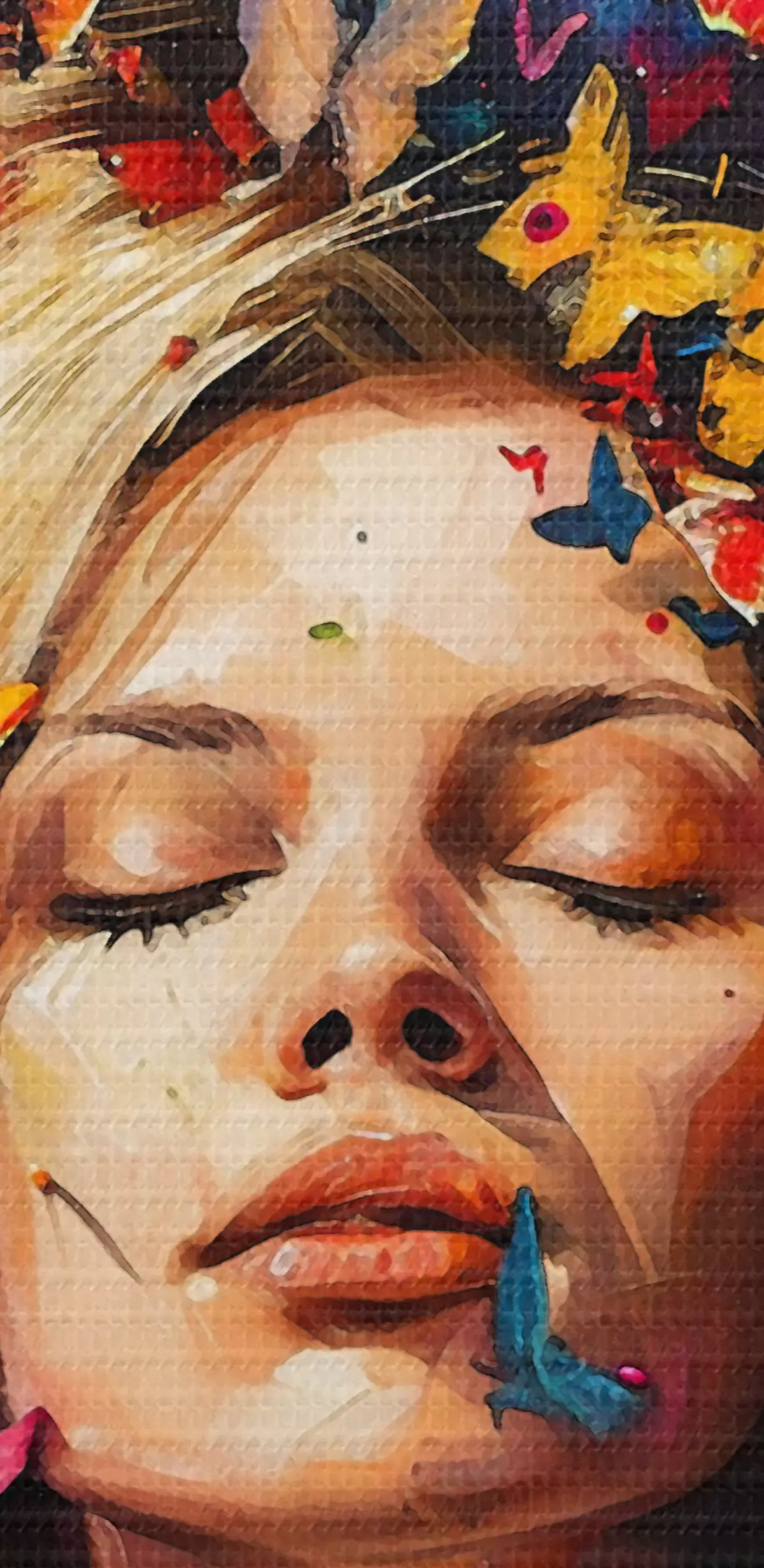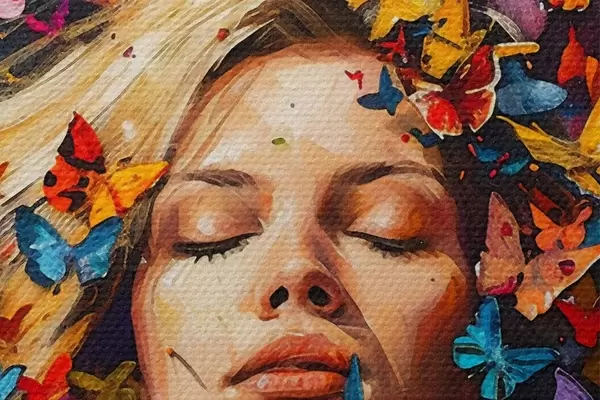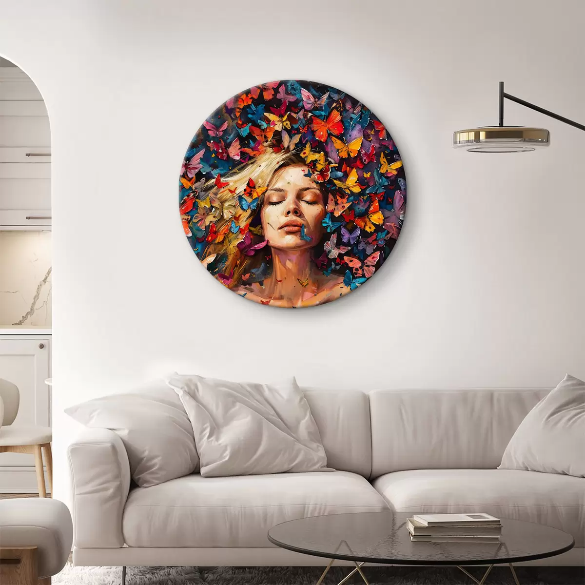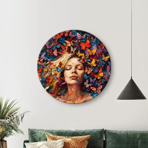 Pilt Õlimaal noorest naisest, keda ümbritseb värviliste liblikate parv tumedal taustal Nr r38972