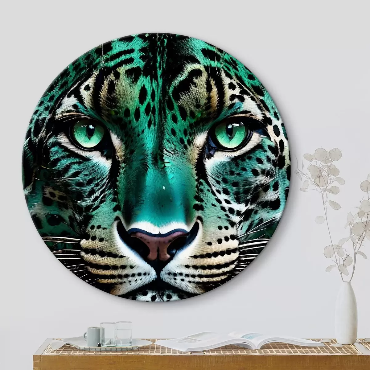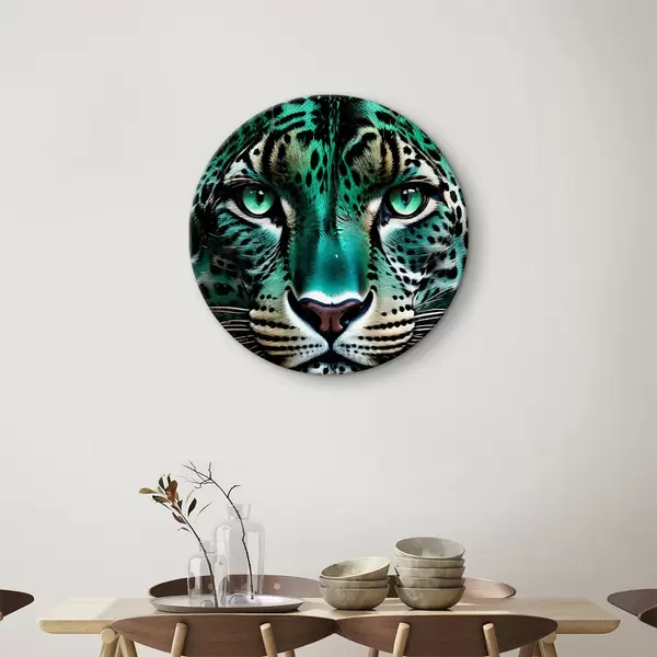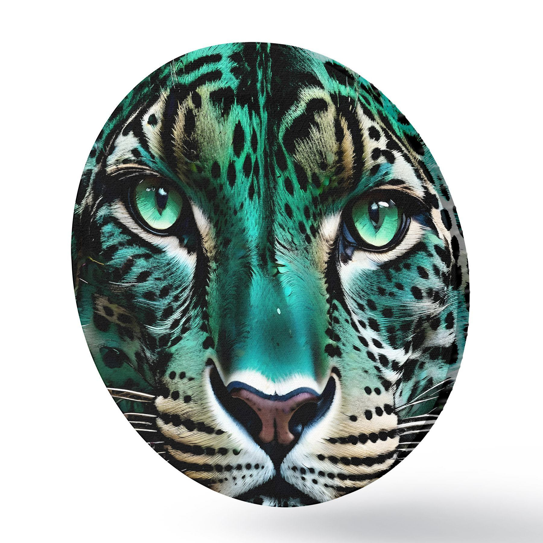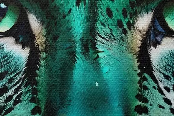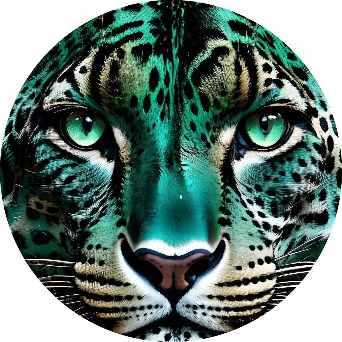 Pilt Lähivõtte portree ägedast roheliste silmadega leopardist, millel on särtsakas türkiissinine ja mustalaiguline karv Nr r38979