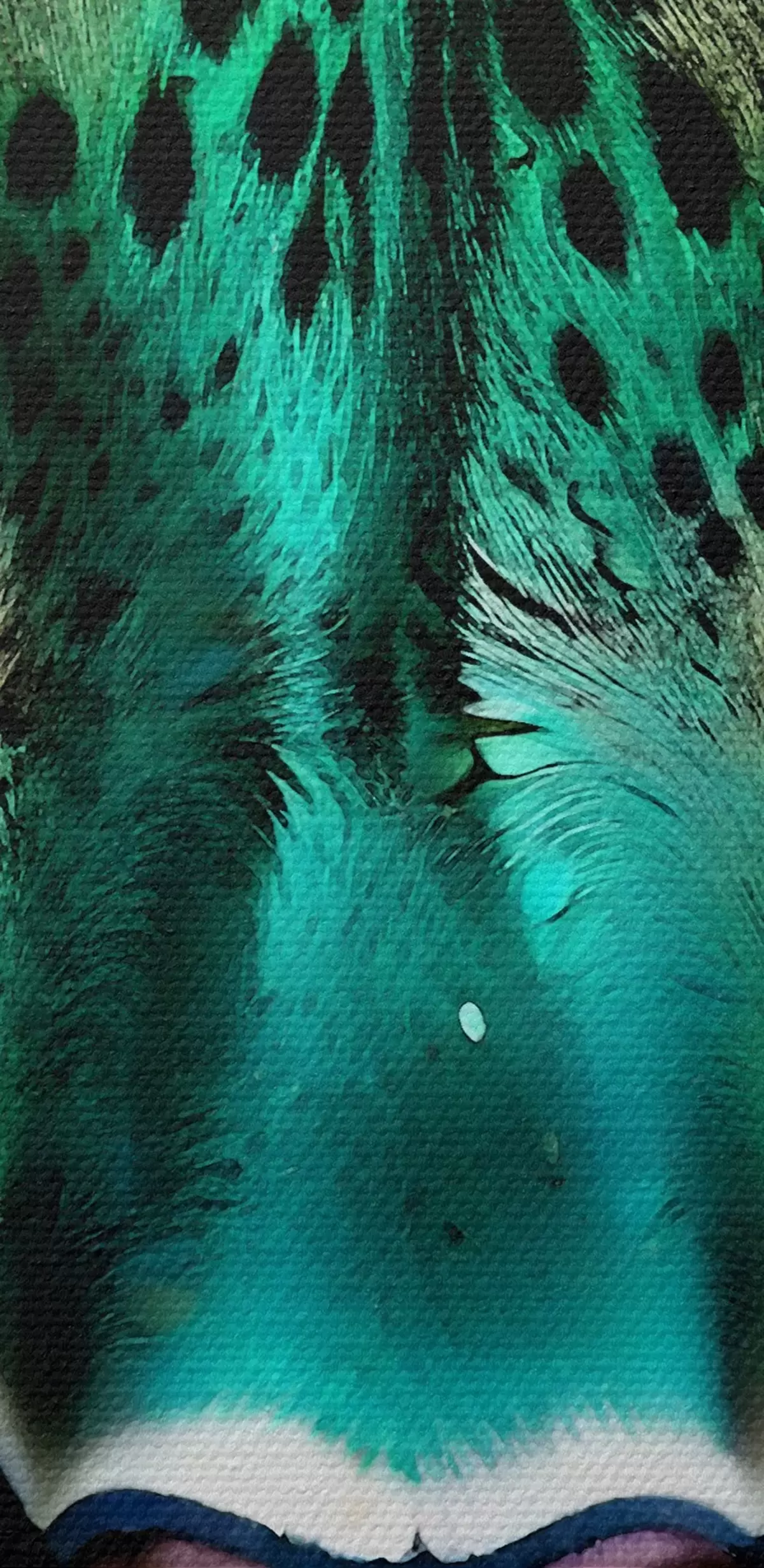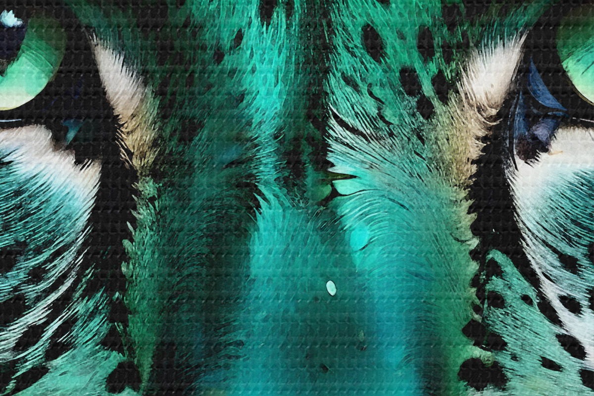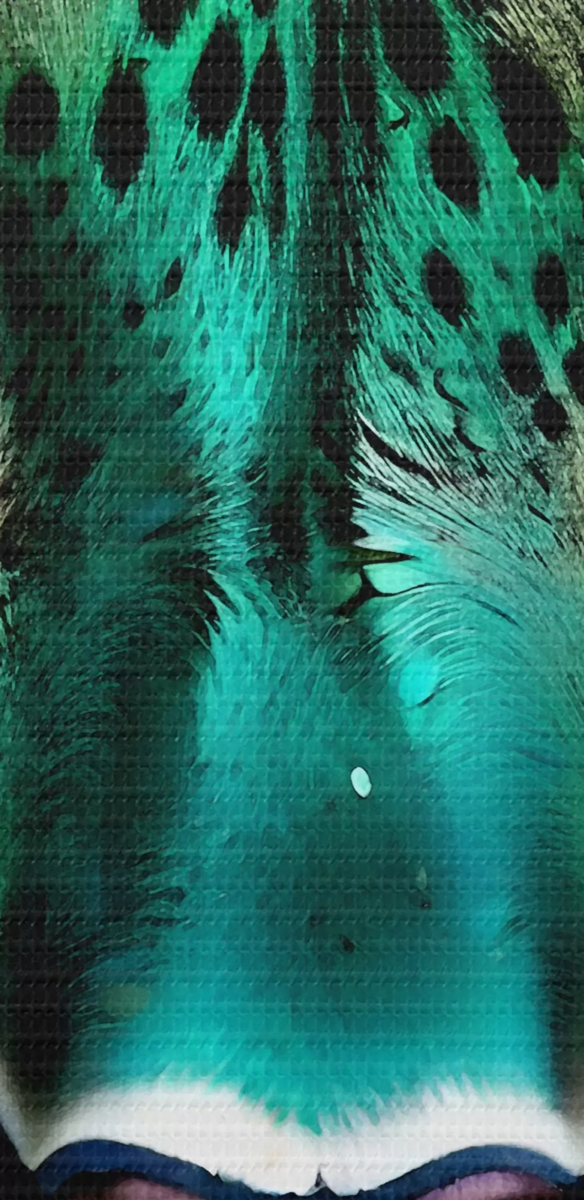 Pilt Lähivõtte portree ägedast roheliste silmadega leopardist, millel on särtsakas türkiissinine ja mustalaiguline karv Nr r38979