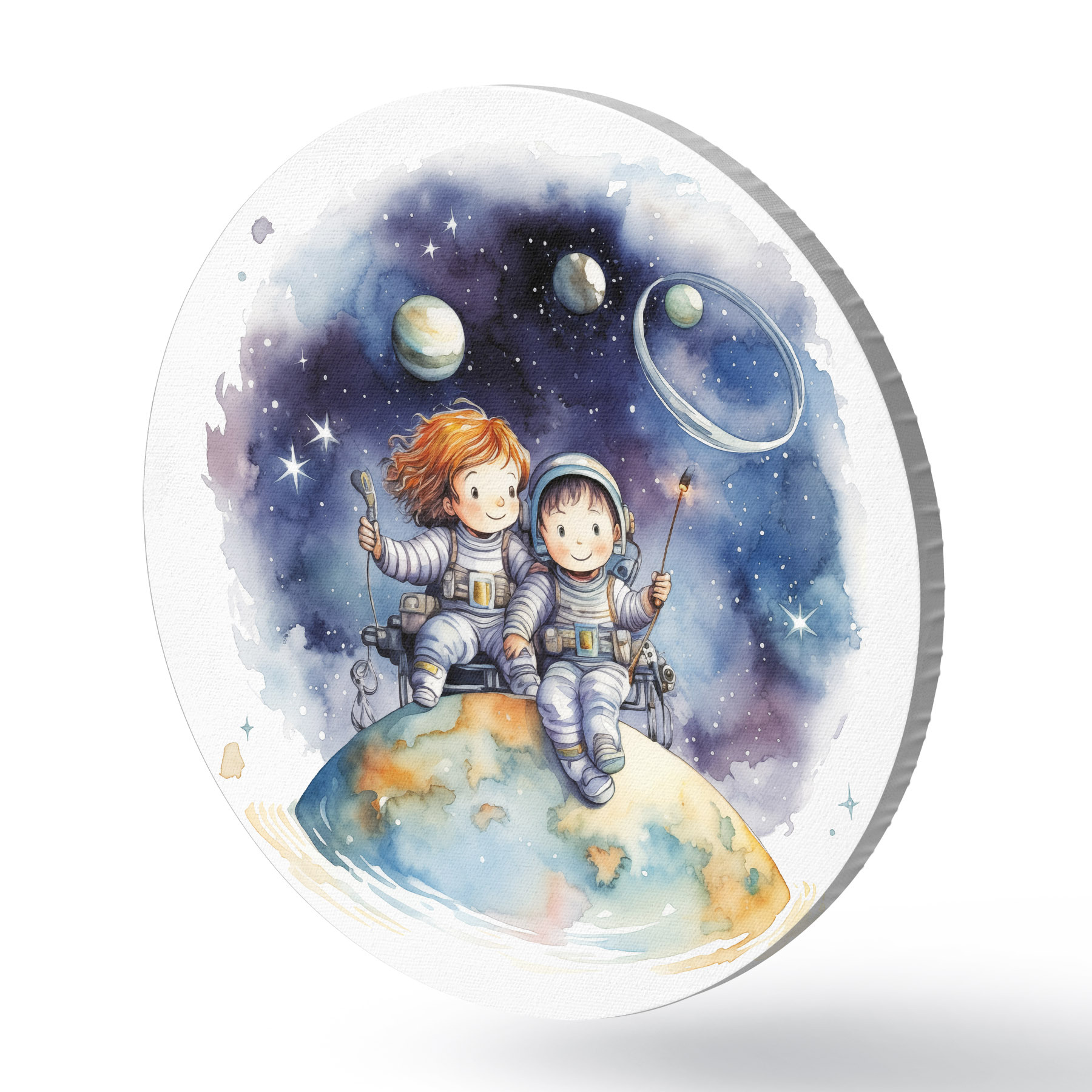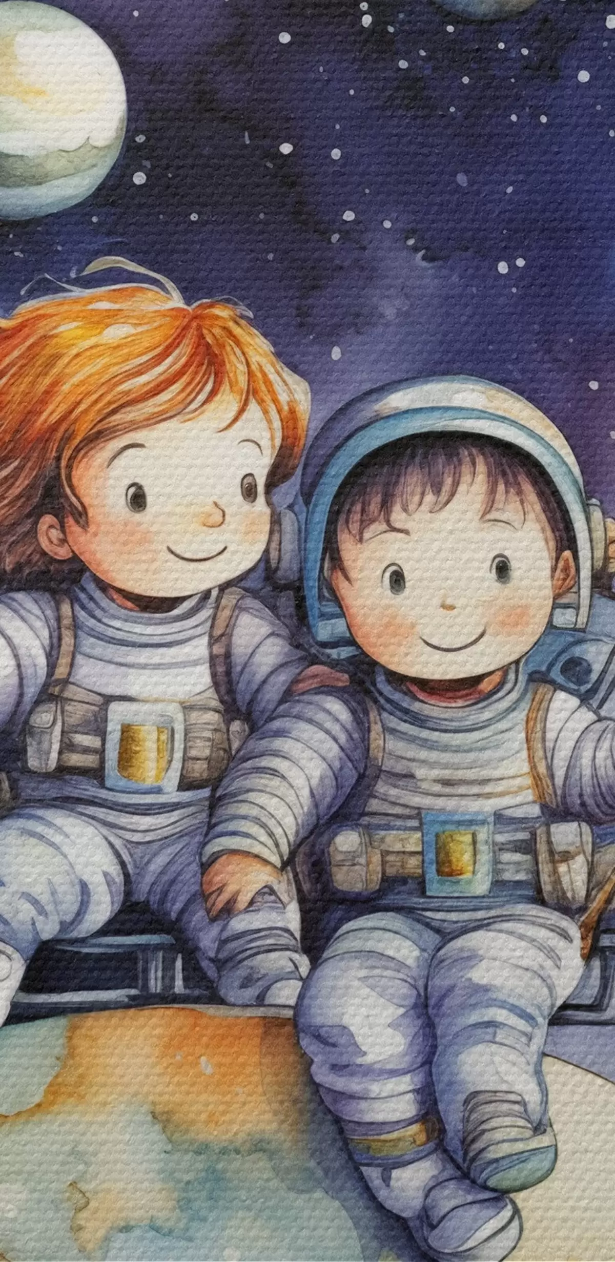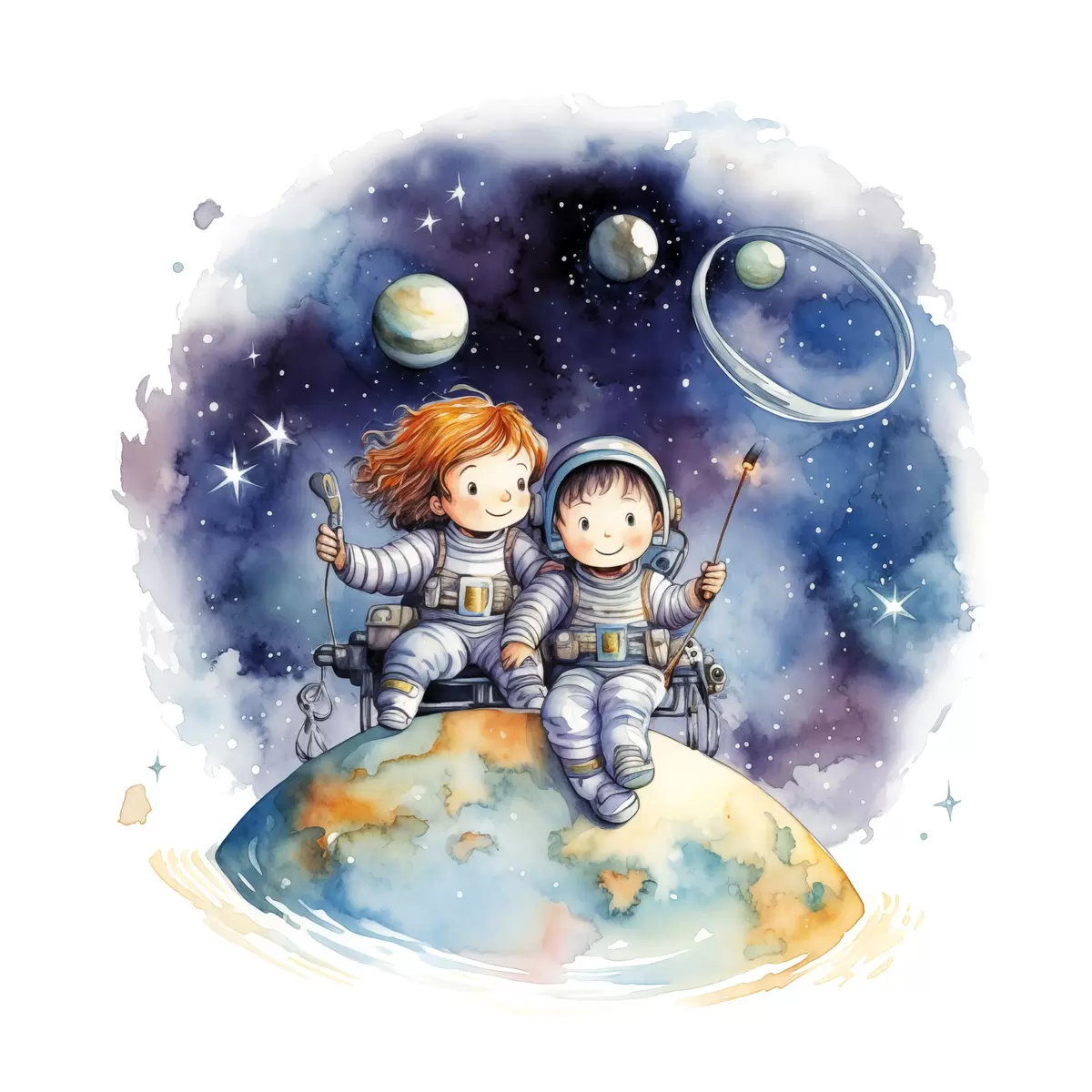 Pilt Skafandrites lapsed istuvad planeedil kosmoses, laste akvarellillustratsioon Nr r39117
