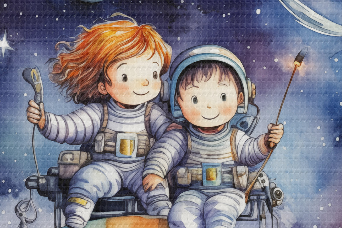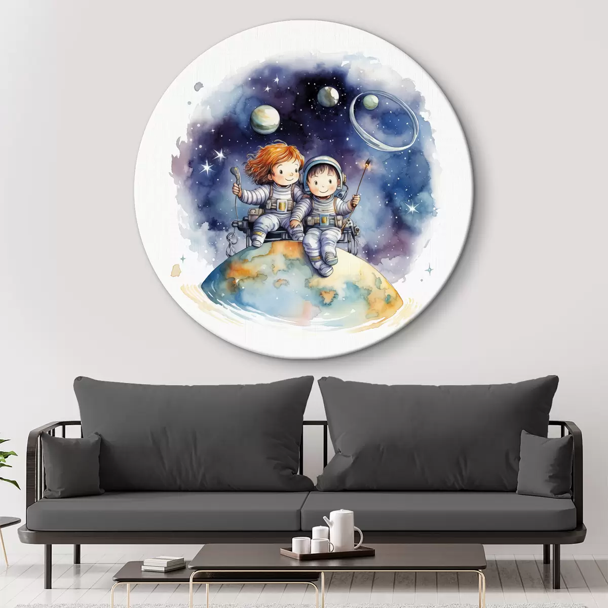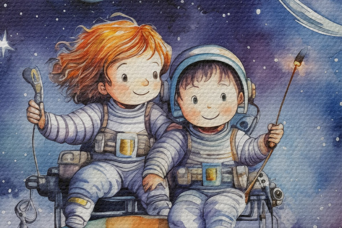 Pilt Skafandrites lapsed istuvad planeedil kosmoses, laste akvarellillustratsioon Nr r39117
