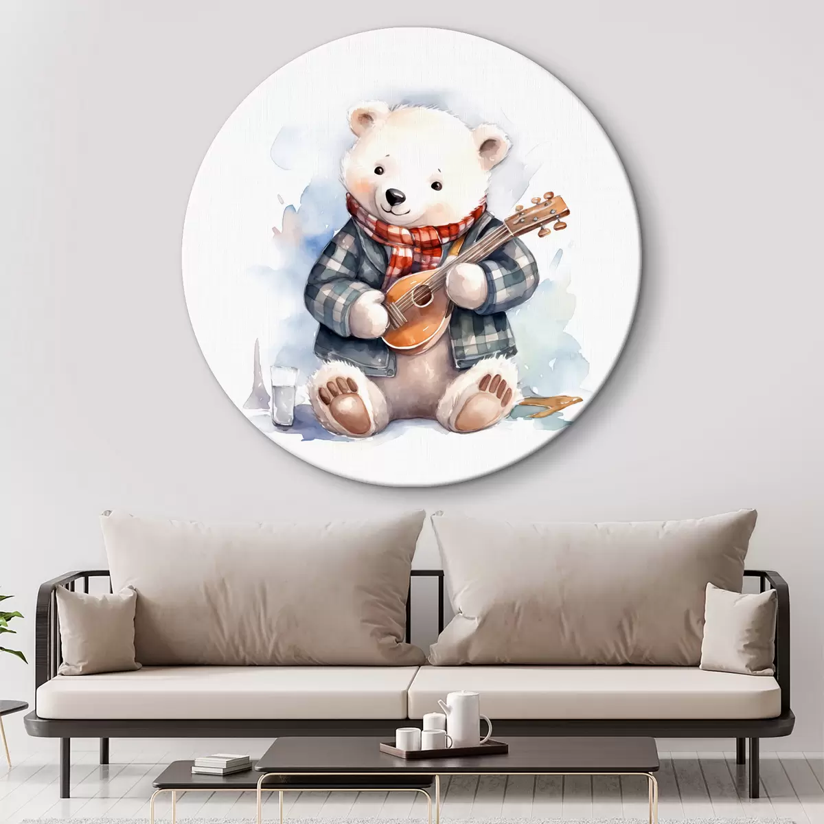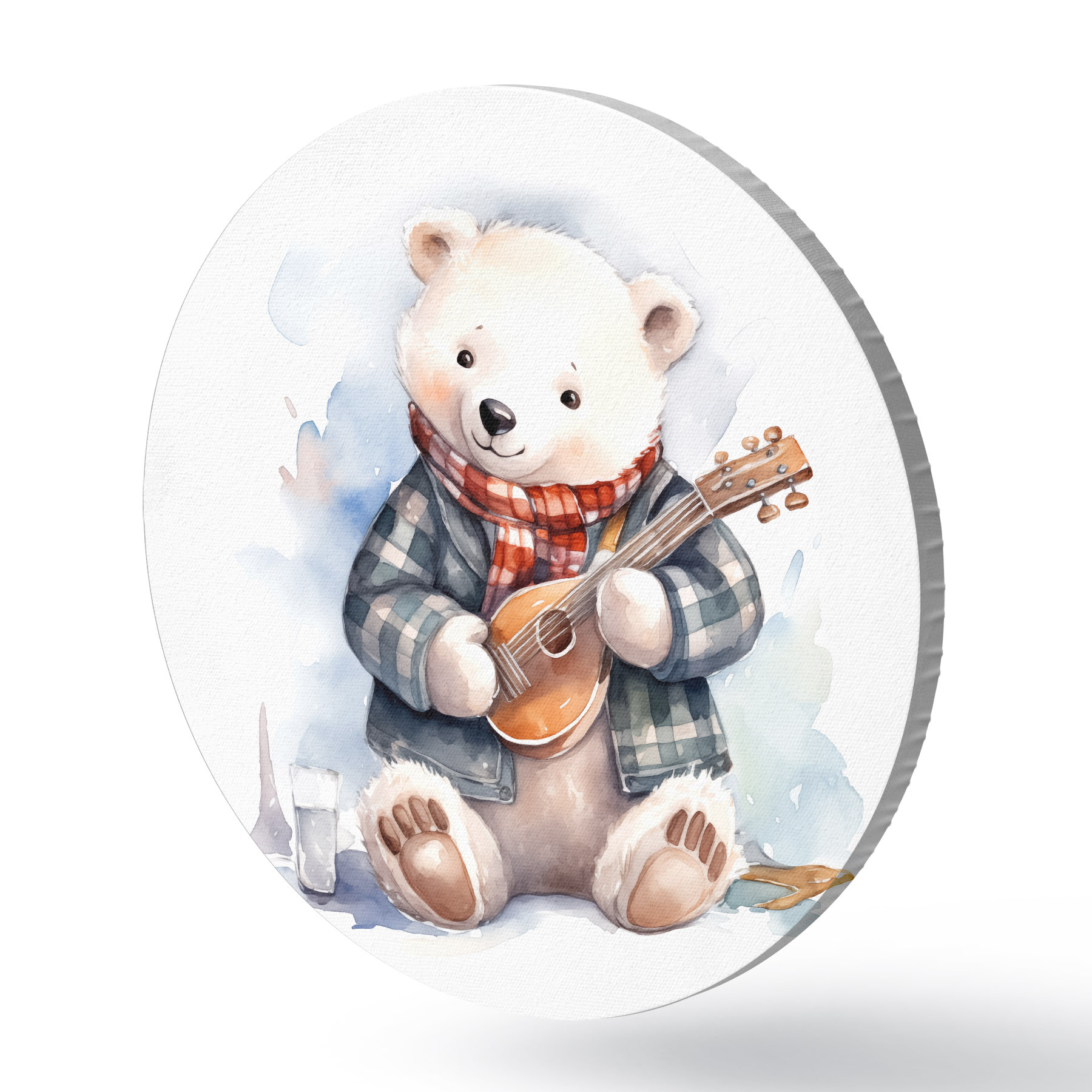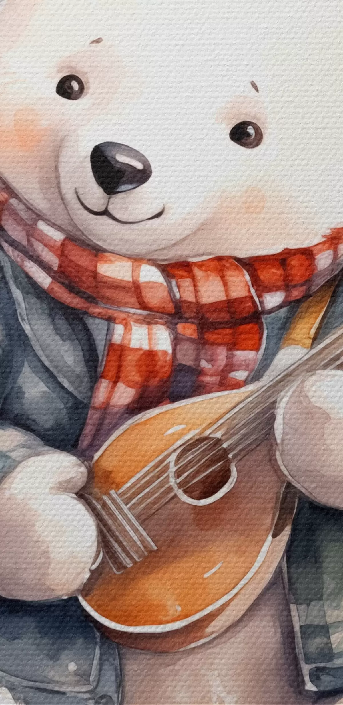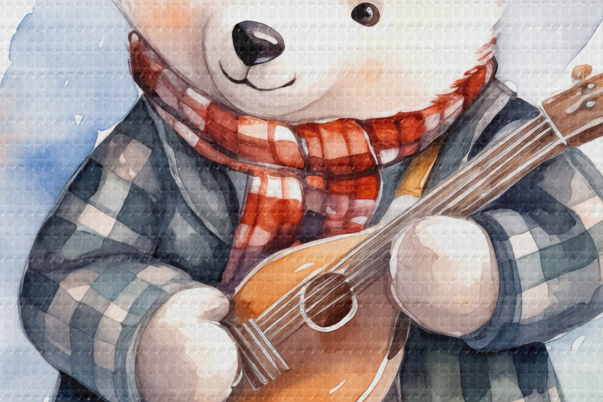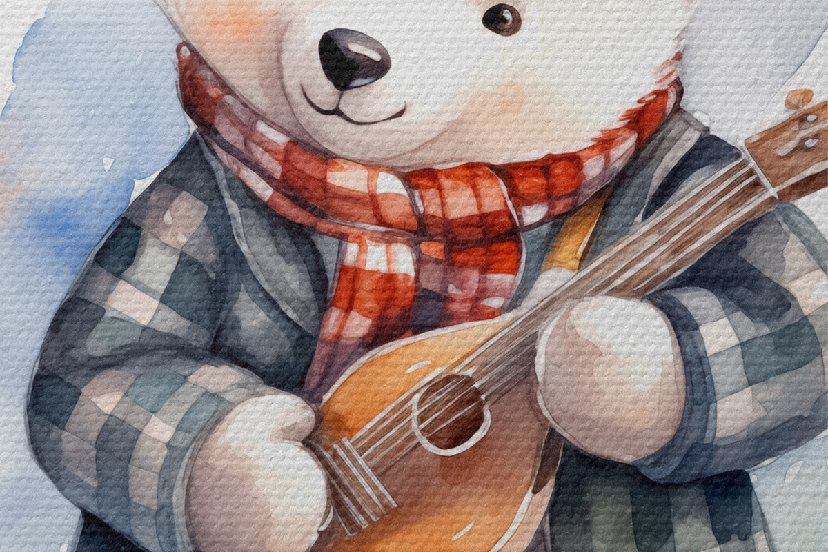 Pilt Siniseruudulises ülikonnas ja punase salliga jääkarumuusik mängib kitarri laste akvarelliillustratsiooni Nr r39120