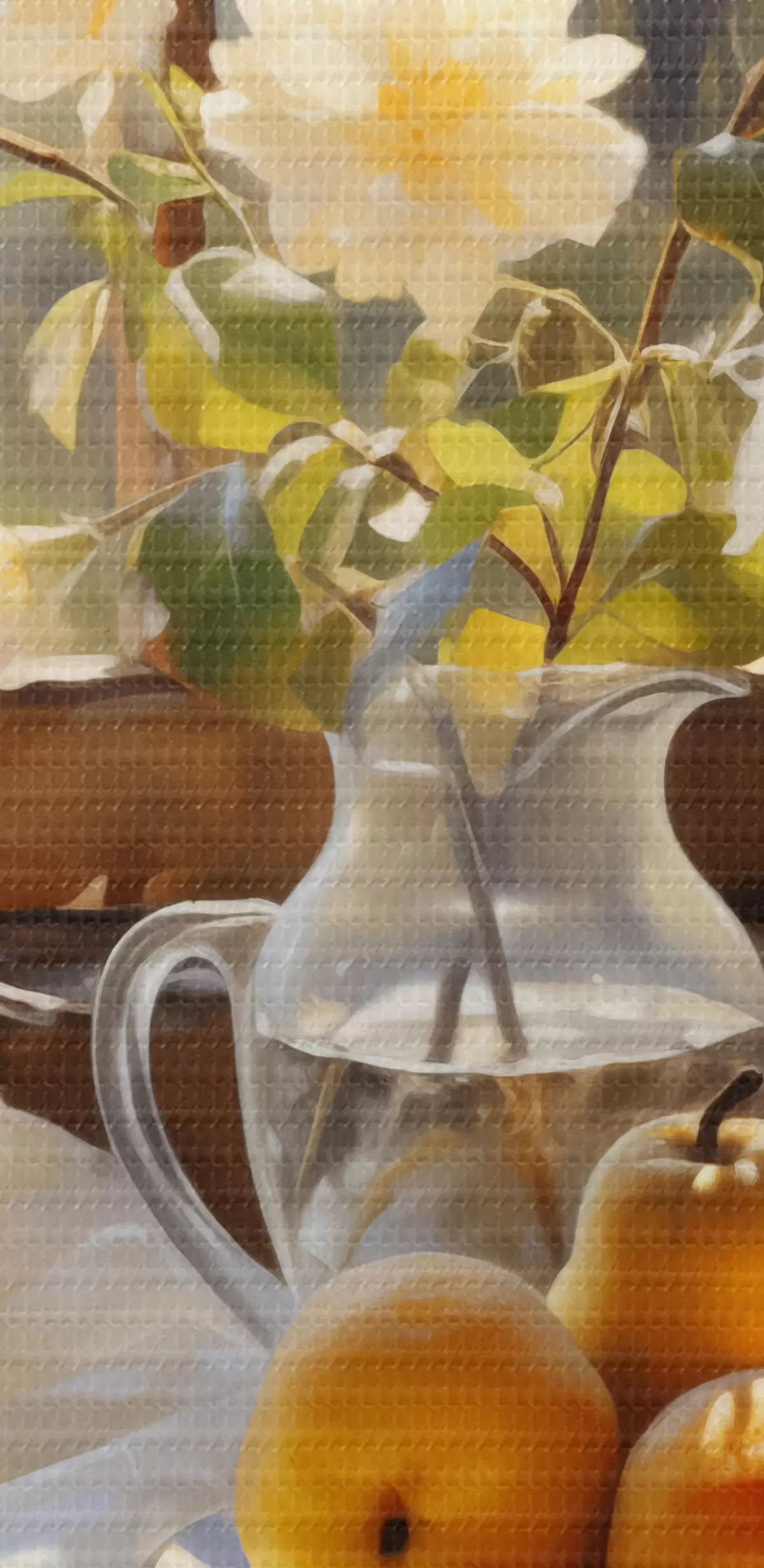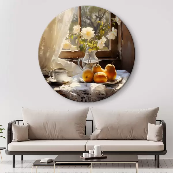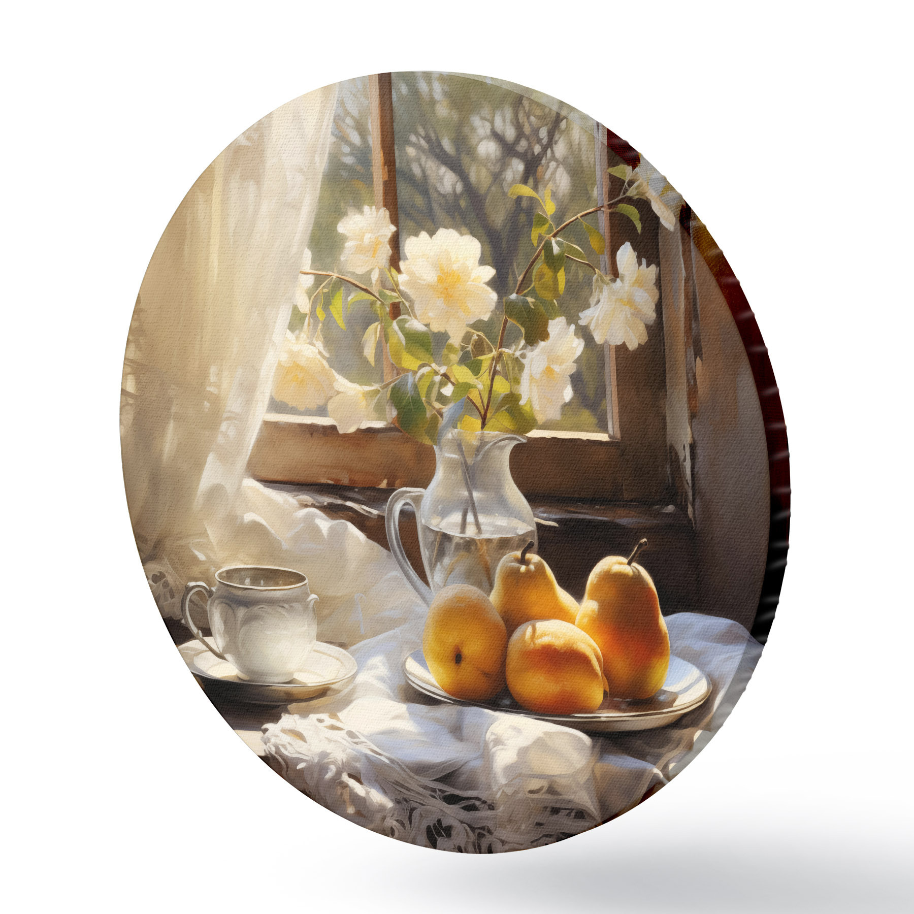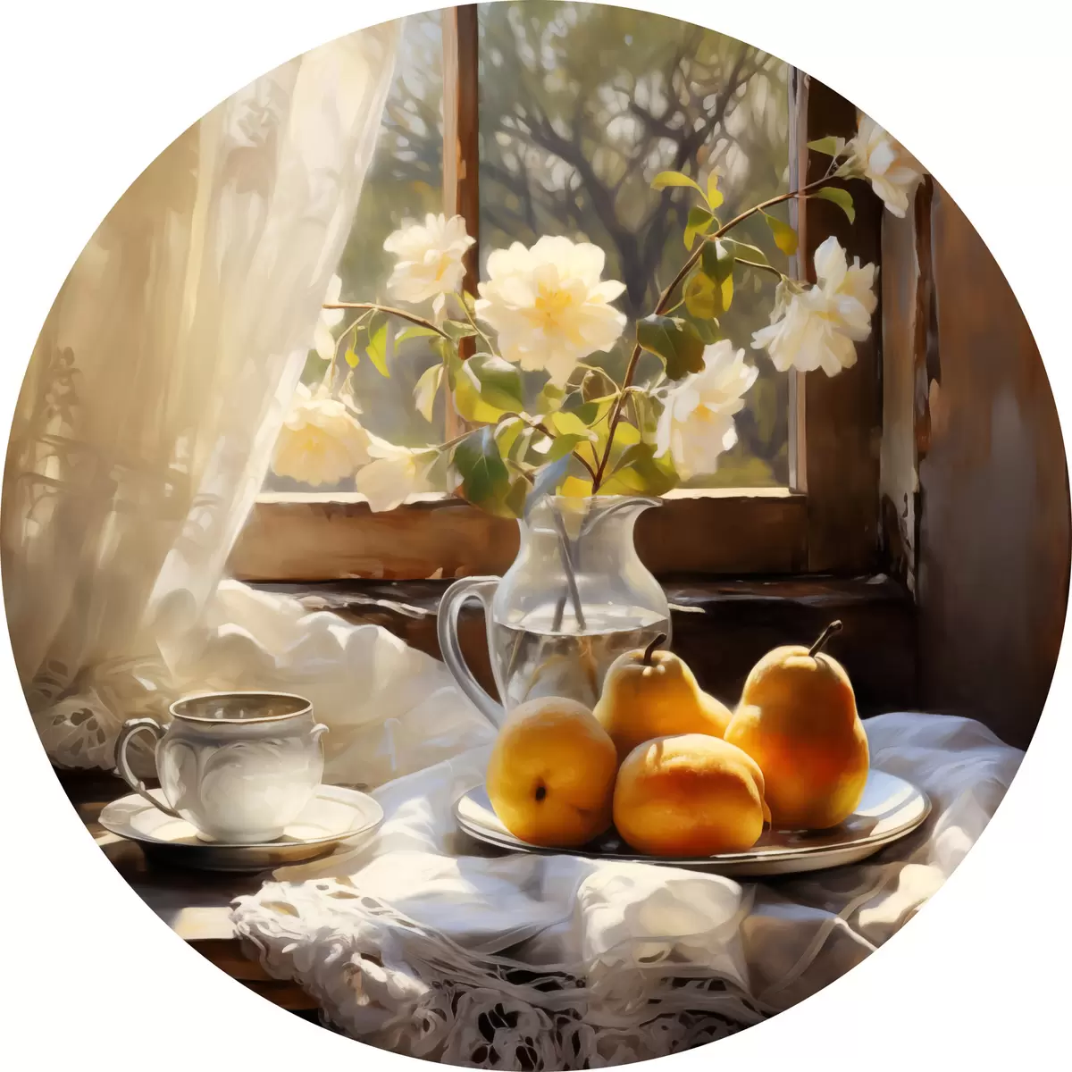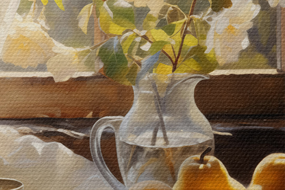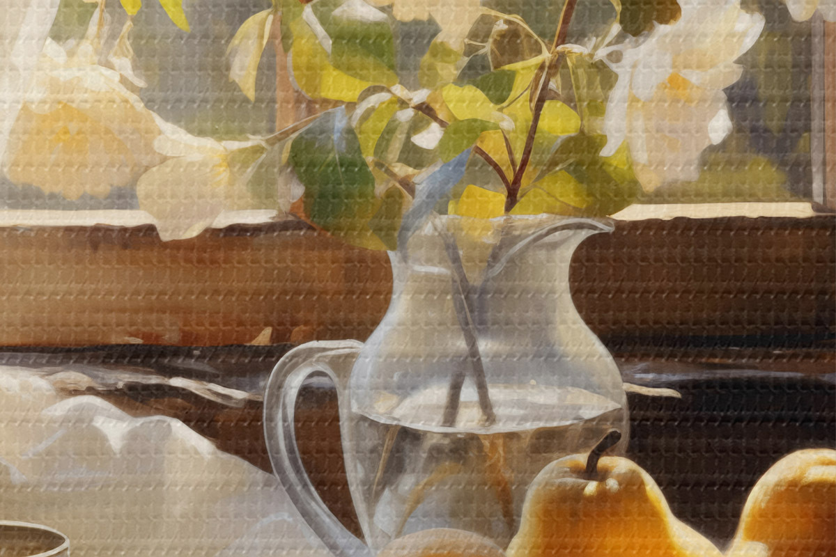 Pilt Rustikaalne natüürmort kollastest küpsetest pirnidest aknaäärsel laual taldrikul, valged roosid klaaskannus, valged pitskardinad Nr r39129