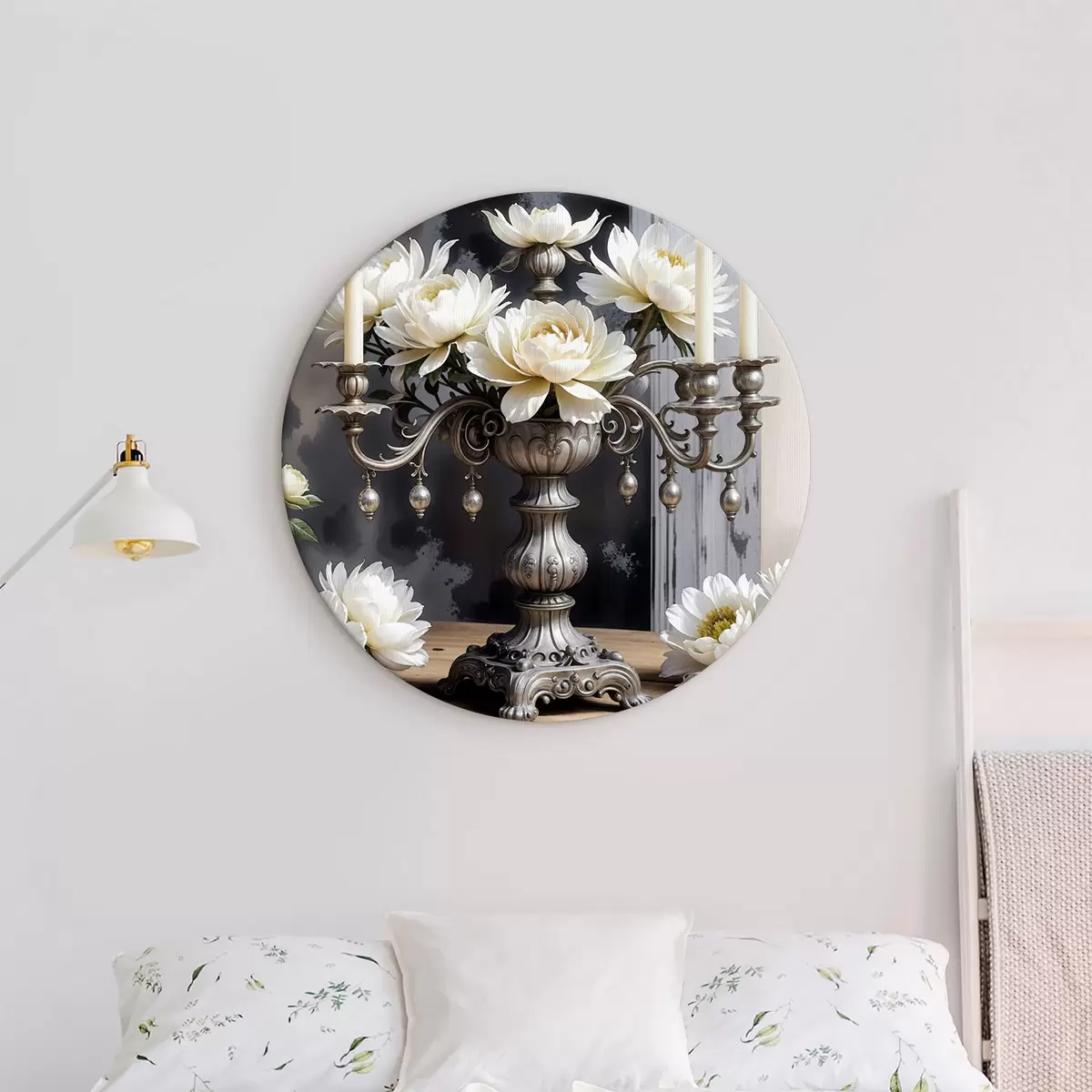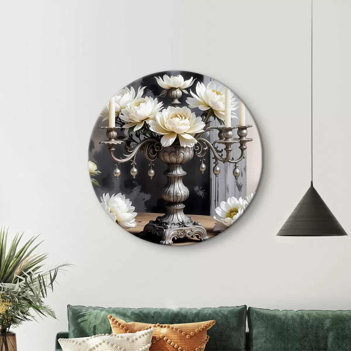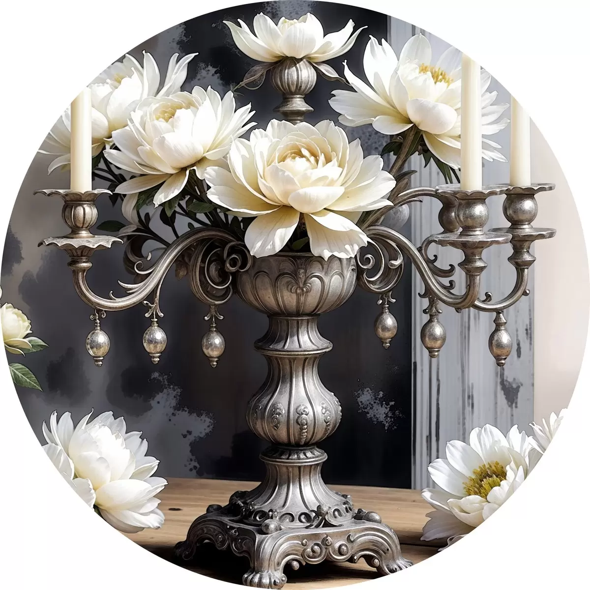 Pilt Suurte valgete daaliate lillekimp ehitud hõbedases vaasis, mida ümbritsevad süüdatud küünlad puidust laual Nr r39384