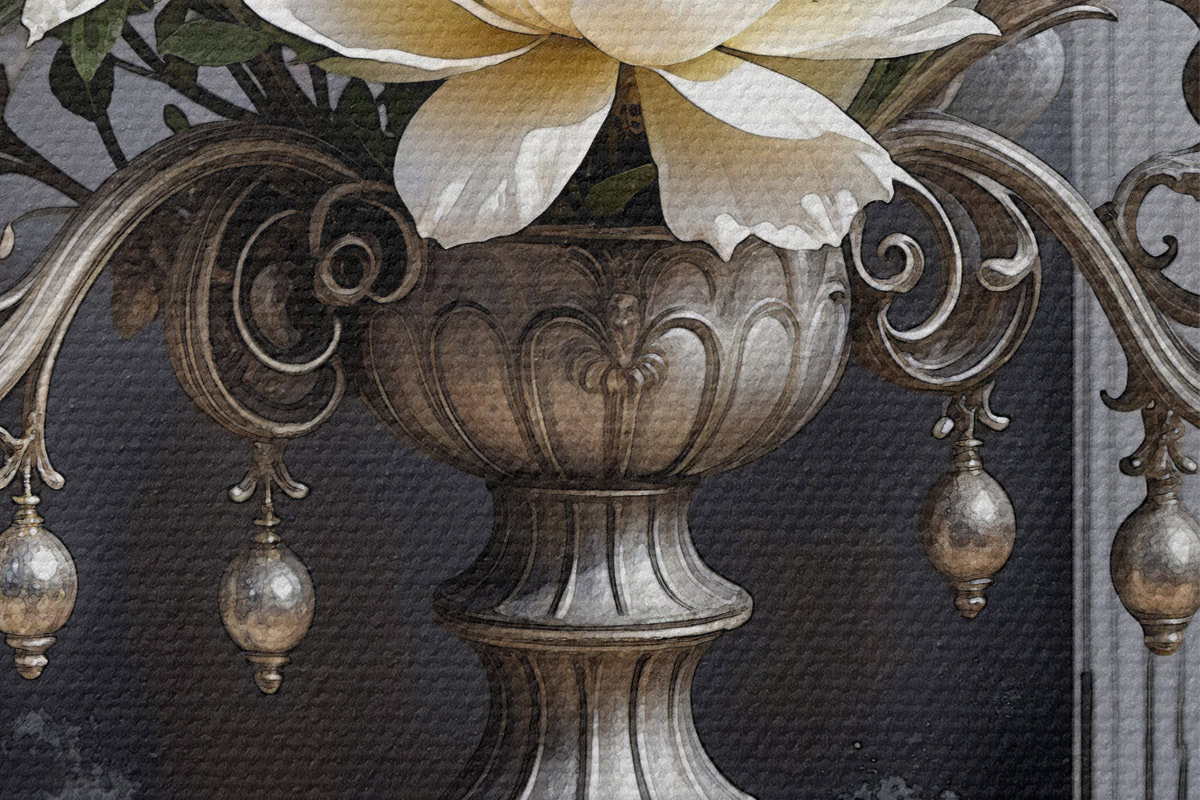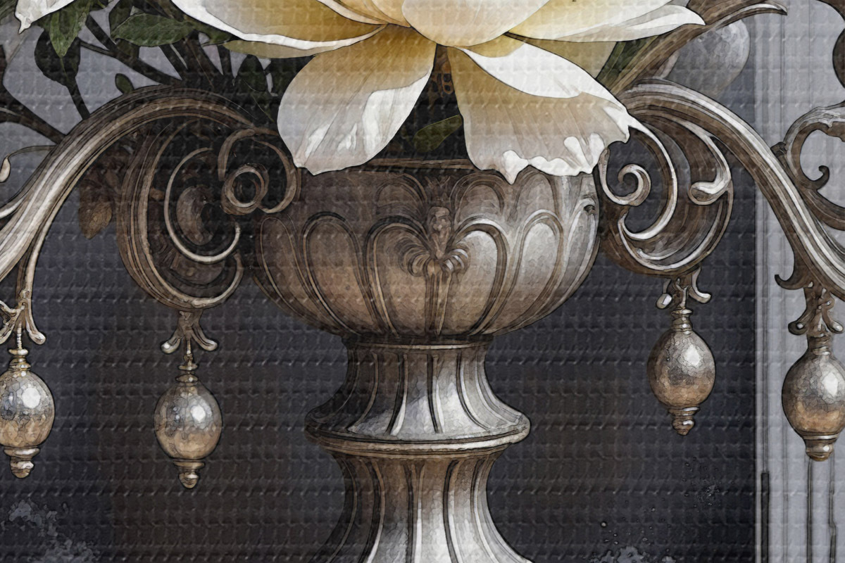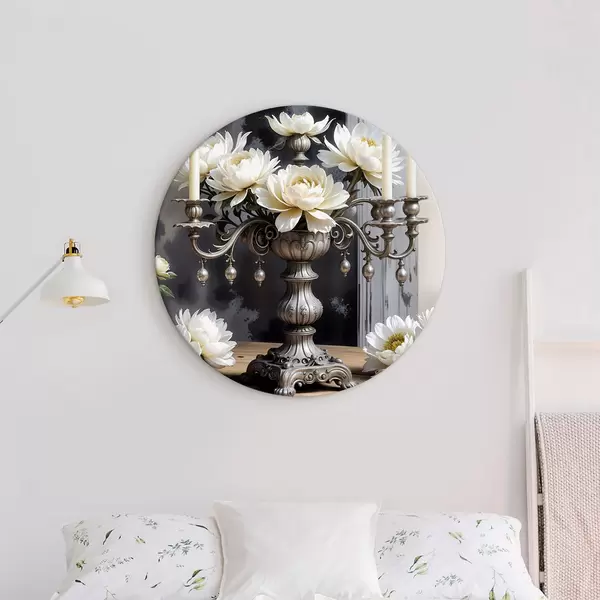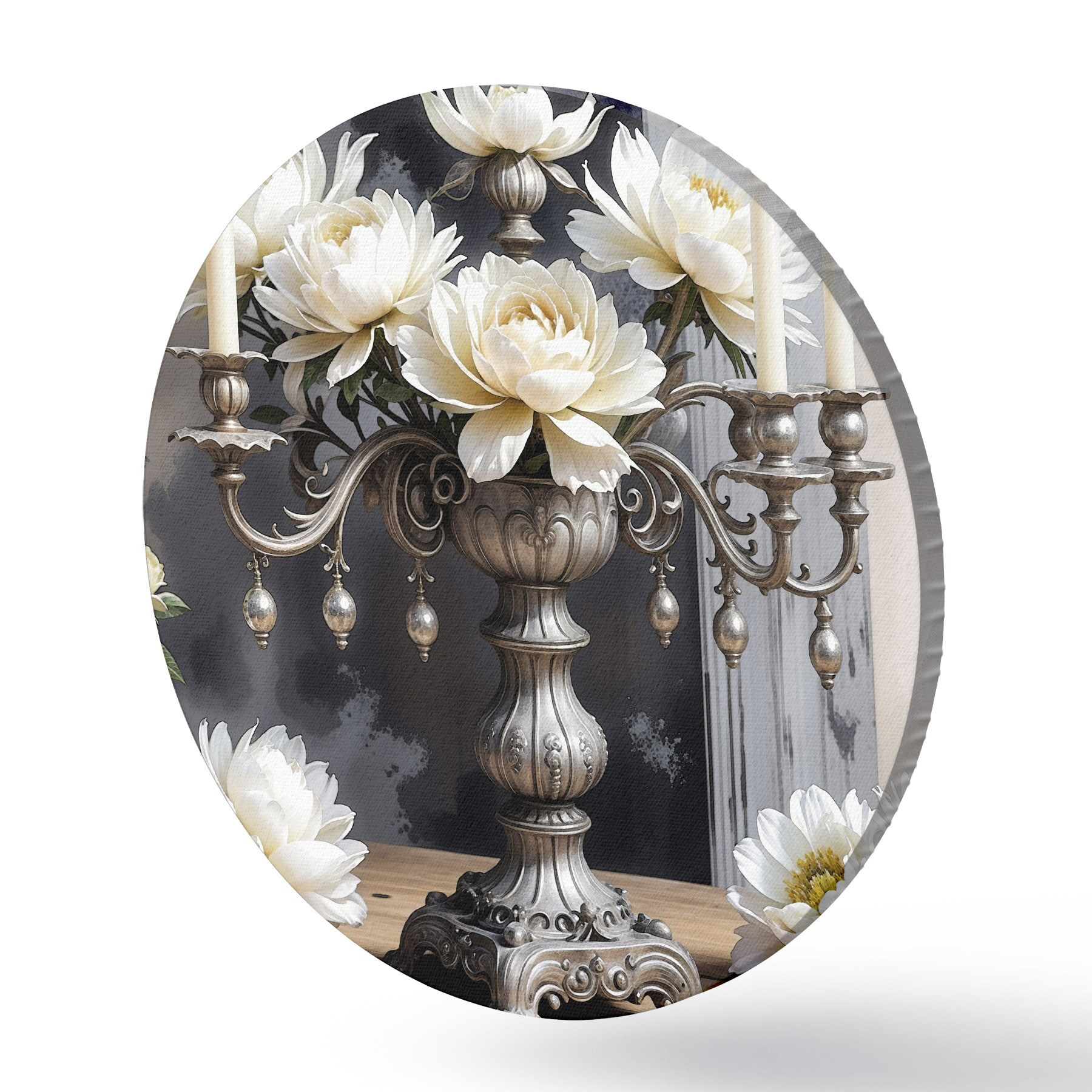 Pilt Suurte valgete daaliate lillekimp ehitud hõbedases vaasis, mida ümbritsevad süüdatud küünlad puidust laual Nr r39384