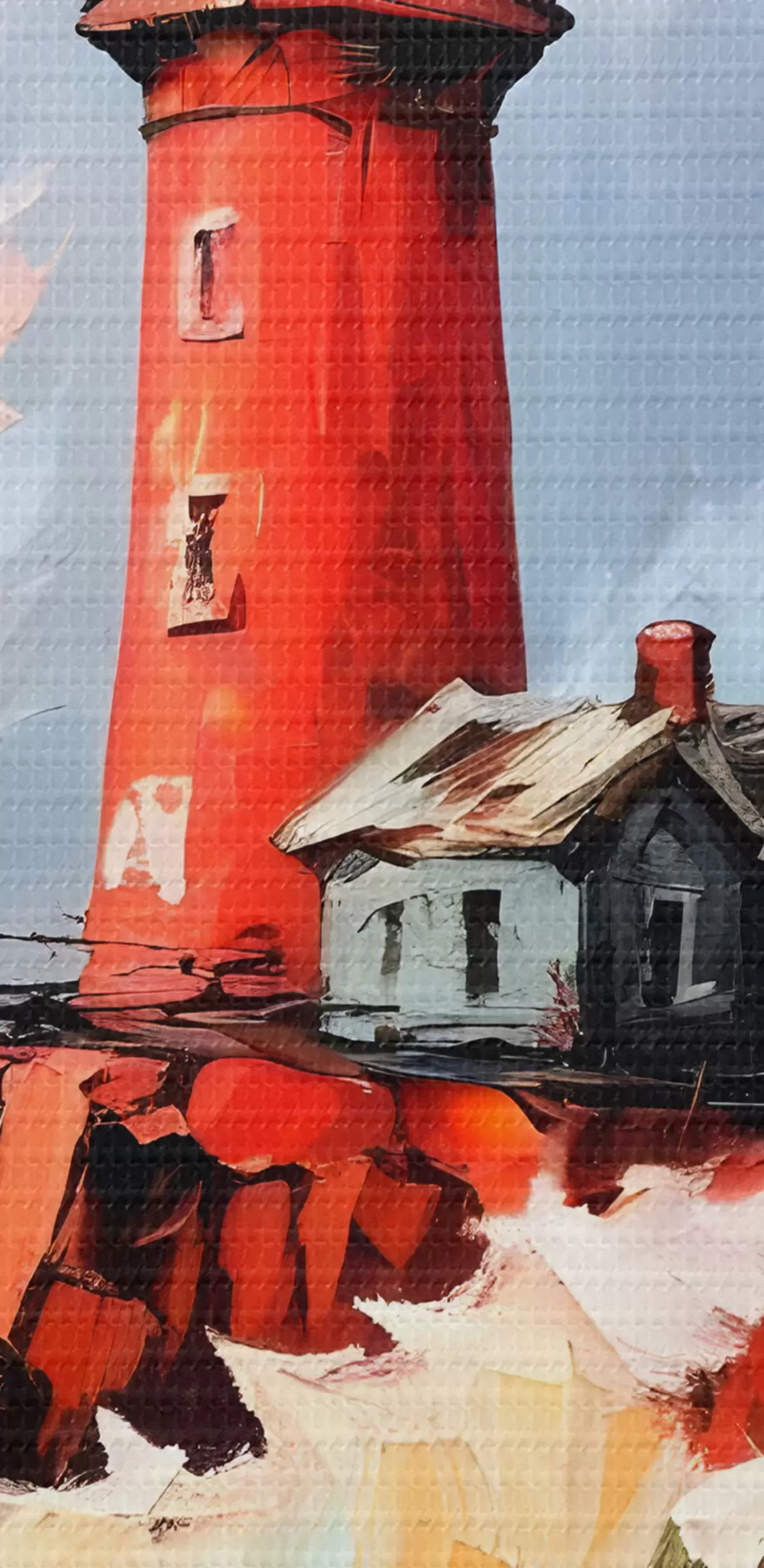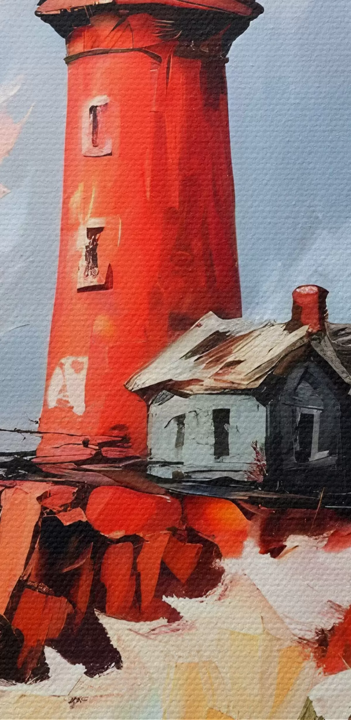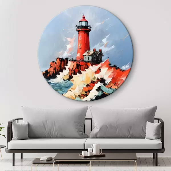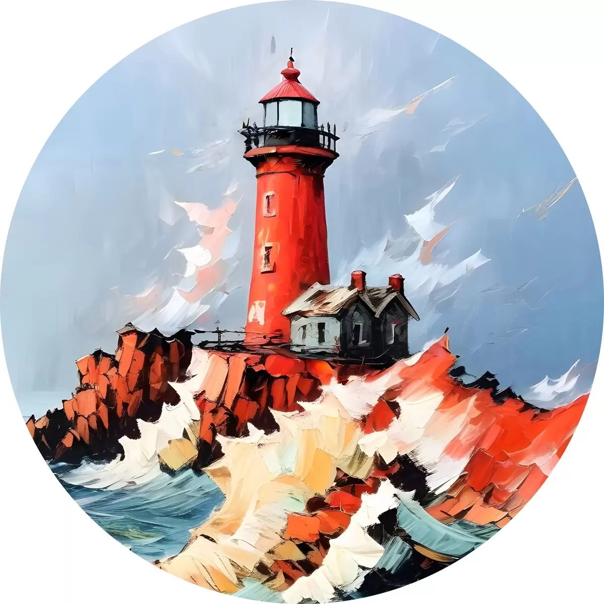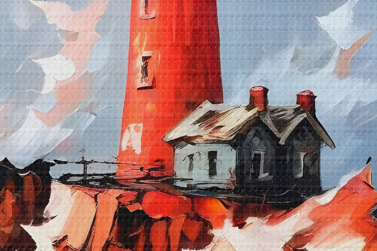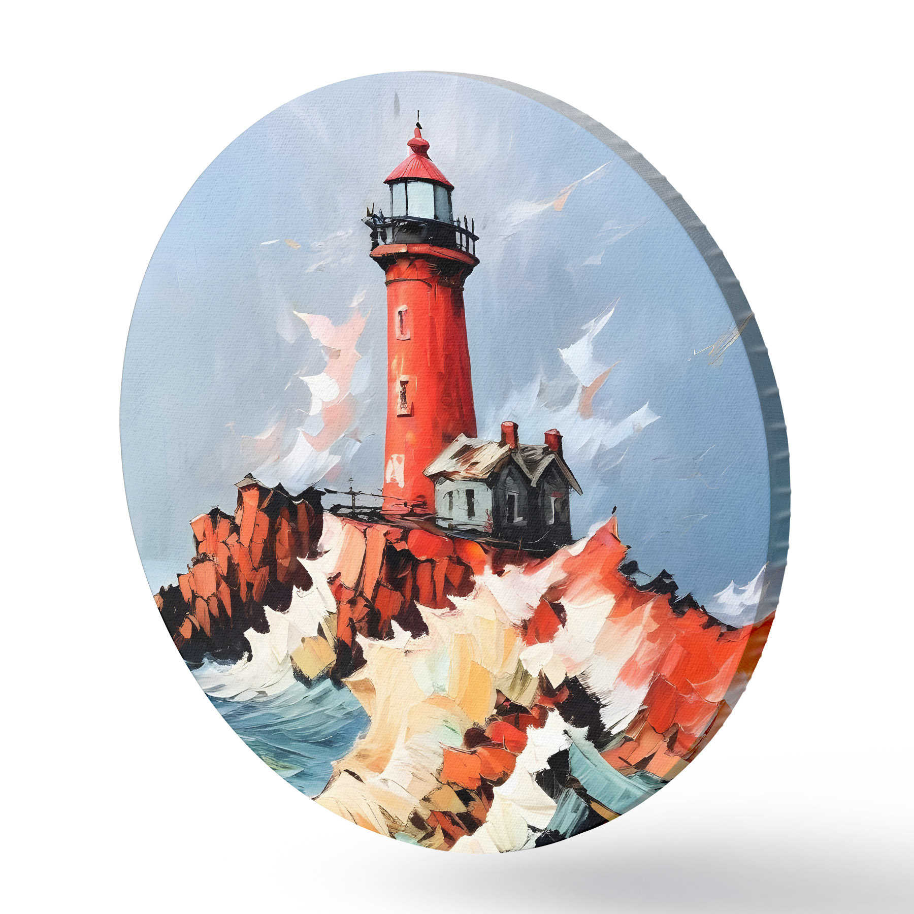 Pilt Maal punasest tuletornist, mis seisab kõrgel kivisel kaljul, ümbritsetud lainete ja tormise taevaga Nr r39392