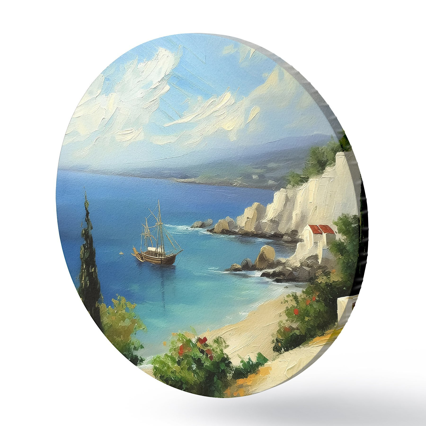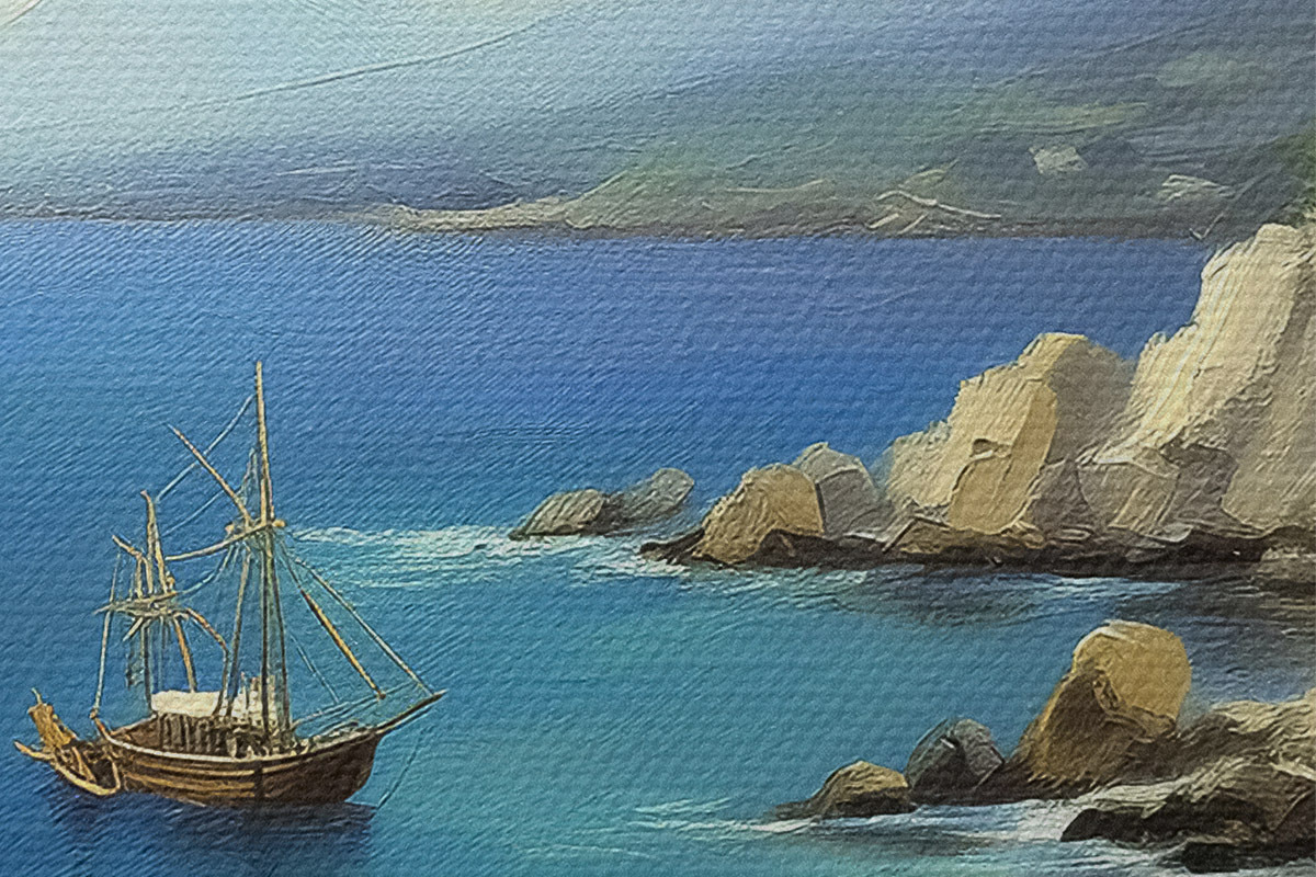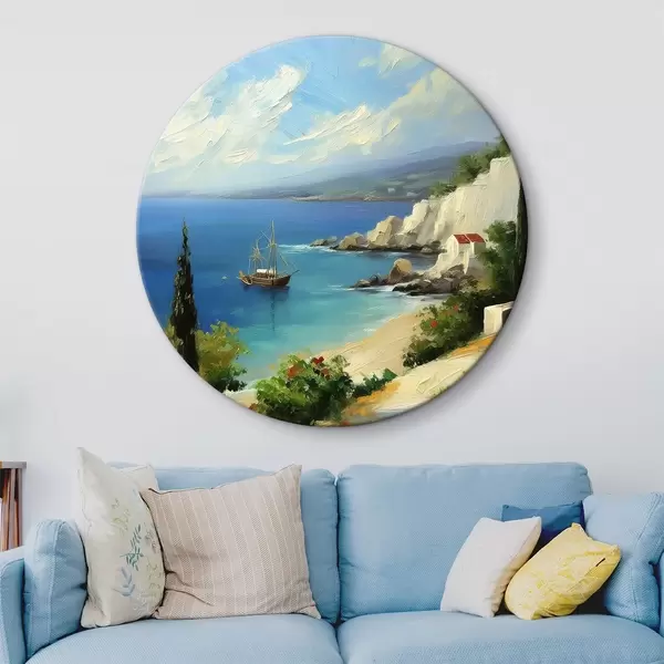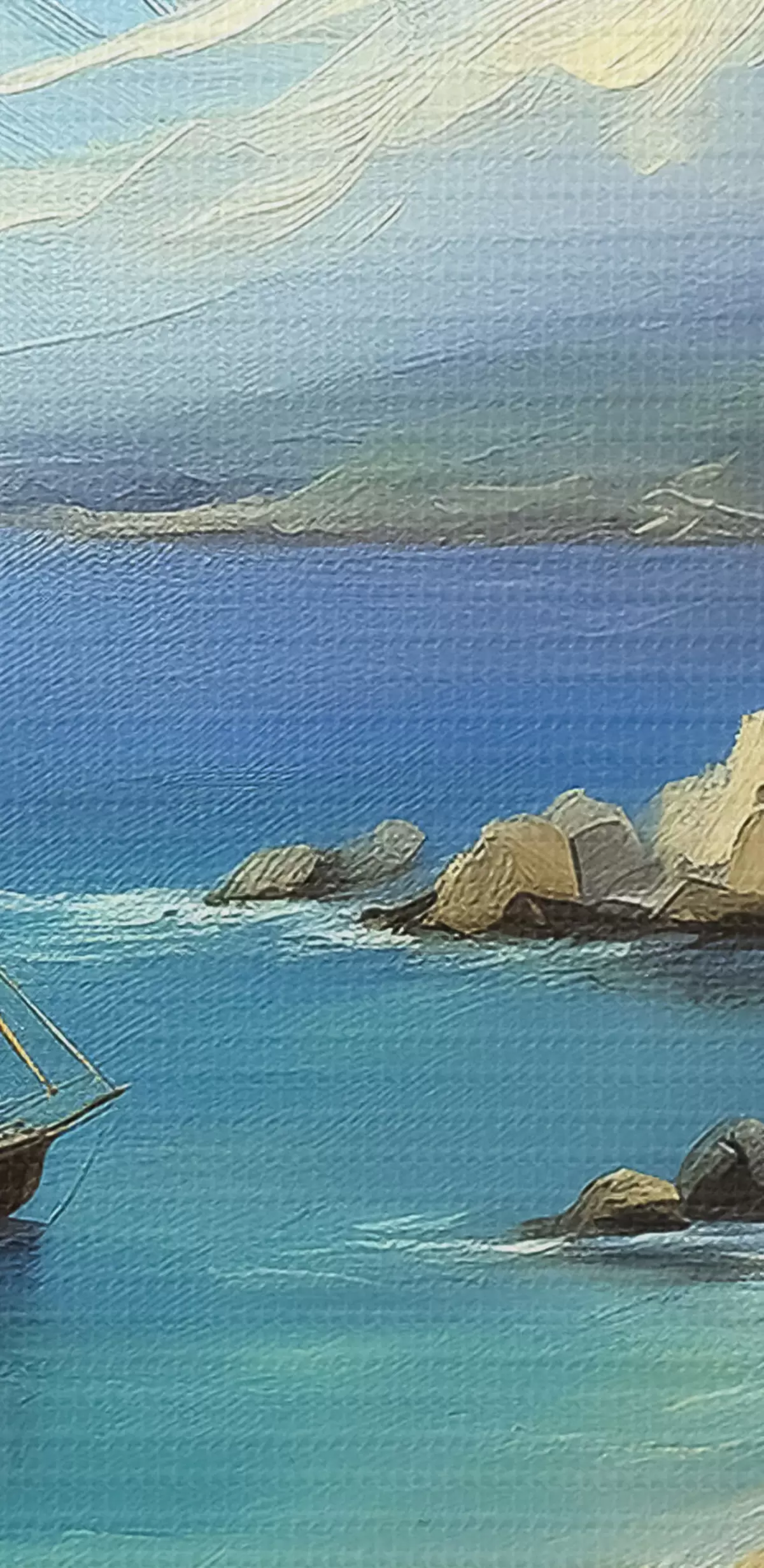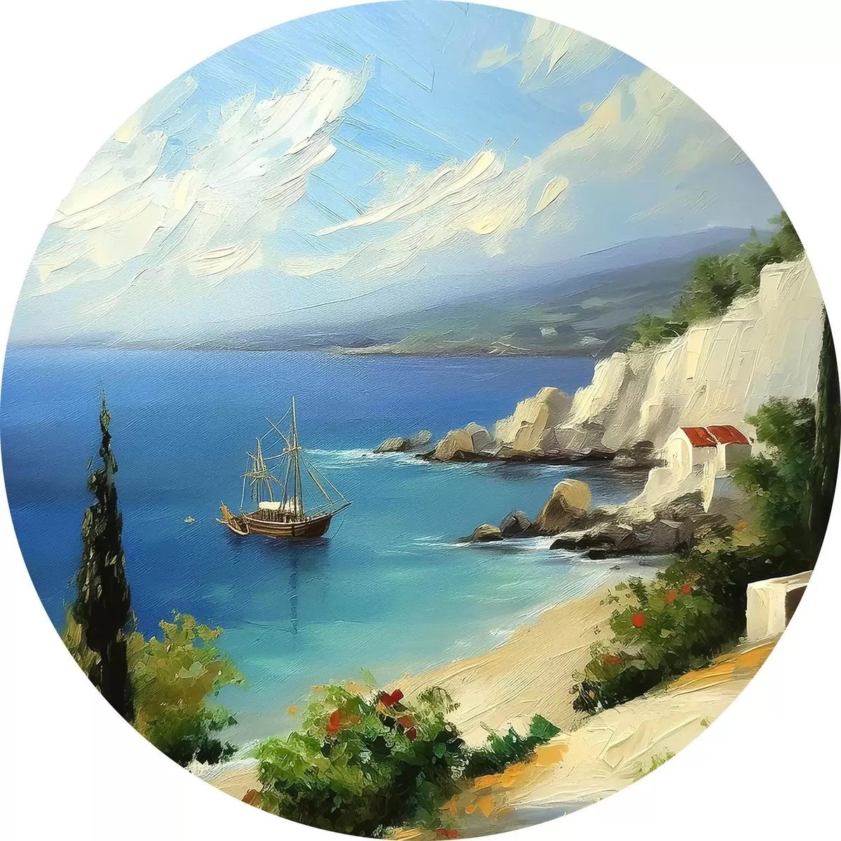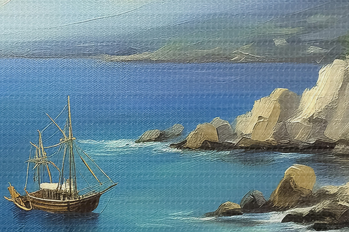 Pilt Kreeka mererannik, laev, sinine vesi, õlimaal, suvine loodus, kivid, erksad pintslitõmbed Nr r39425