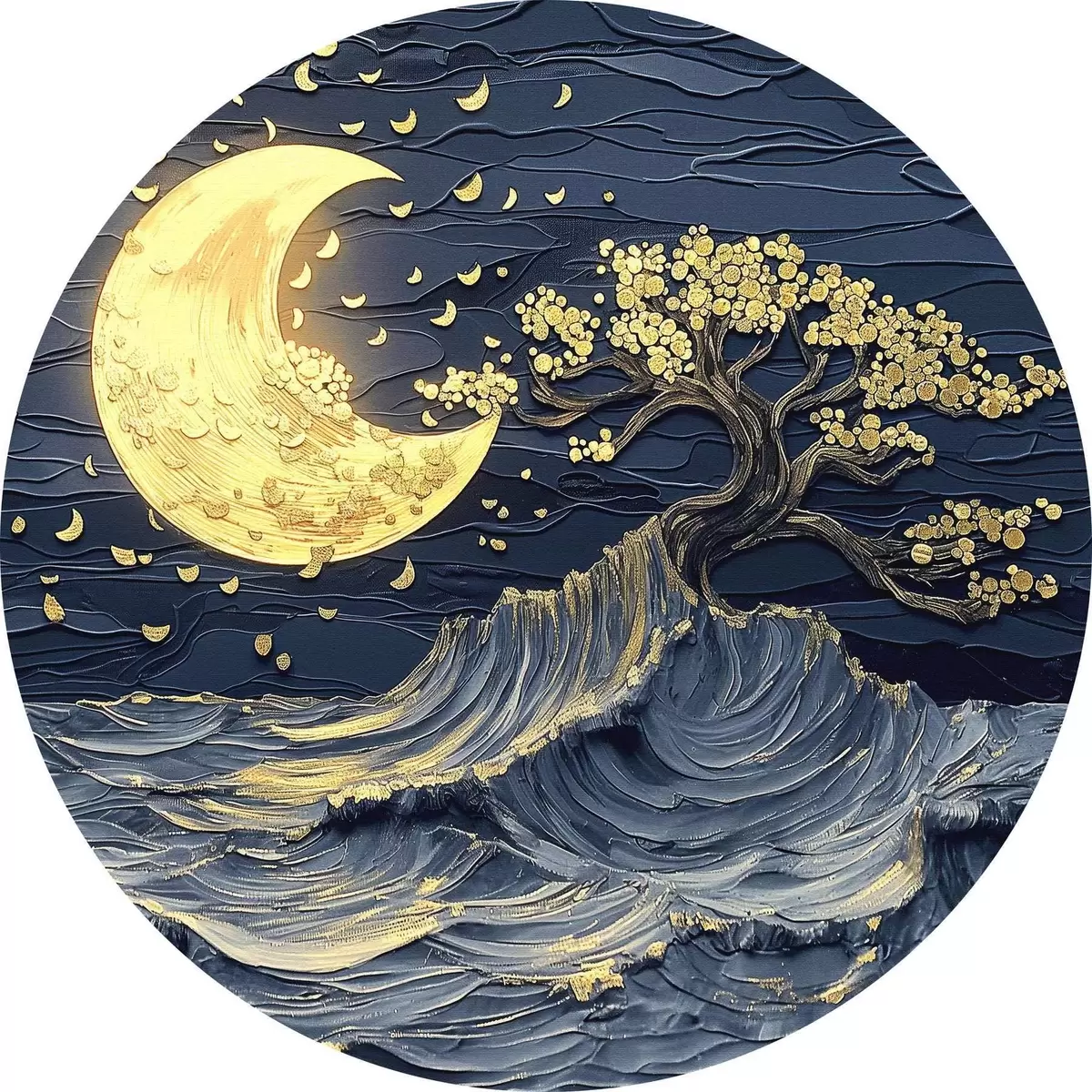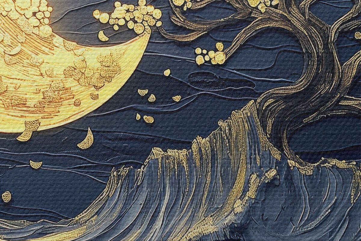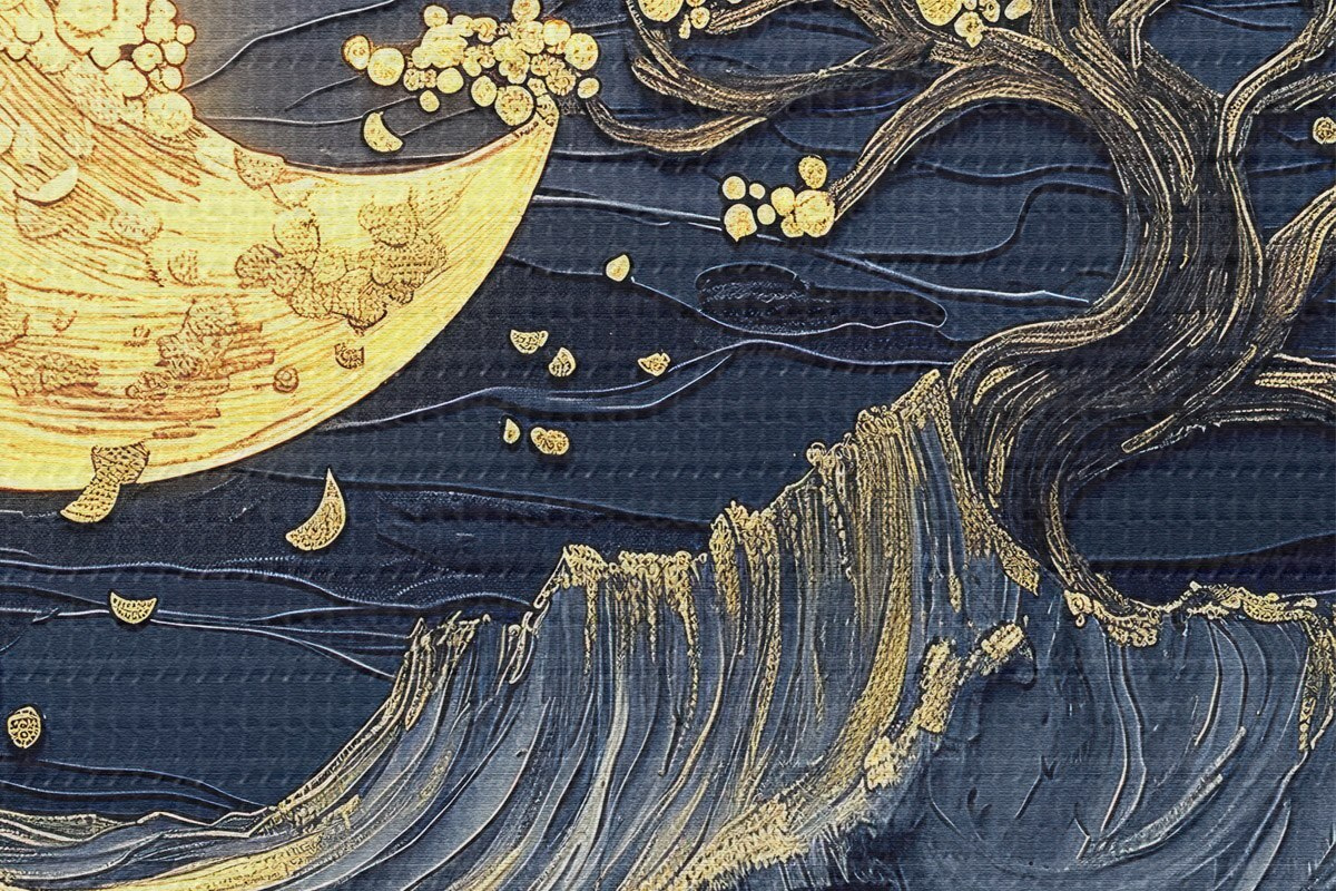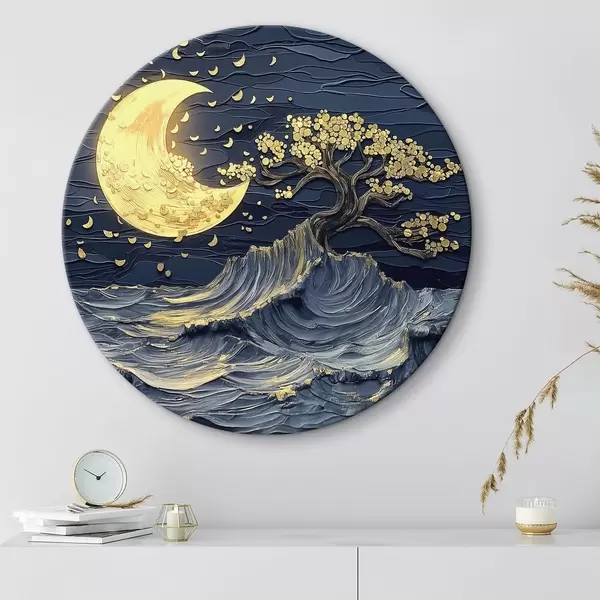 Pilt Akrüülmaal: romantiline meremaastik langenud lehtede ja kuuvalguse peegeldustega Nr r39449
