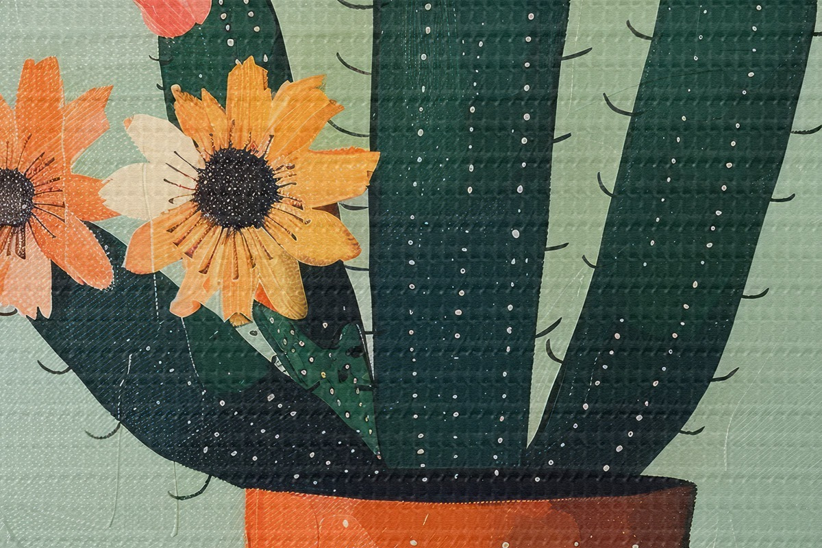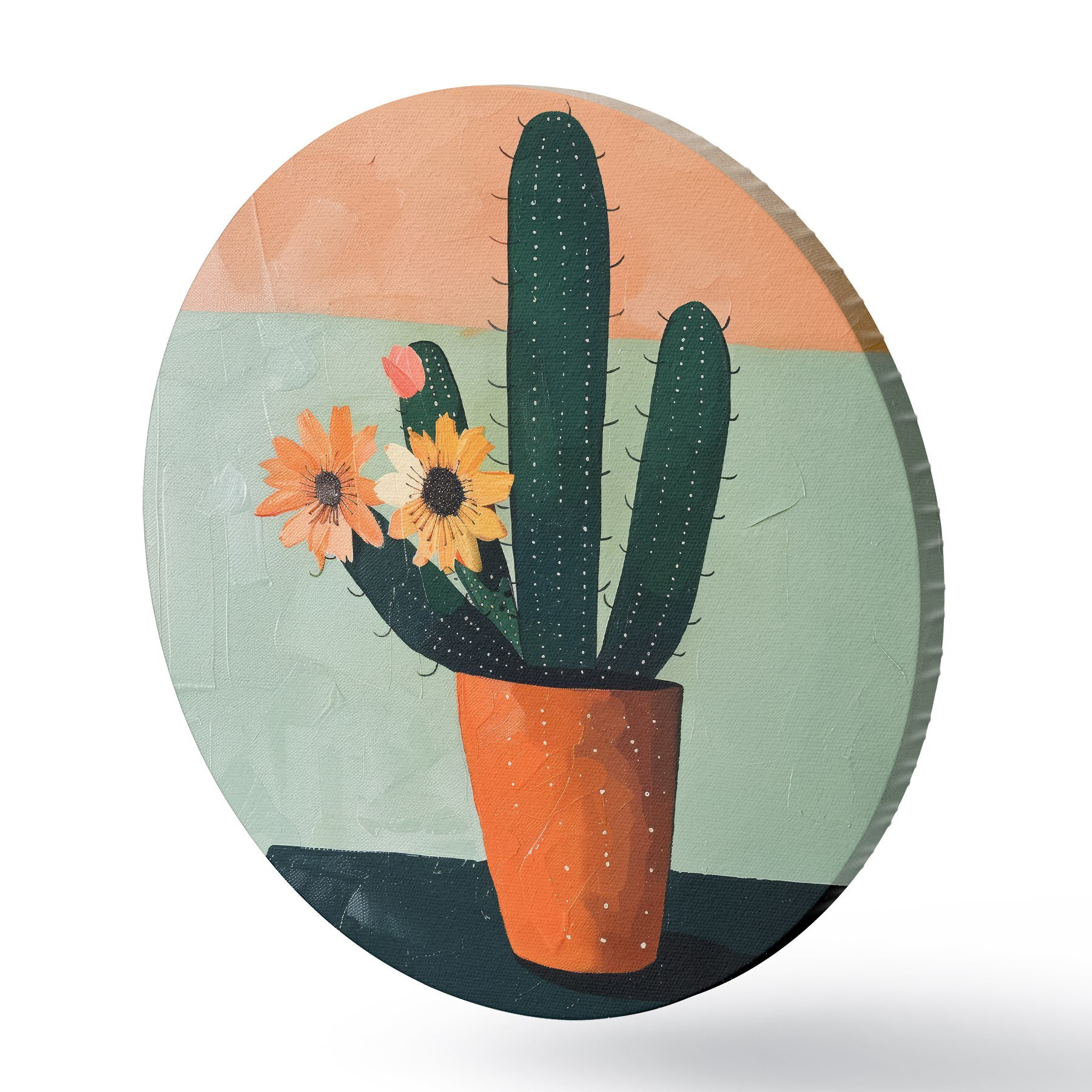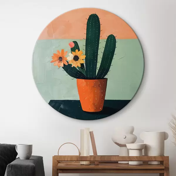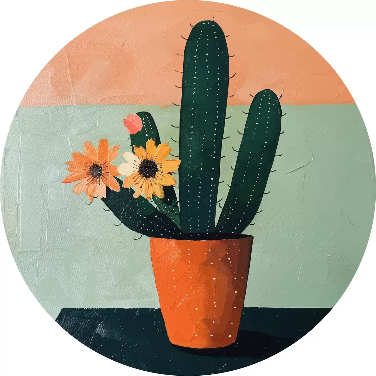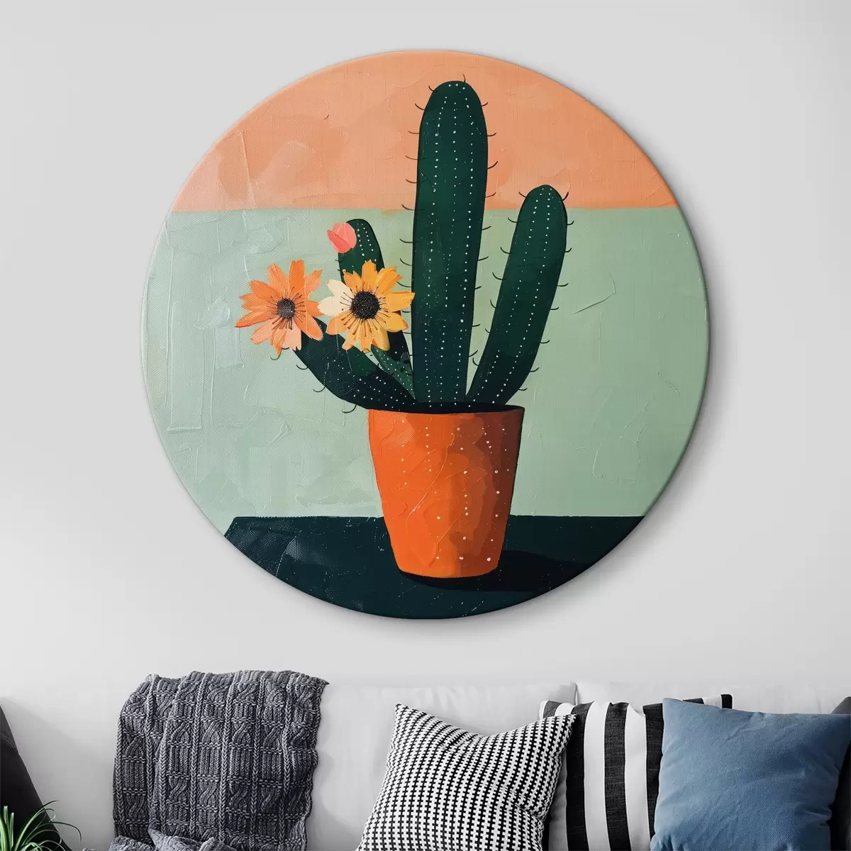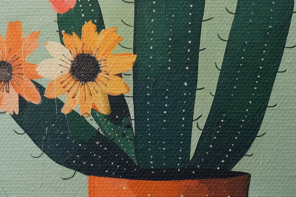 Pilt Minimalistlik maal ühest kaktusest julges värvipaletis lilledega. Nr r39452