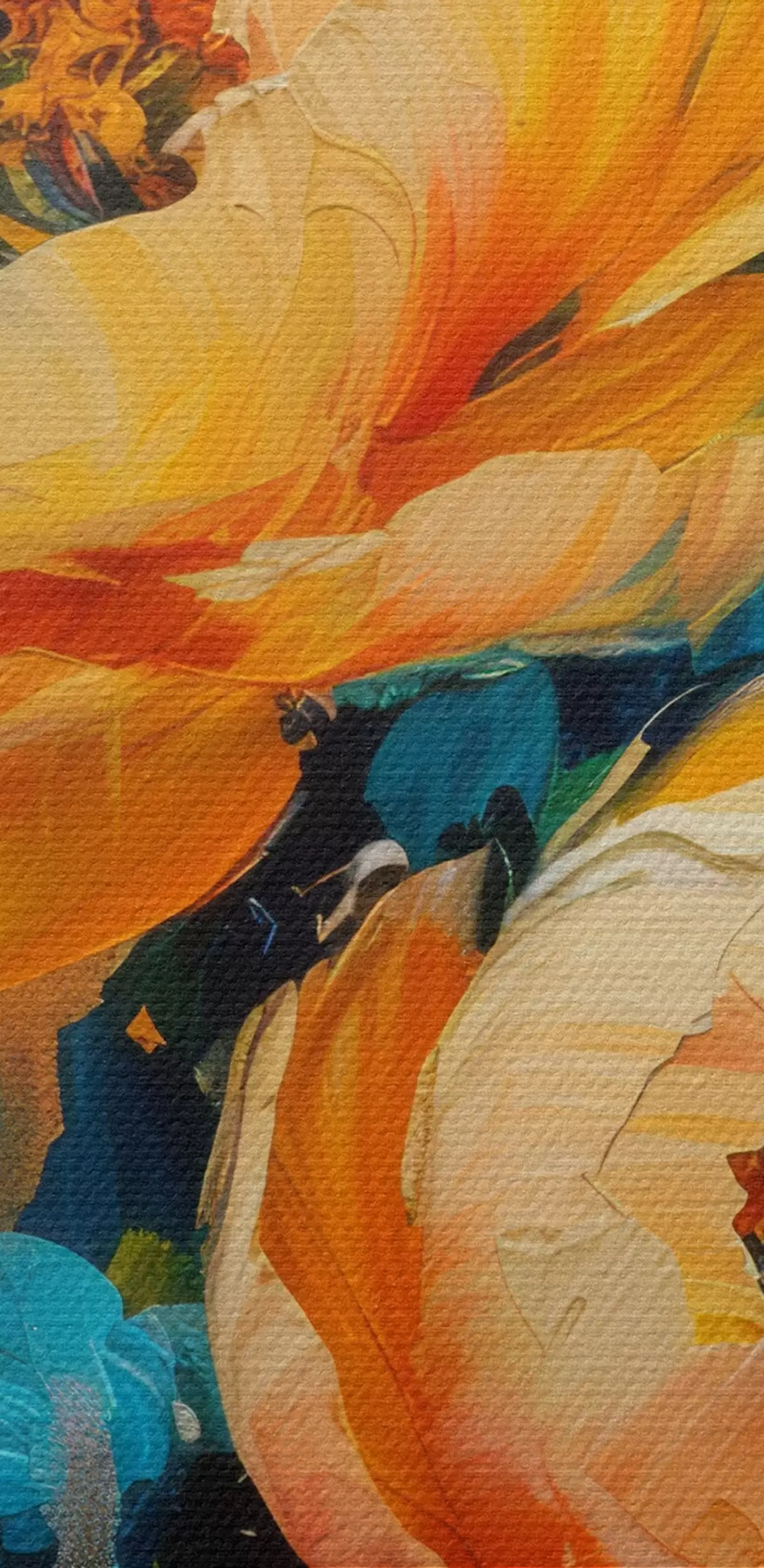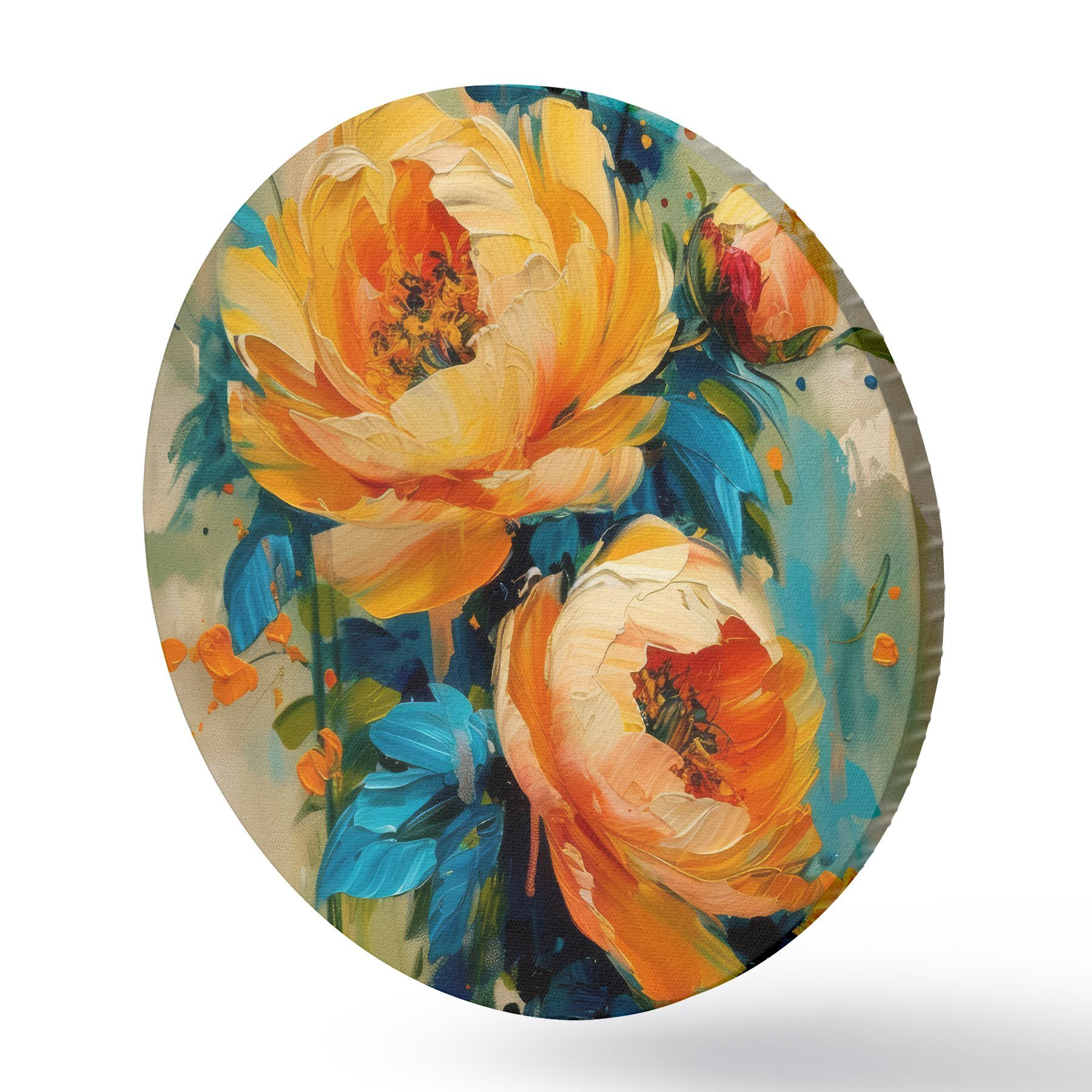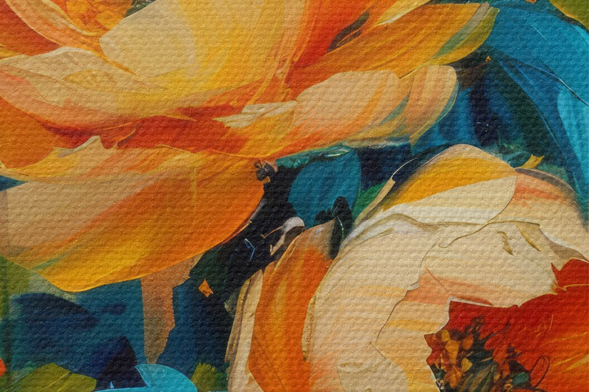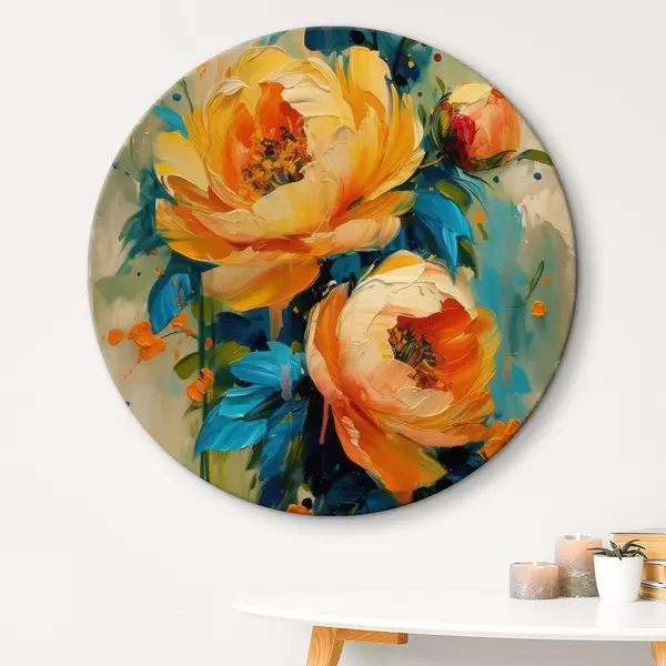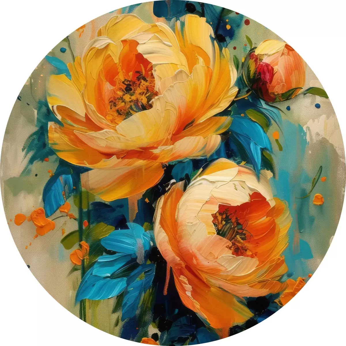 Pilt Abstraktne maal beežides, kollastes, sinistes, salveirohelistes toonides oranžide pritsmetega, suvel särtsakad pojengid Nr r39472