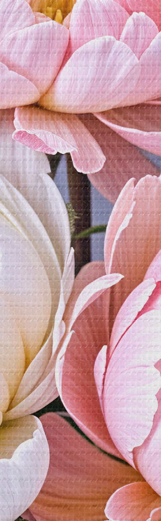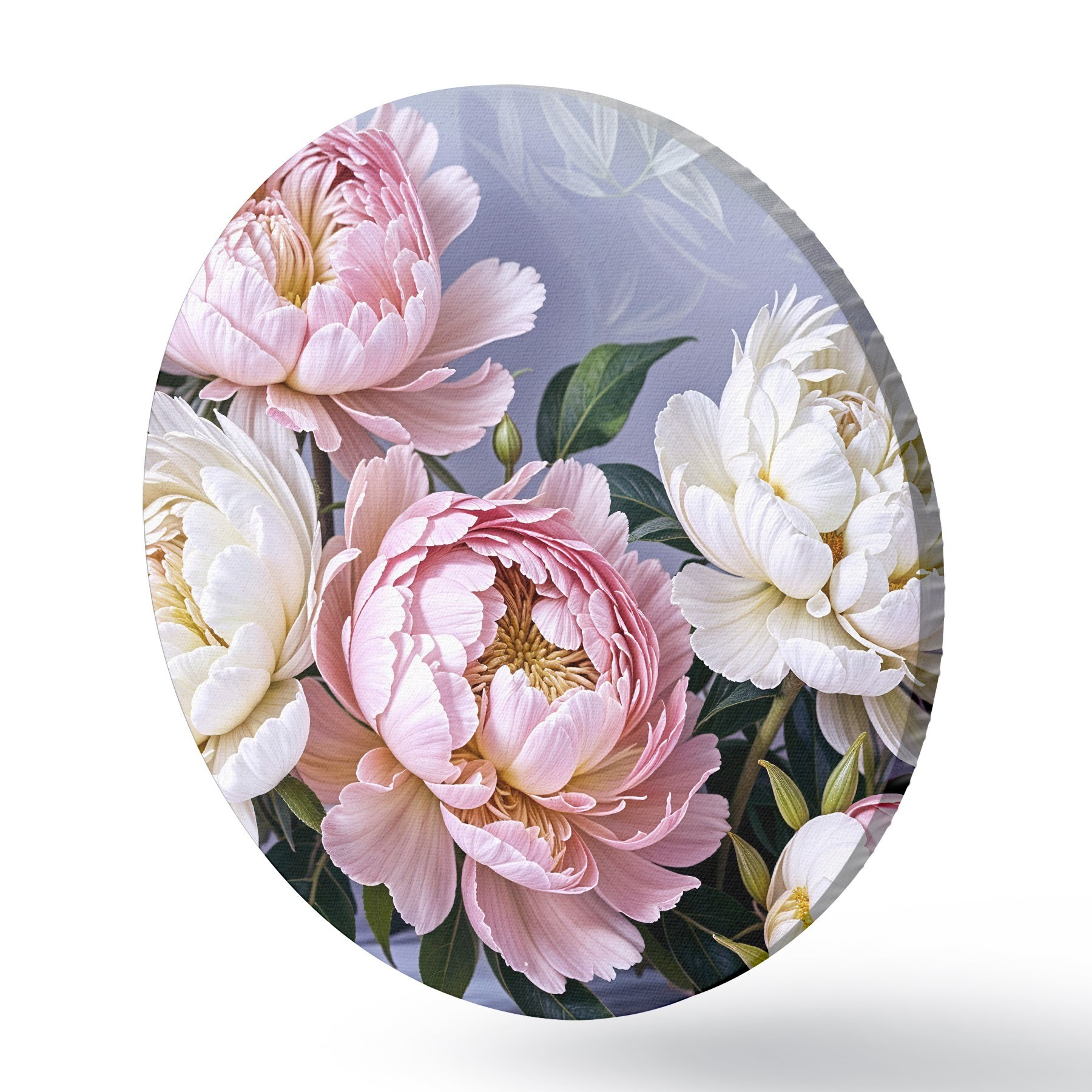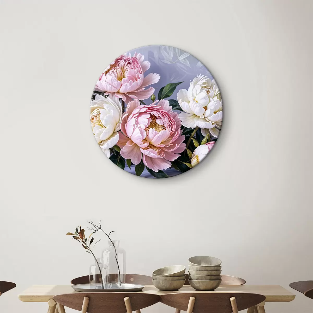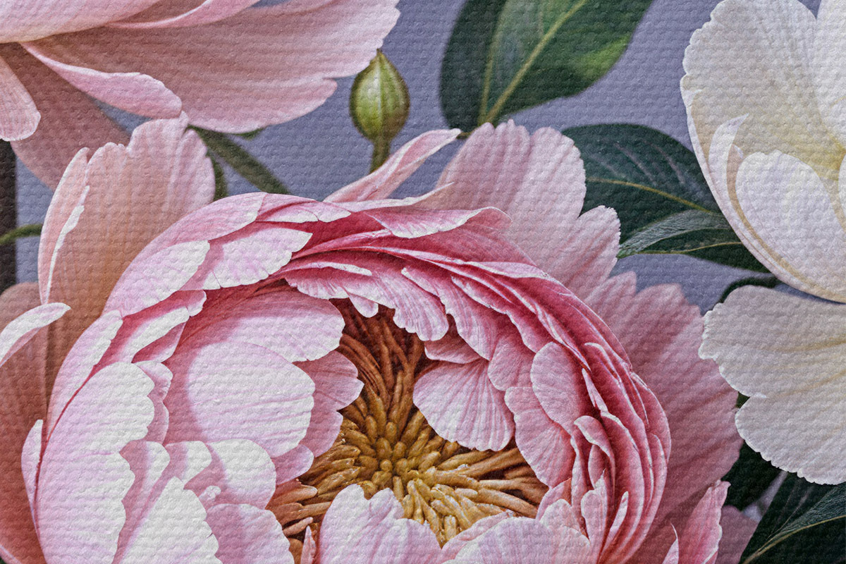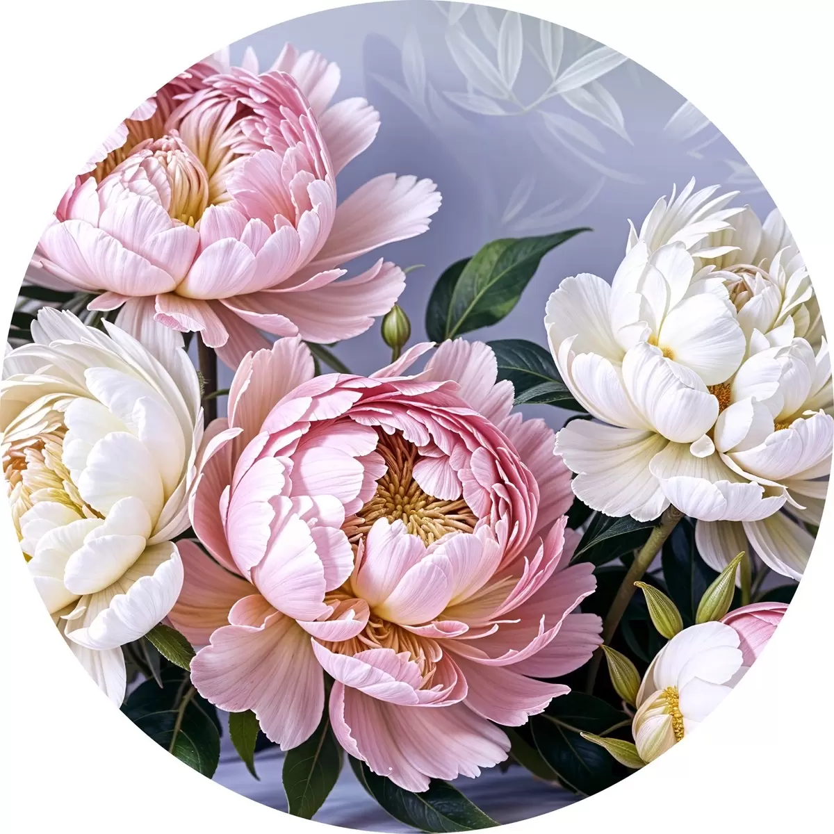 Pilt Suurte, lopsakate roosade ja valgete pojengiõite kimp roheliste lehtedega pehmel udusel taustal Nr r39514