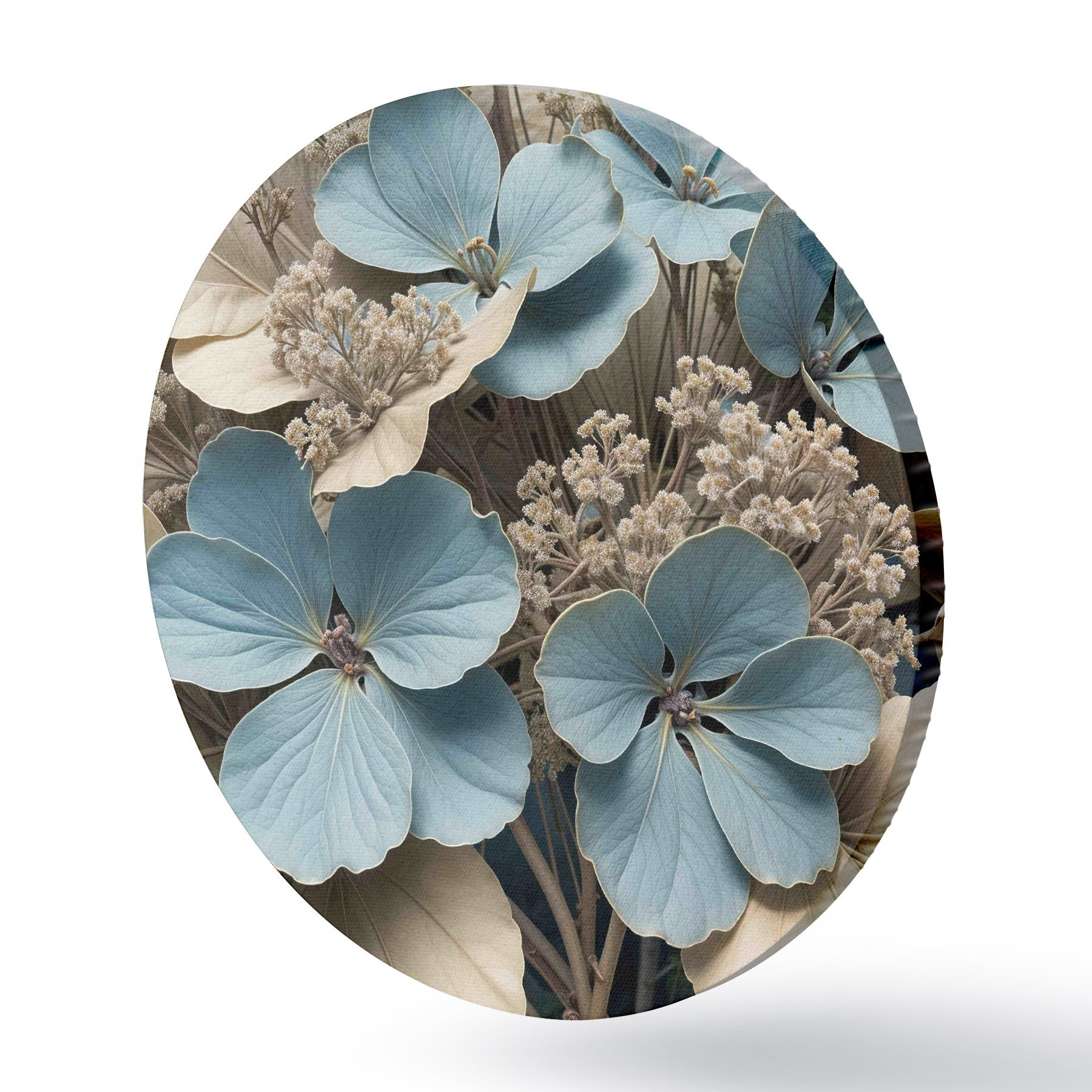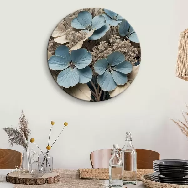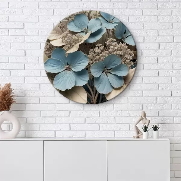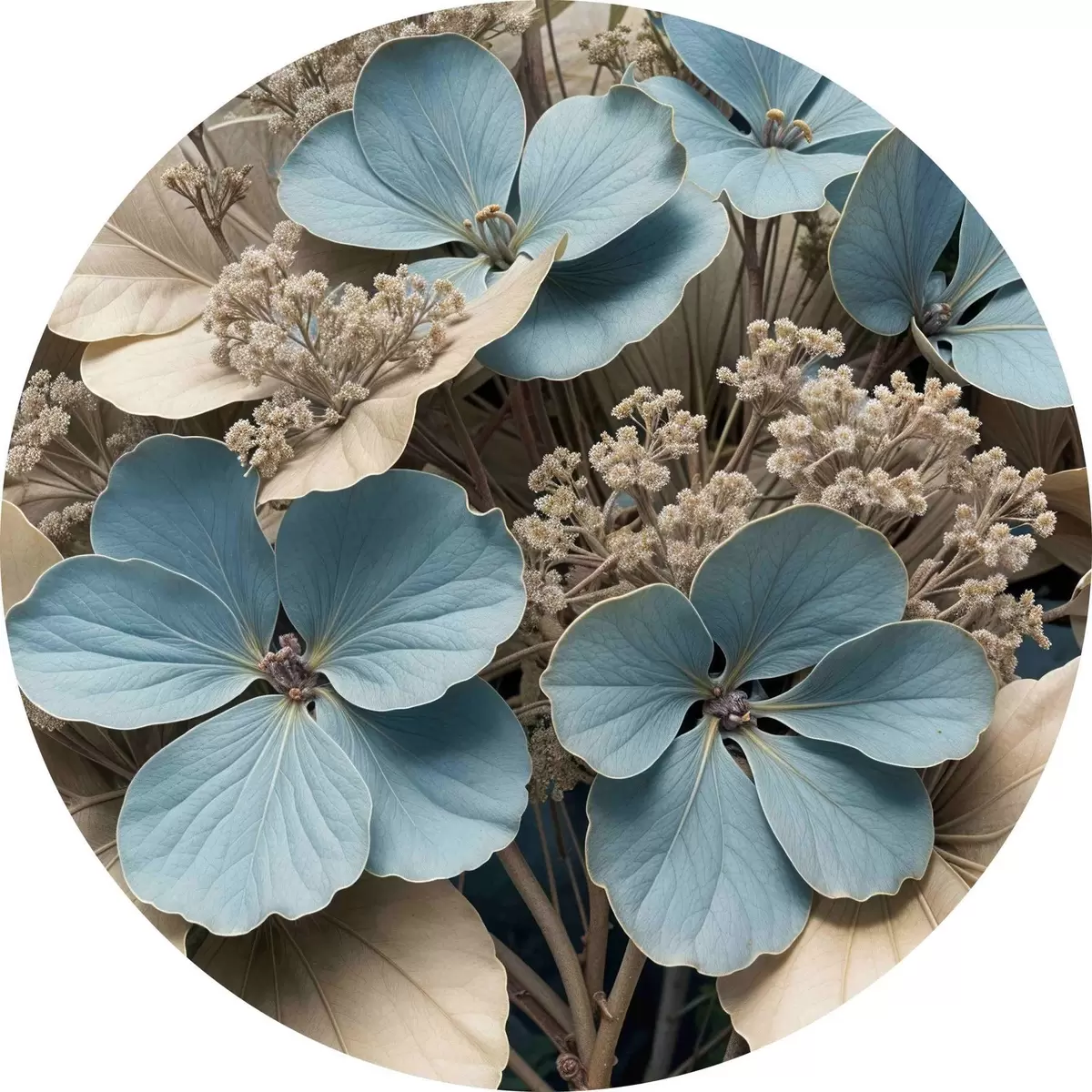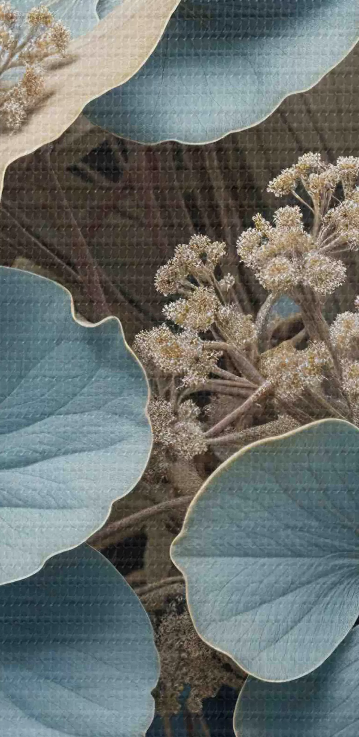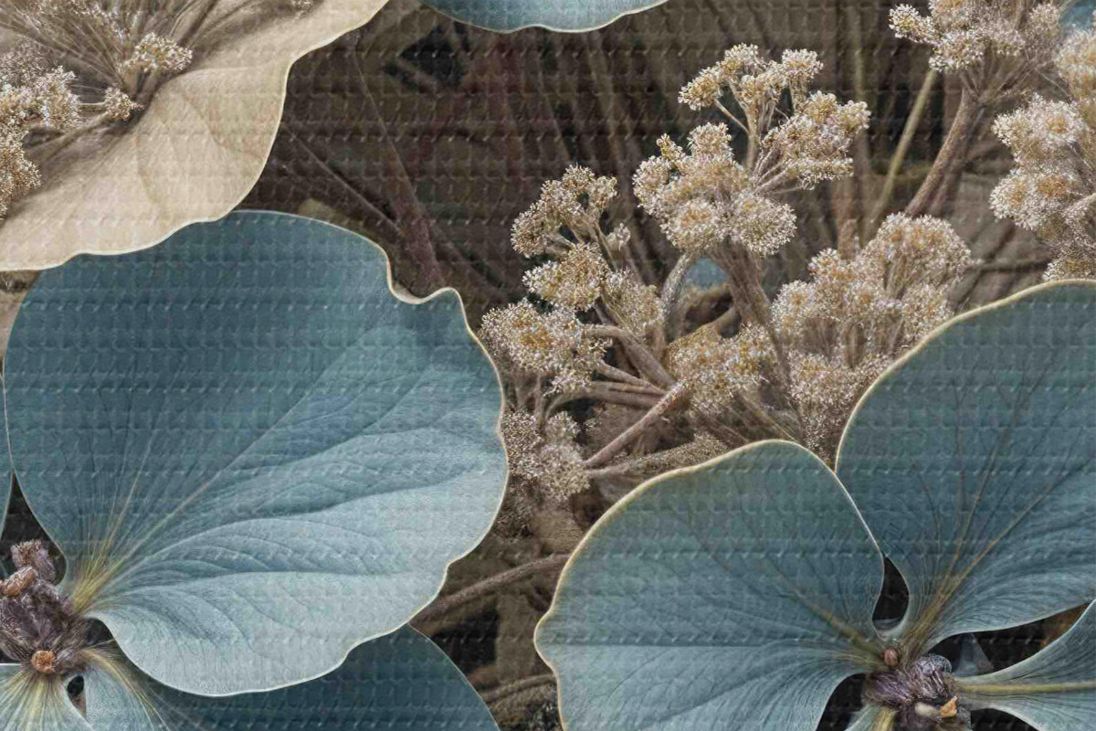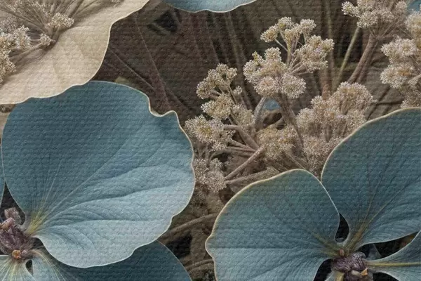 Pilt Lähivõtte sinistest ja valgetest lilledest, mille õied on pehmed ja ähmased, pruunil taustal Nr r39517