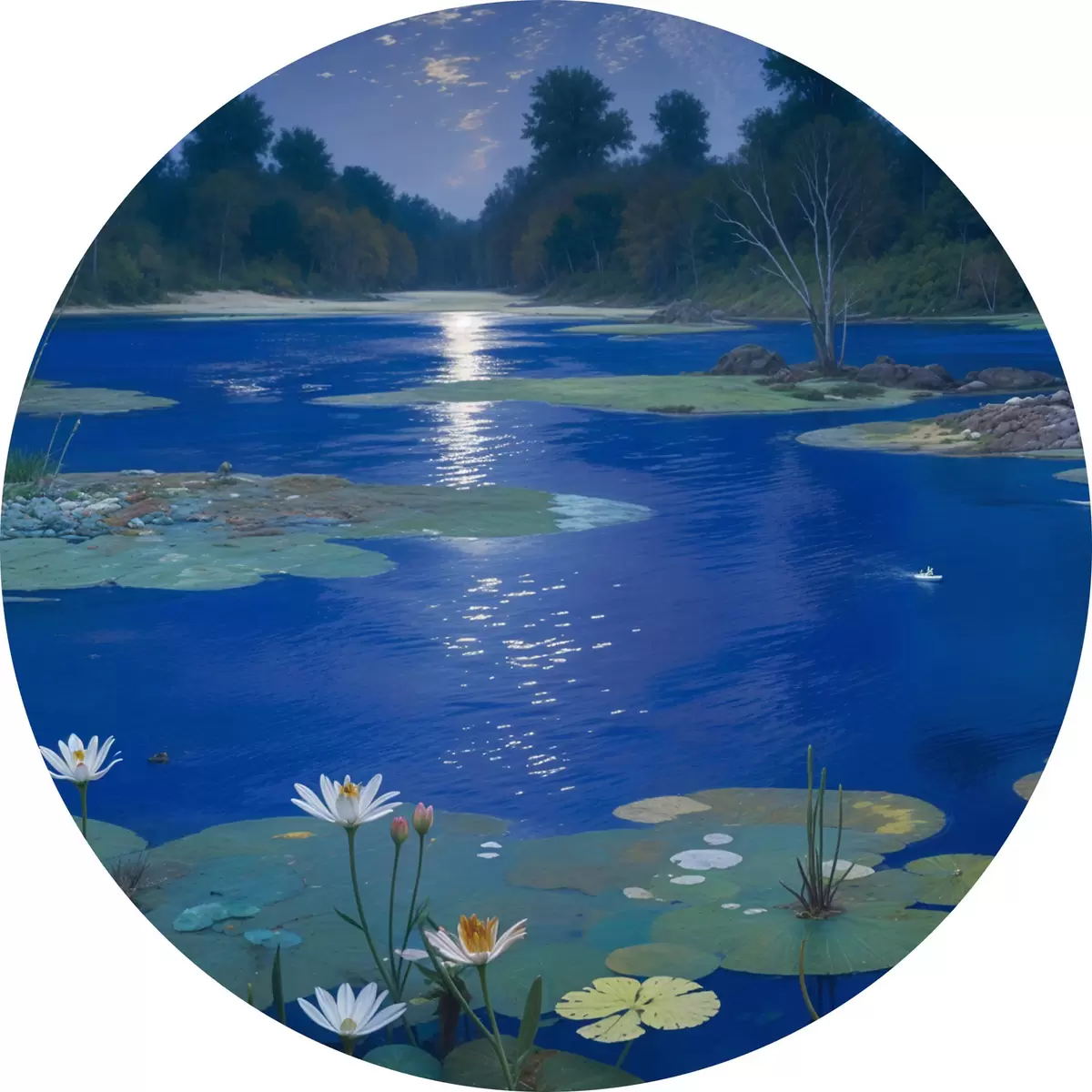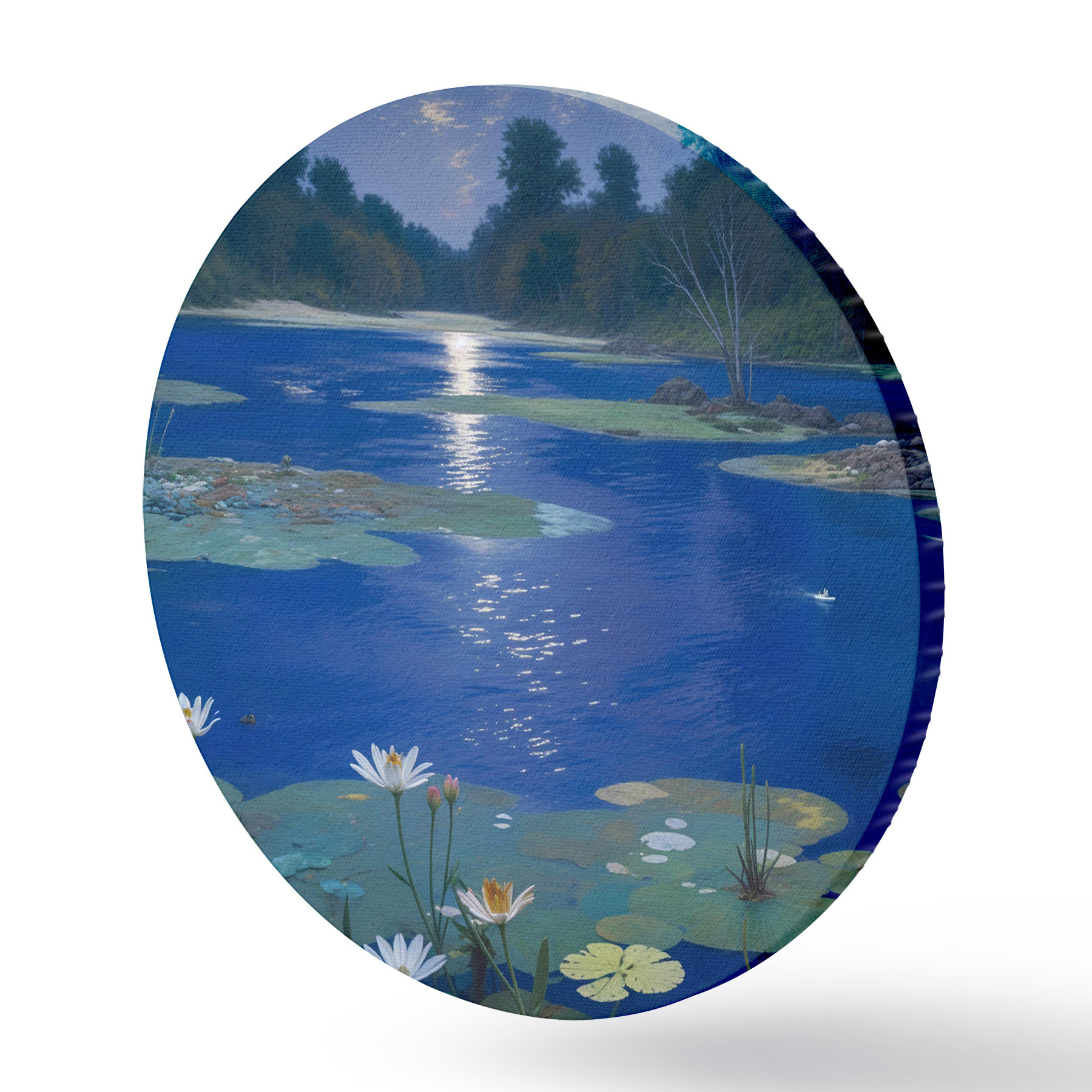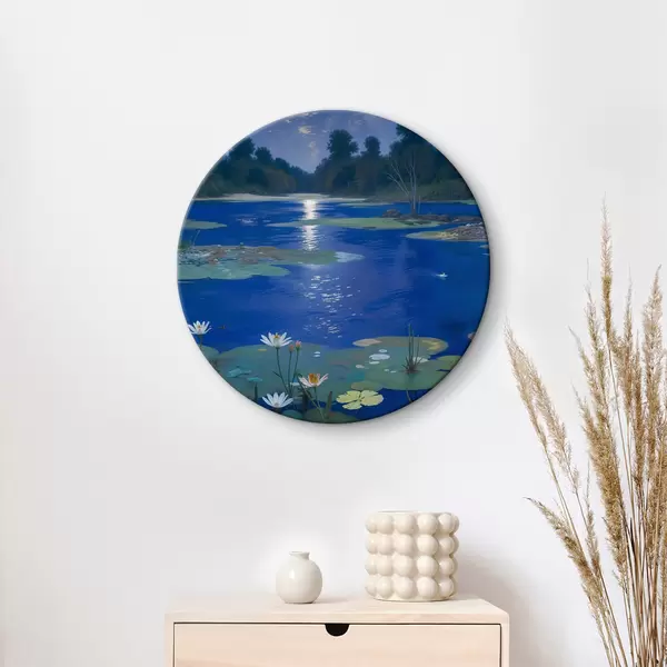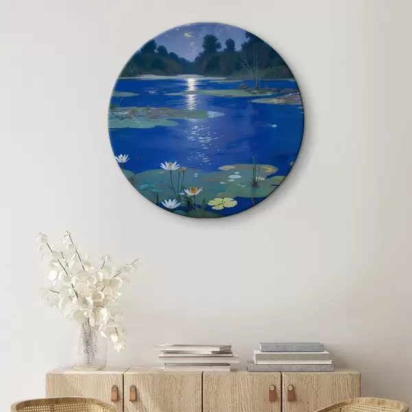 Pilt Järv öösel täiskuu peegeldub vees koos roheliste puude ja vesiroosidega Nr r39526