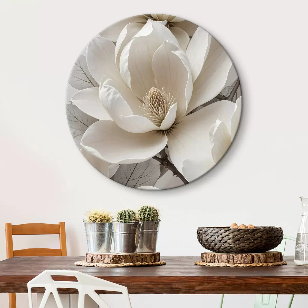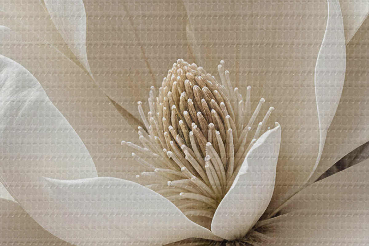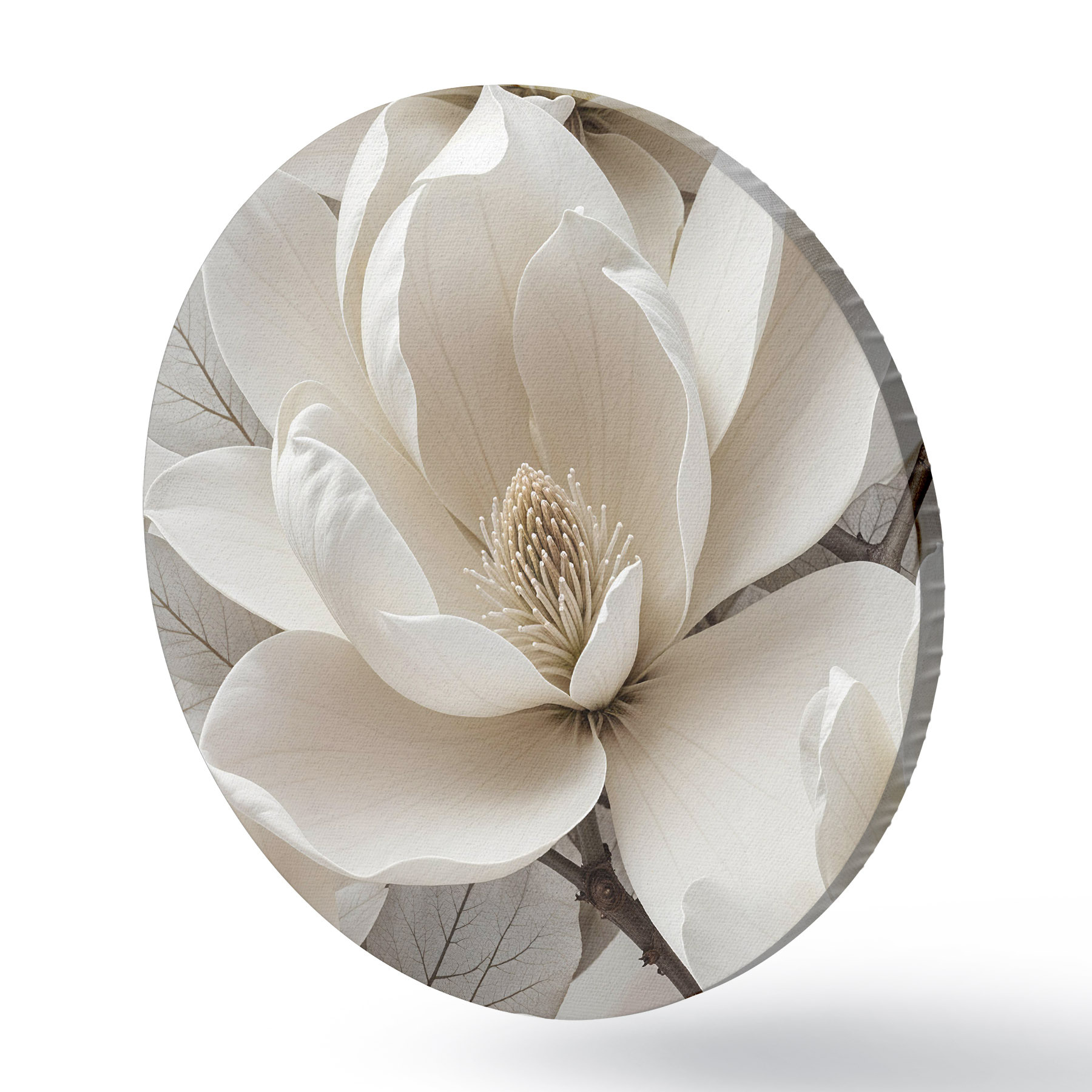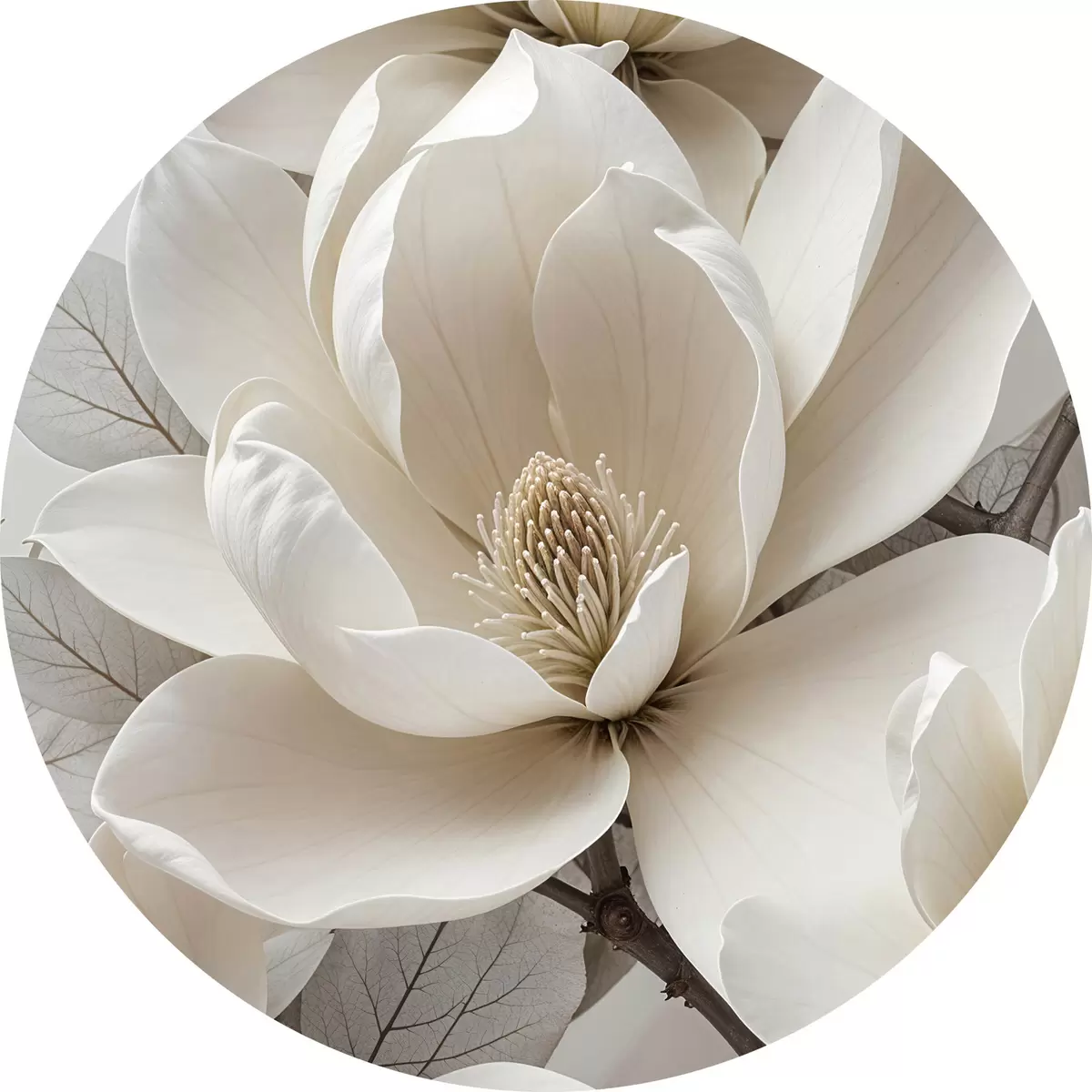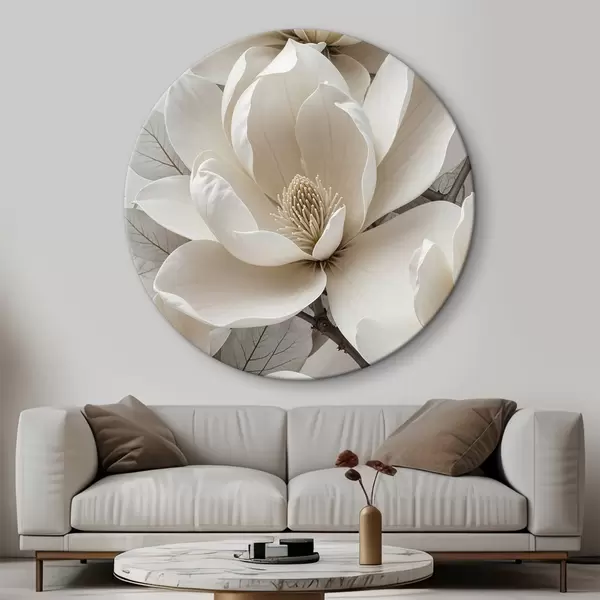 Pilt Valge magnoolia lill õrnade kroonlehtedega, mida ümbritsevad rohelised lehed heledal taustal Nr r39527