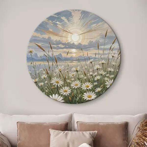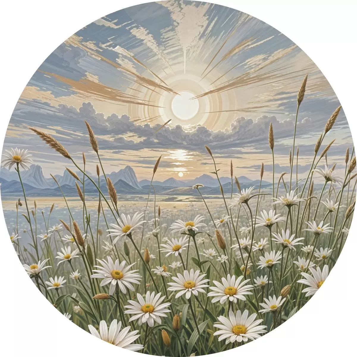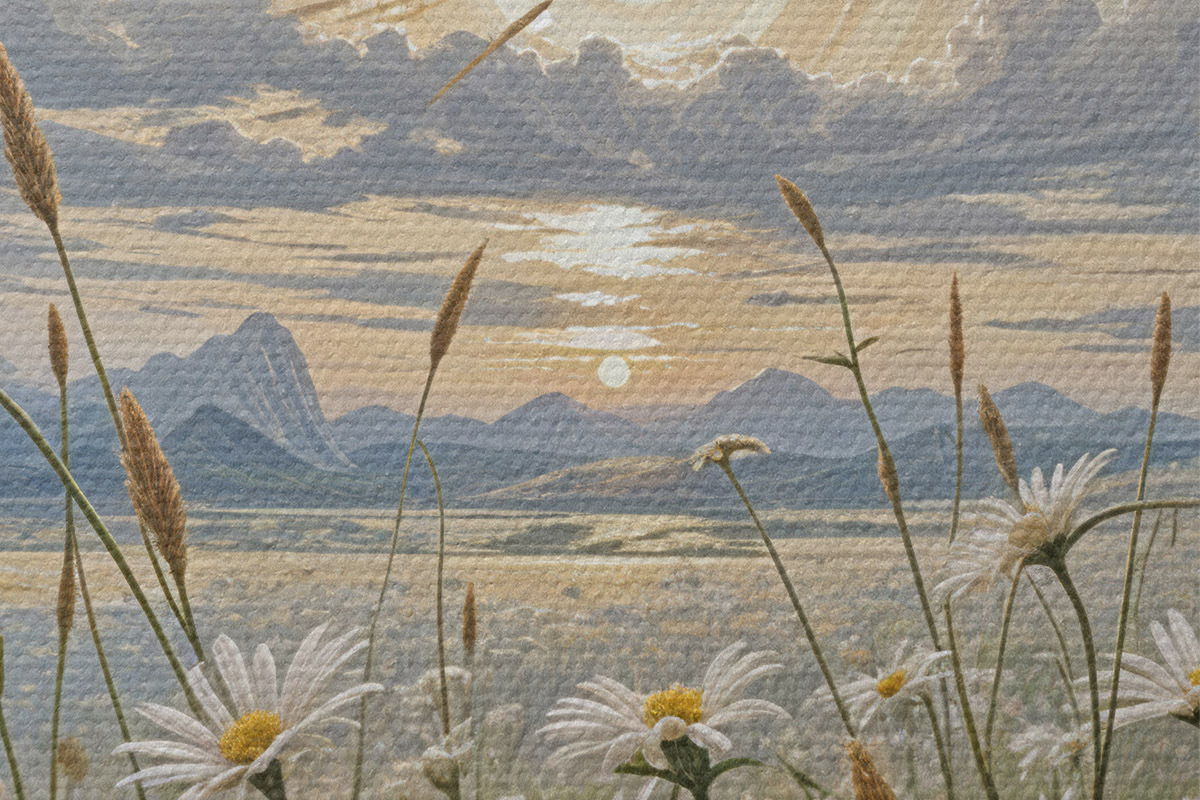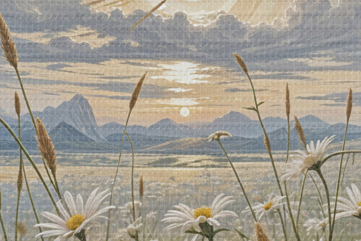 Pilt Esiplaanil valge karikakra lillede väli mägede maastiku ja pilvise taevaga Nr r39528