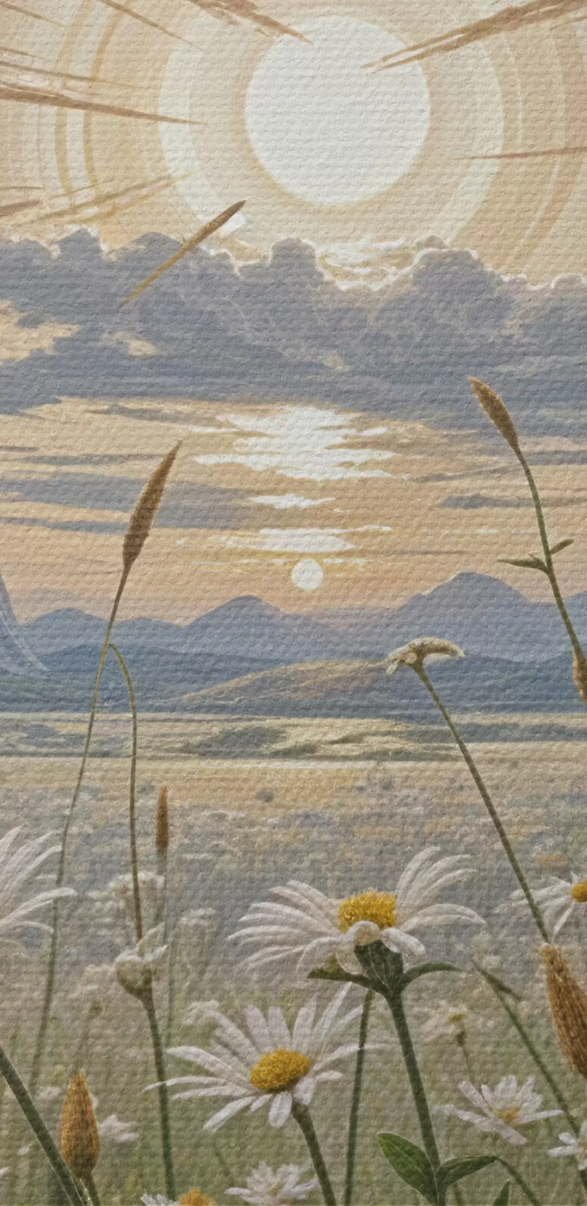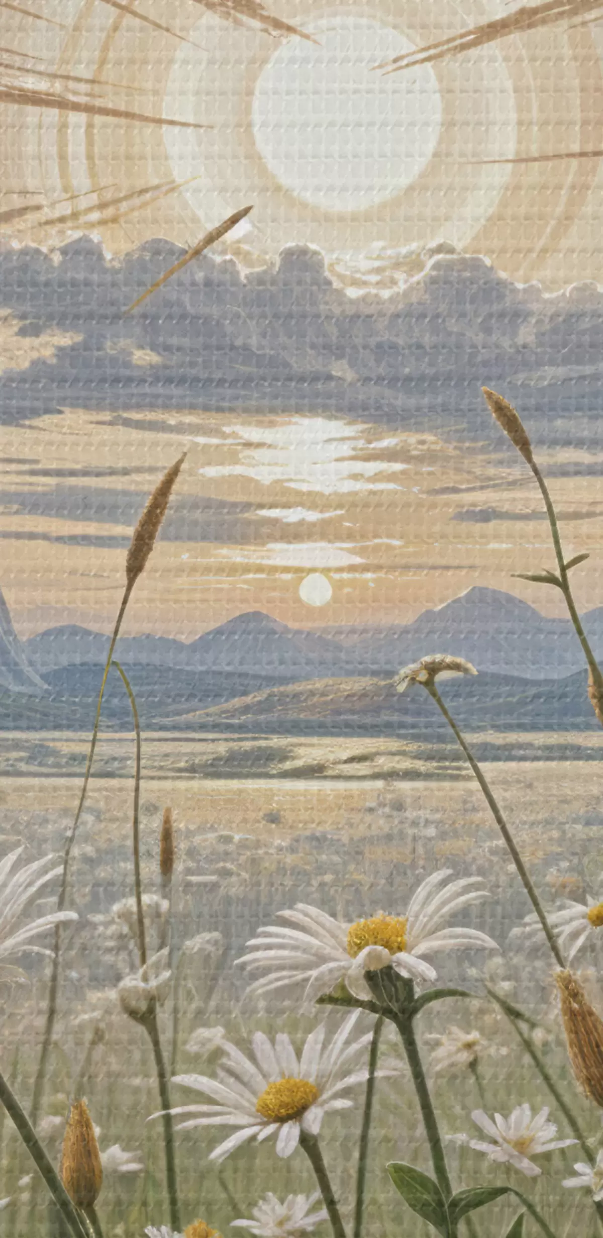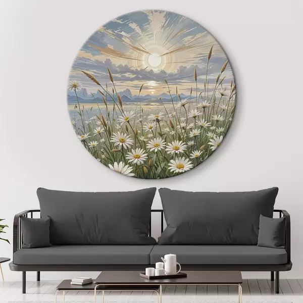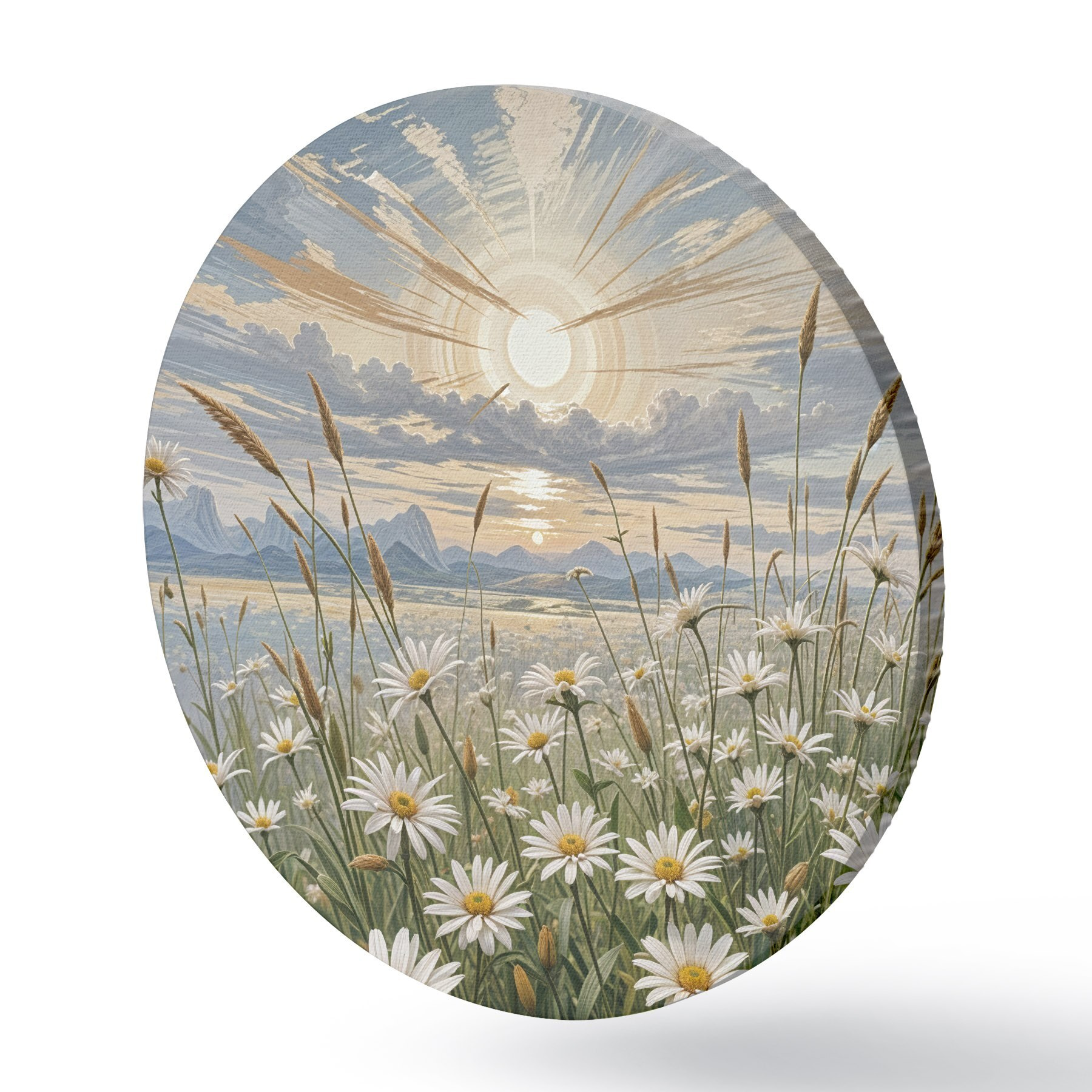 Pilt Esiplaanil valge karikakra lillede väli mägede maastiku ja pilvise taevaga Nr r39528