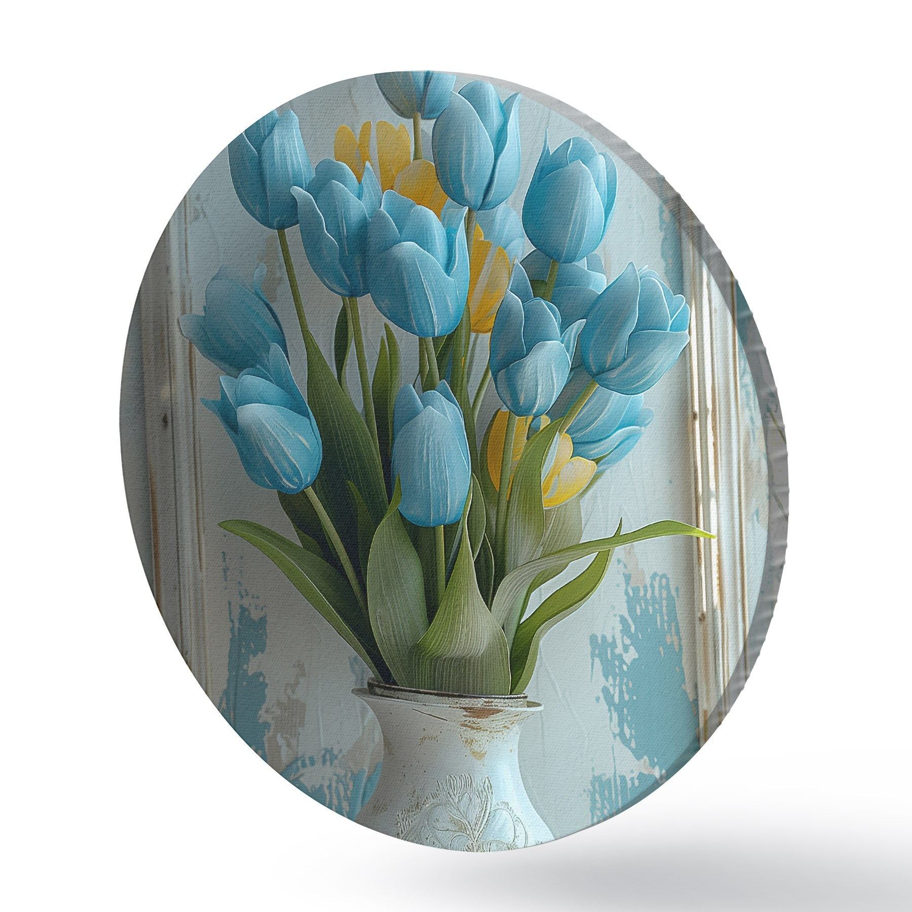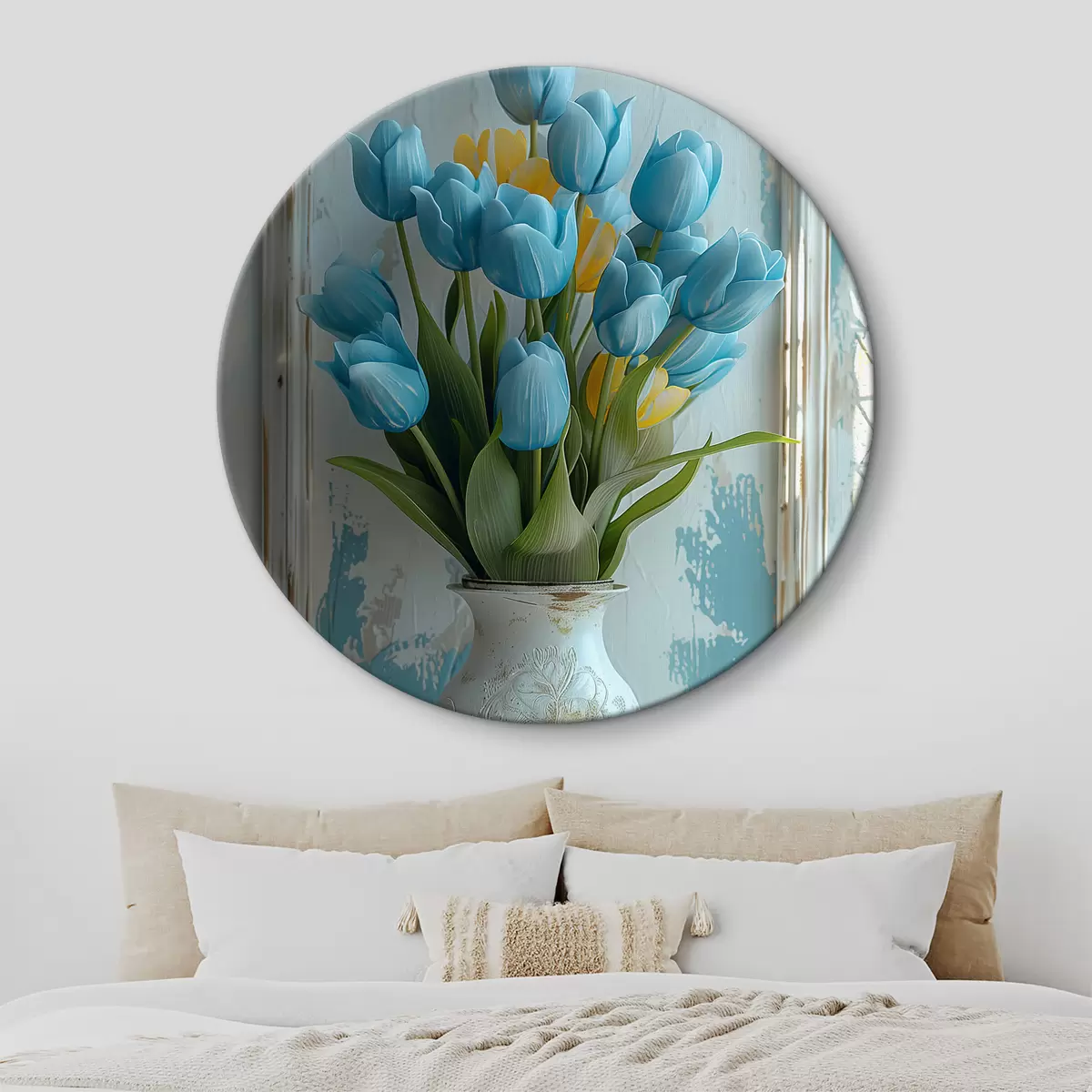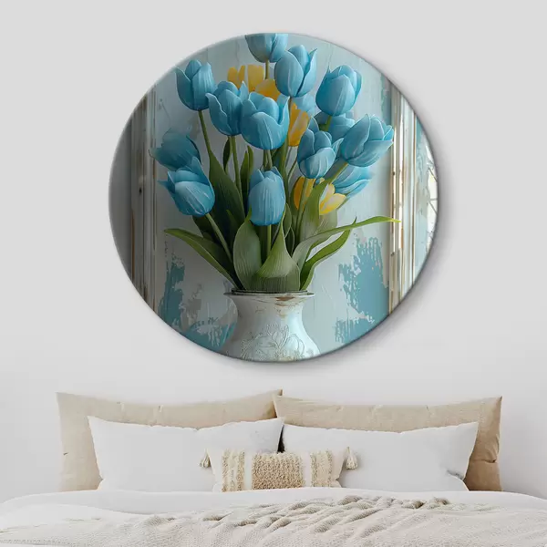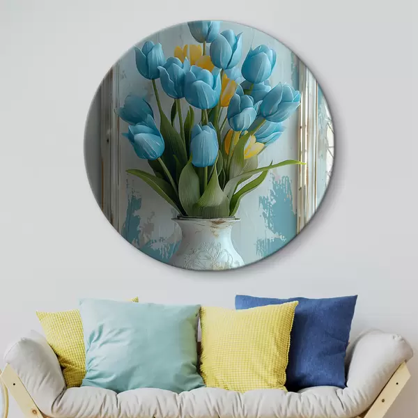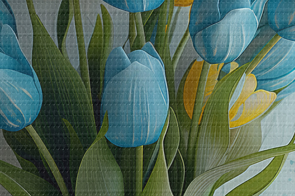Pilt Sinised ja kollased tulbid 3D-s: elegantne valge raamiga seinapilt, valge ja helesinine taust ning graveeritud vaas Nr r39636