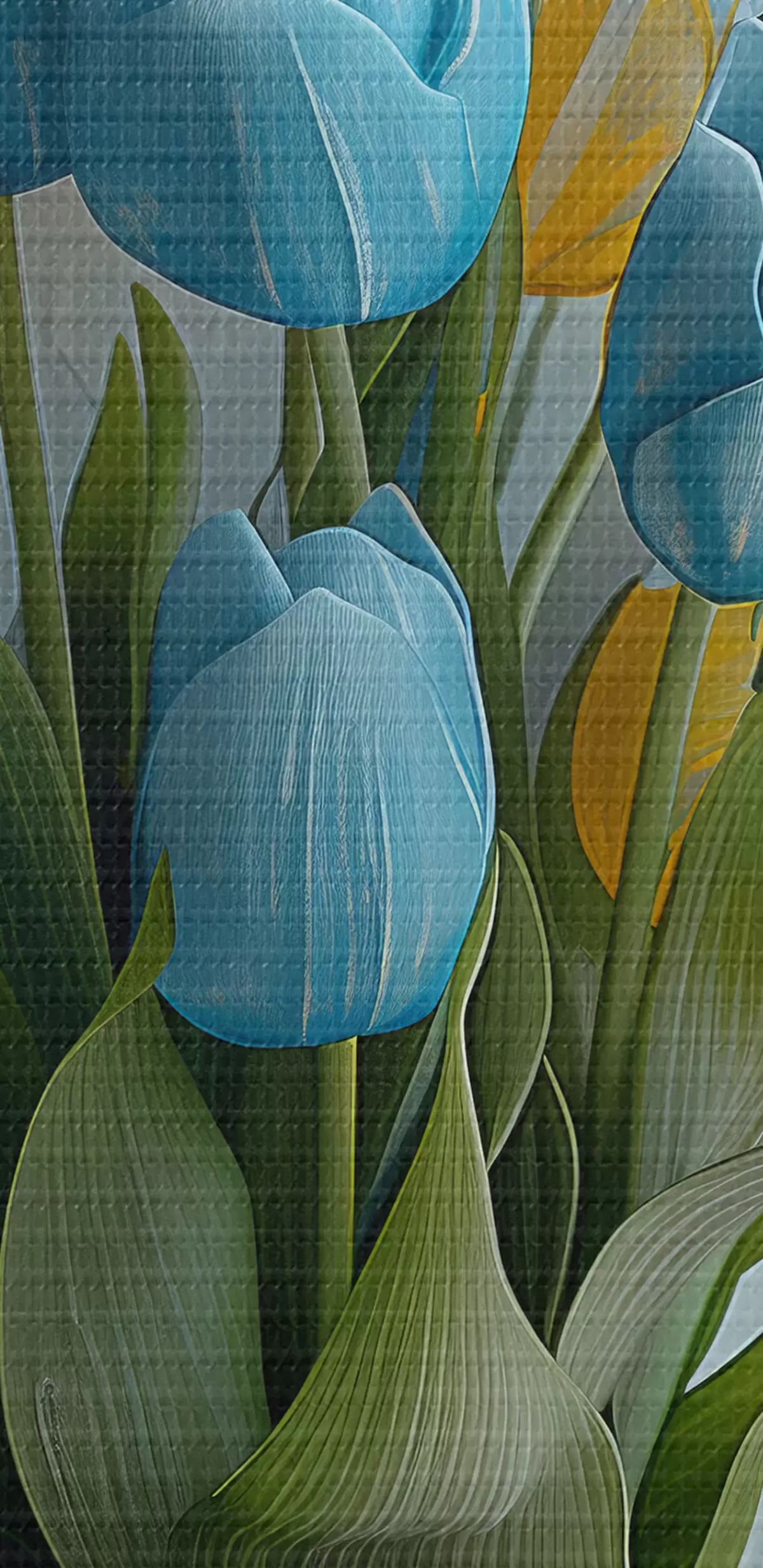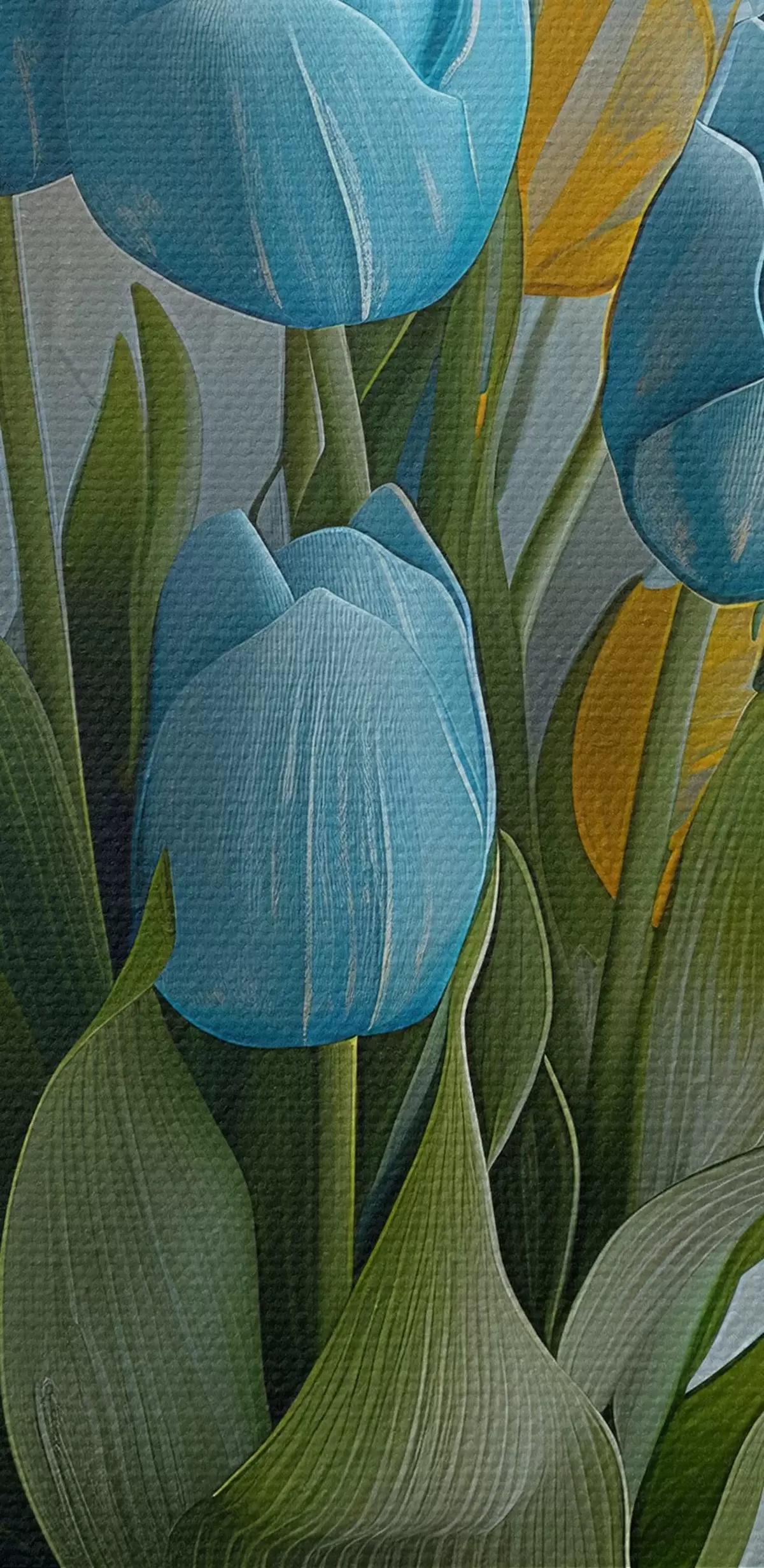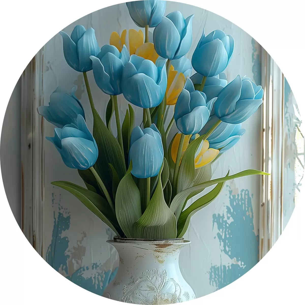 Pilt Sinised ja kollased tulbid 3D-s: elegantne valge raamiga seinapilt, valge ja helesinine taust ning graveeritud vaas Nr r39636