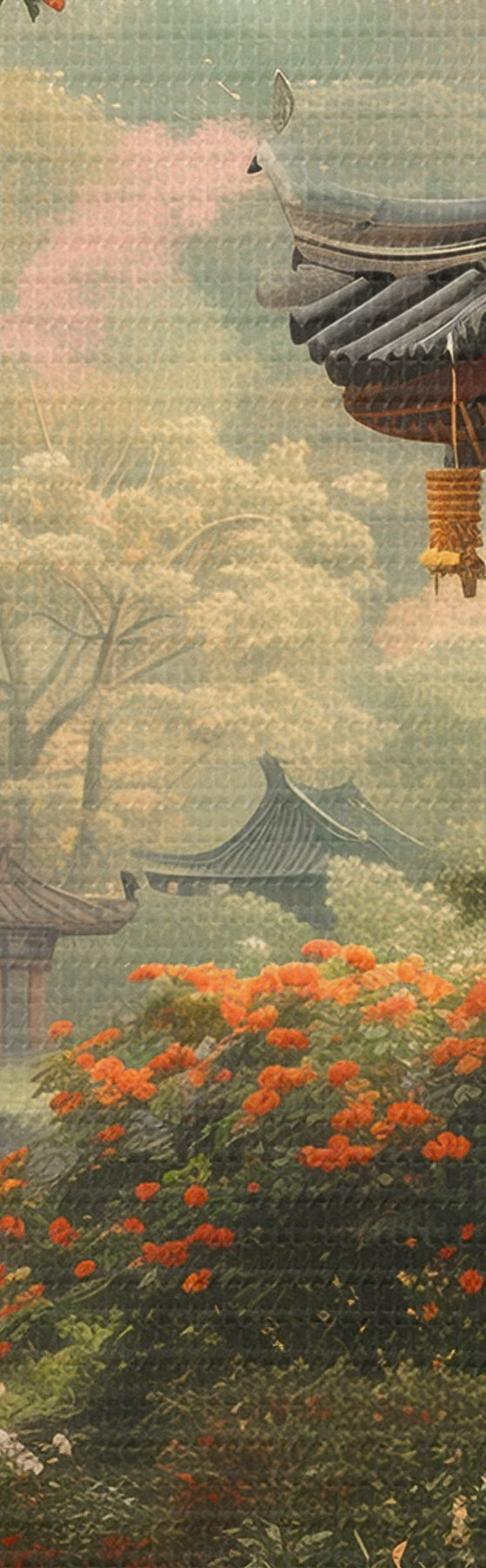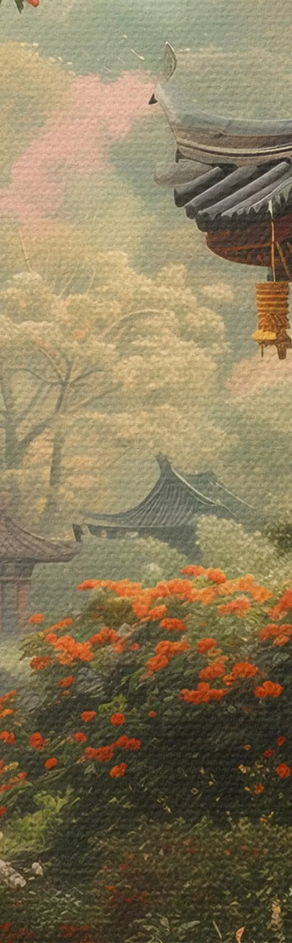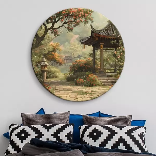 Pilt Jaapani park õitsvate puude ja lilledega, mets, aiamaja, järv Nr r39772