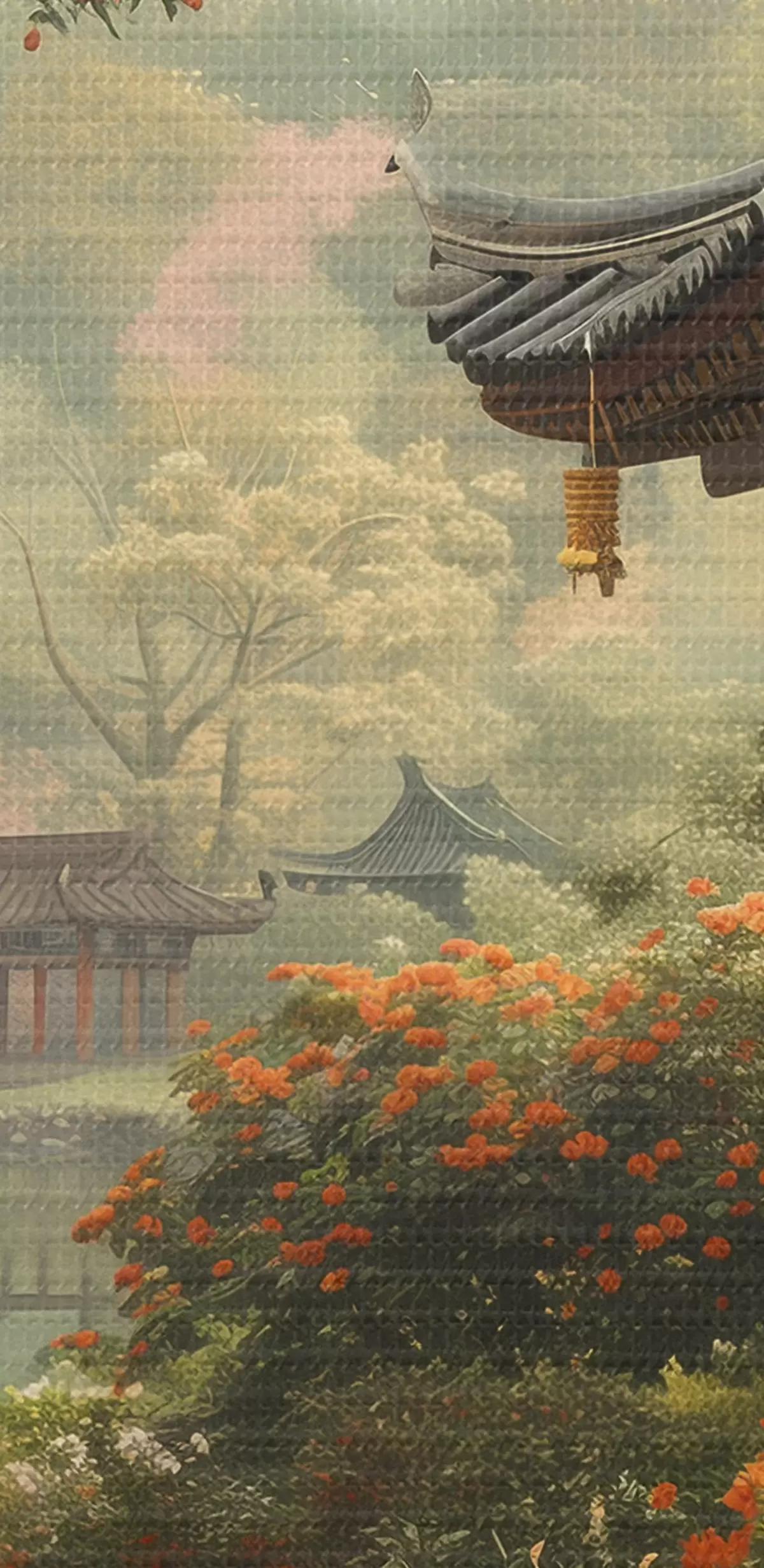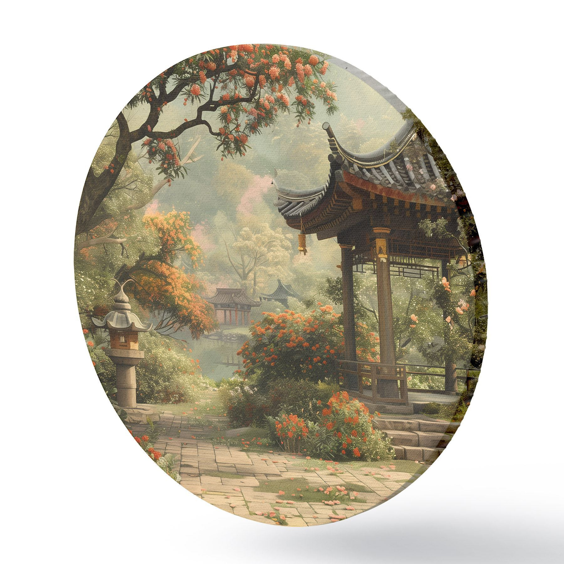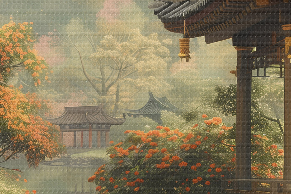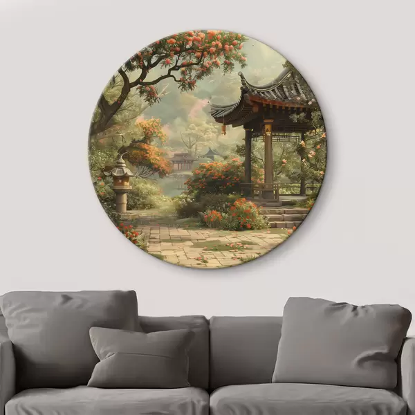 Pilt Jaapani park õitsvate puude ja lilledega, mets, aiamaja, järv Nr r39772