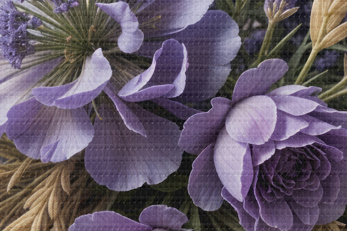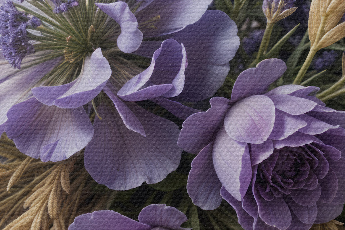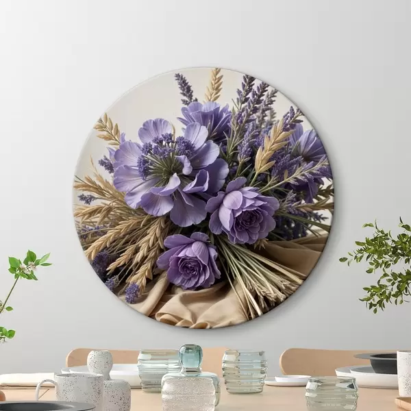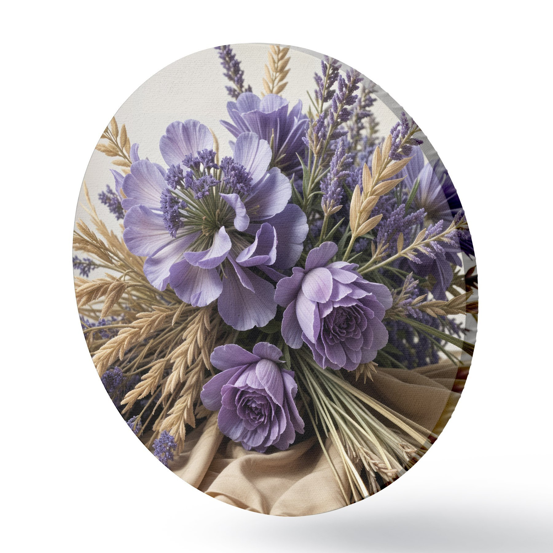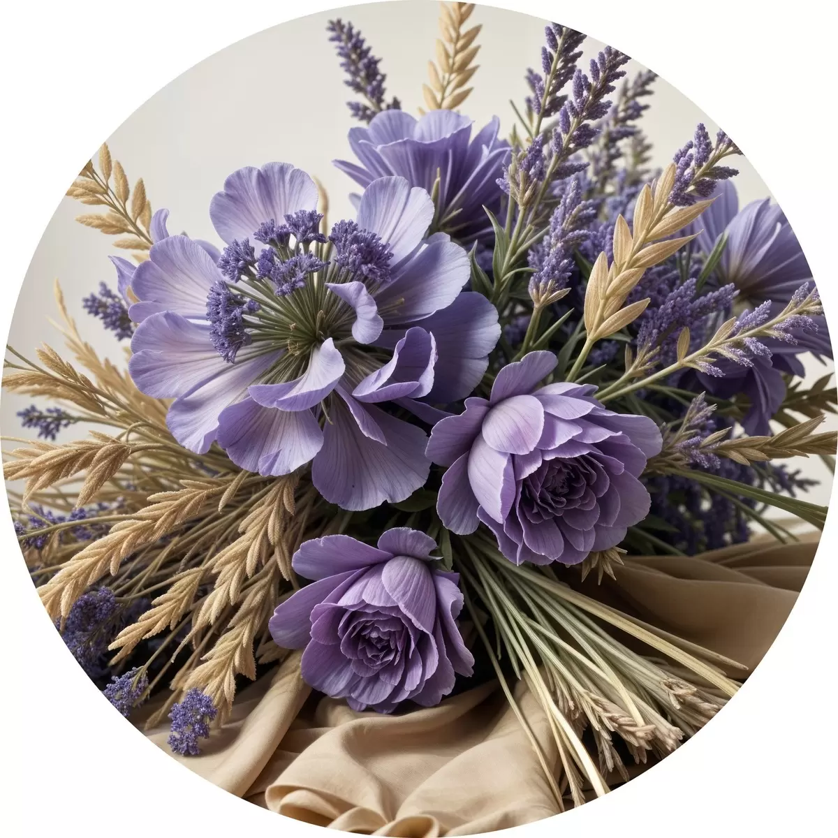 Pilt Lillade lillede kimp, sealhulgas pojengid ja lavendel, heledal taustal nisuvarred Nr r40030