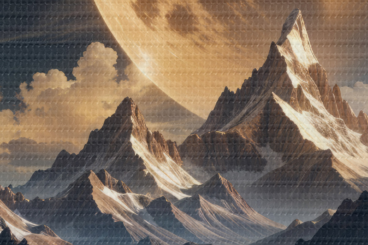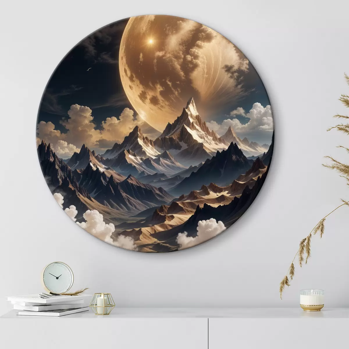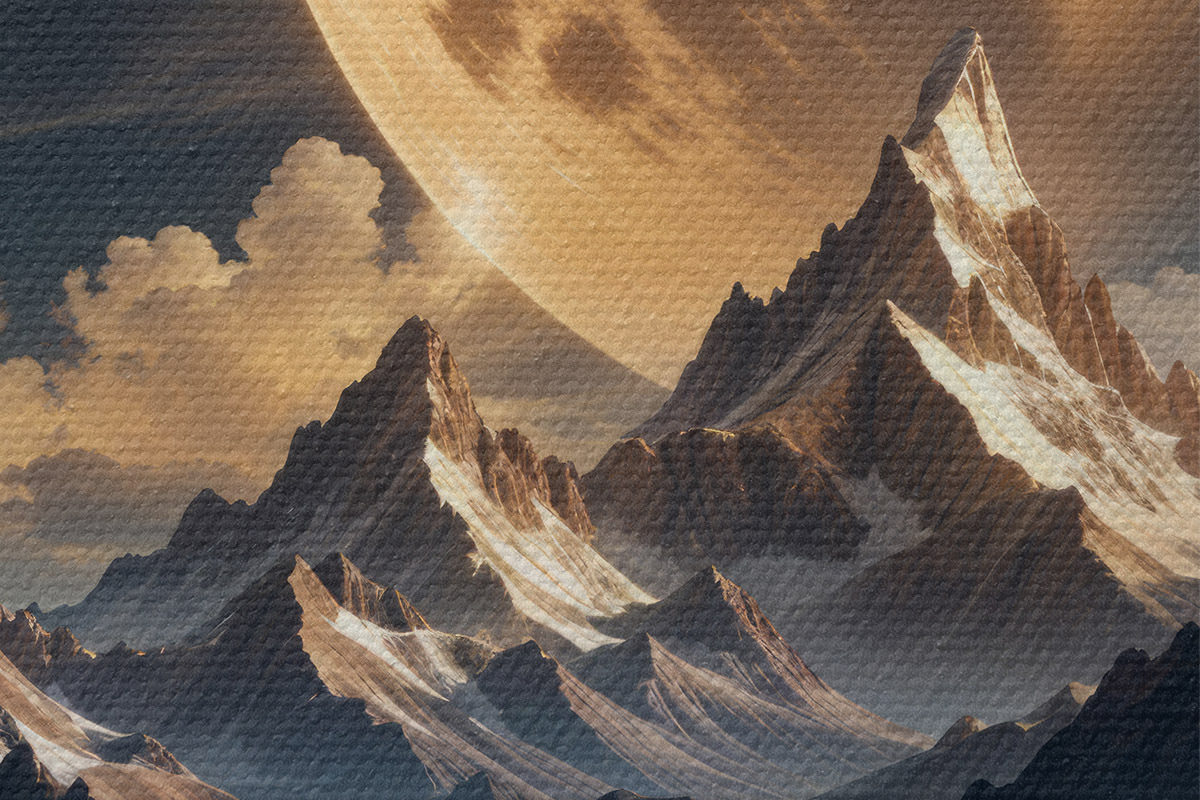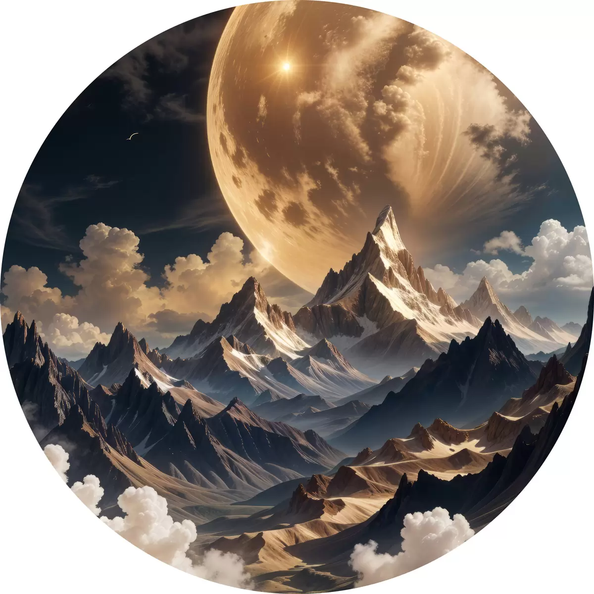 Pilt Sürrealistlik maastik lumiste mägedega massiivse täiskuu all ja vingete pilvedega Nr r40147