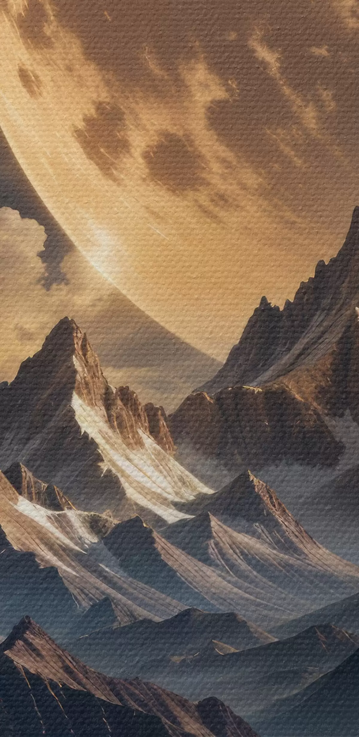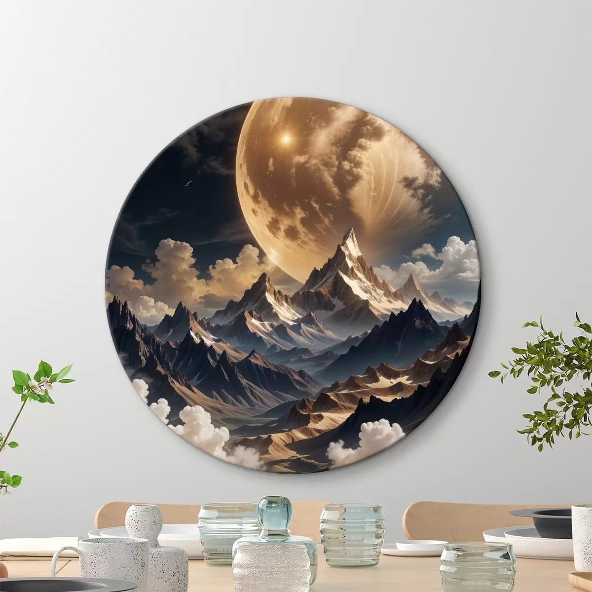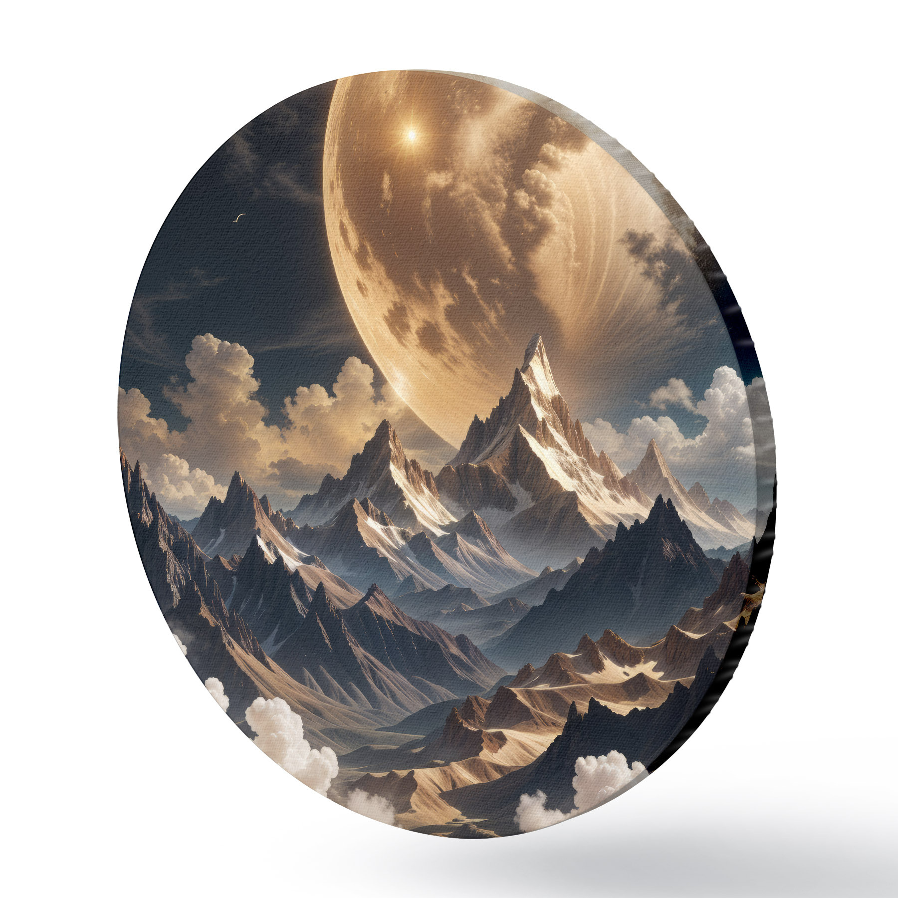 Pilt Sürrealistlik maastik lumiste mägedega massiivse täiskuu all ja vingete pilvedega Nr r40147