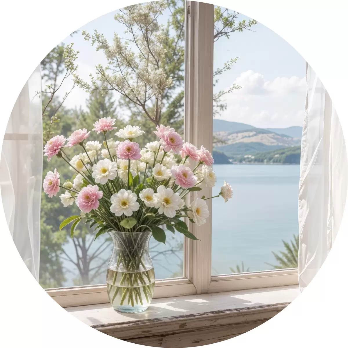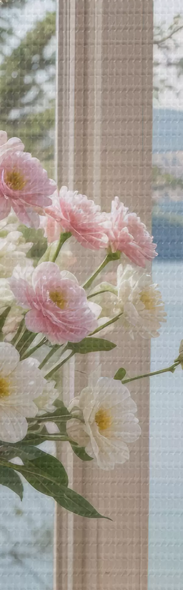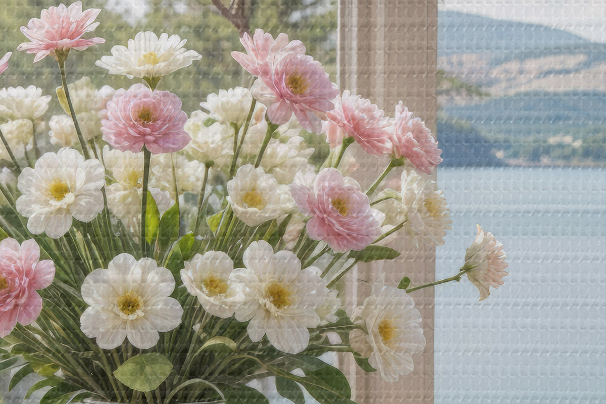 Pilt Roosade ja valgete lillede kimp aknalauale asetatud klaasvaasis maalilise järve ja mägedega Nr r40151