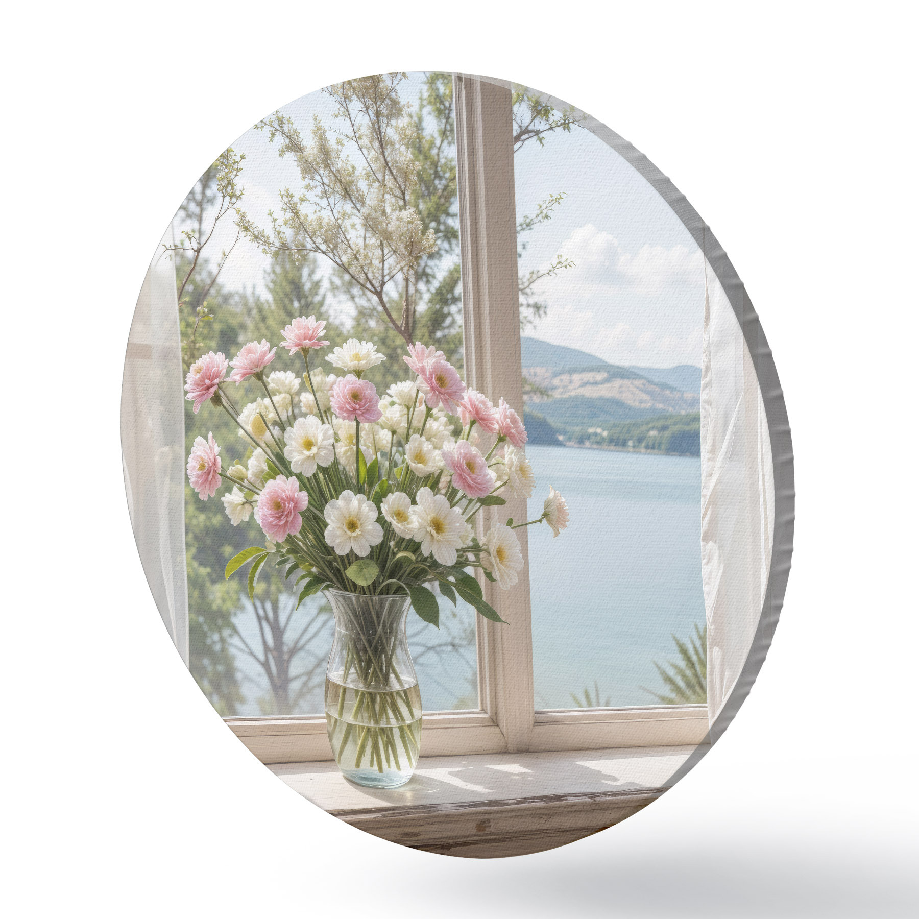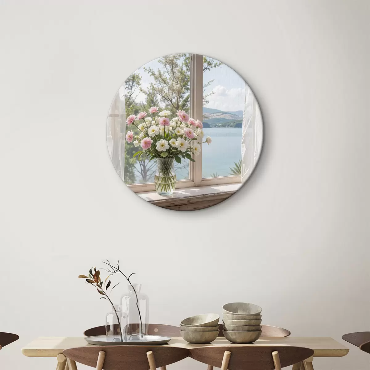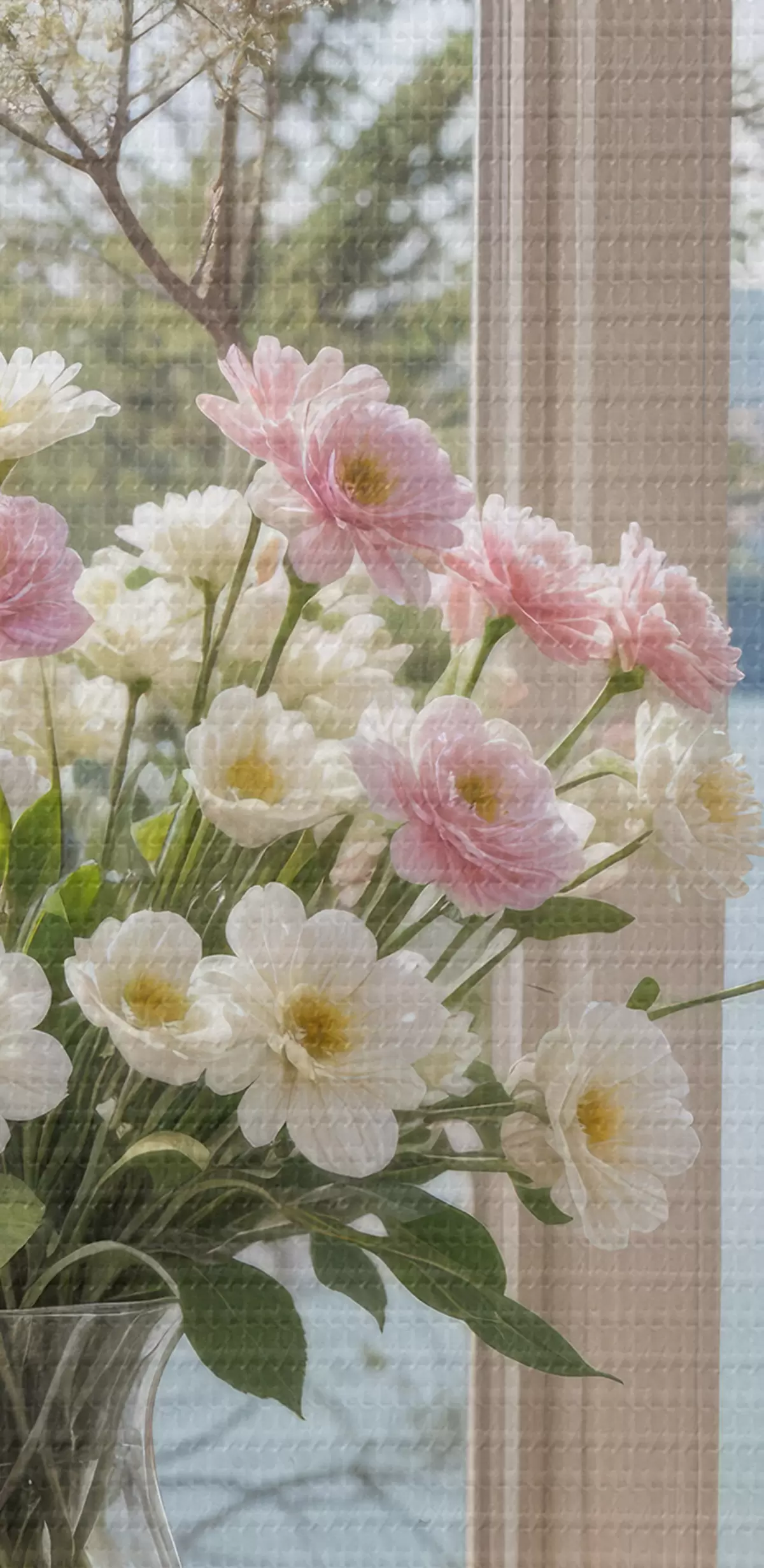 Pilt Roosade ja valgete lillede kimp aknalauale asetatud klaasvaasis maalilise järve ja mägedega Nr r40151