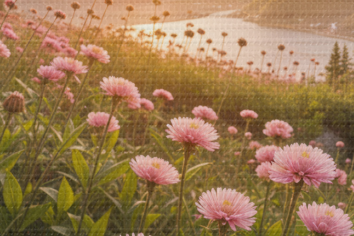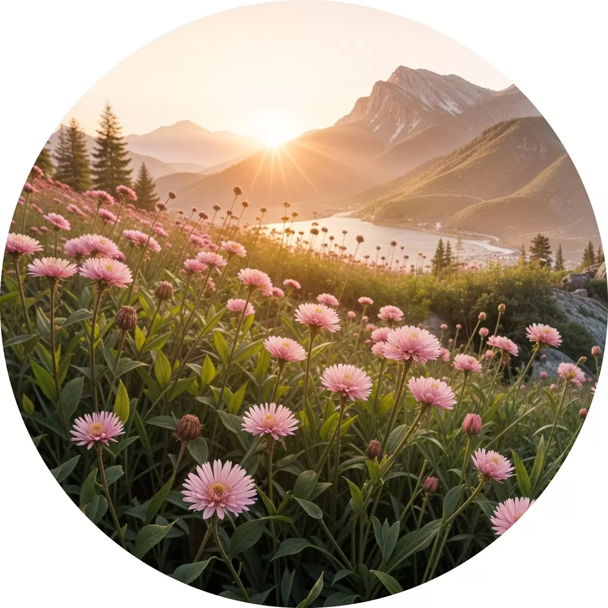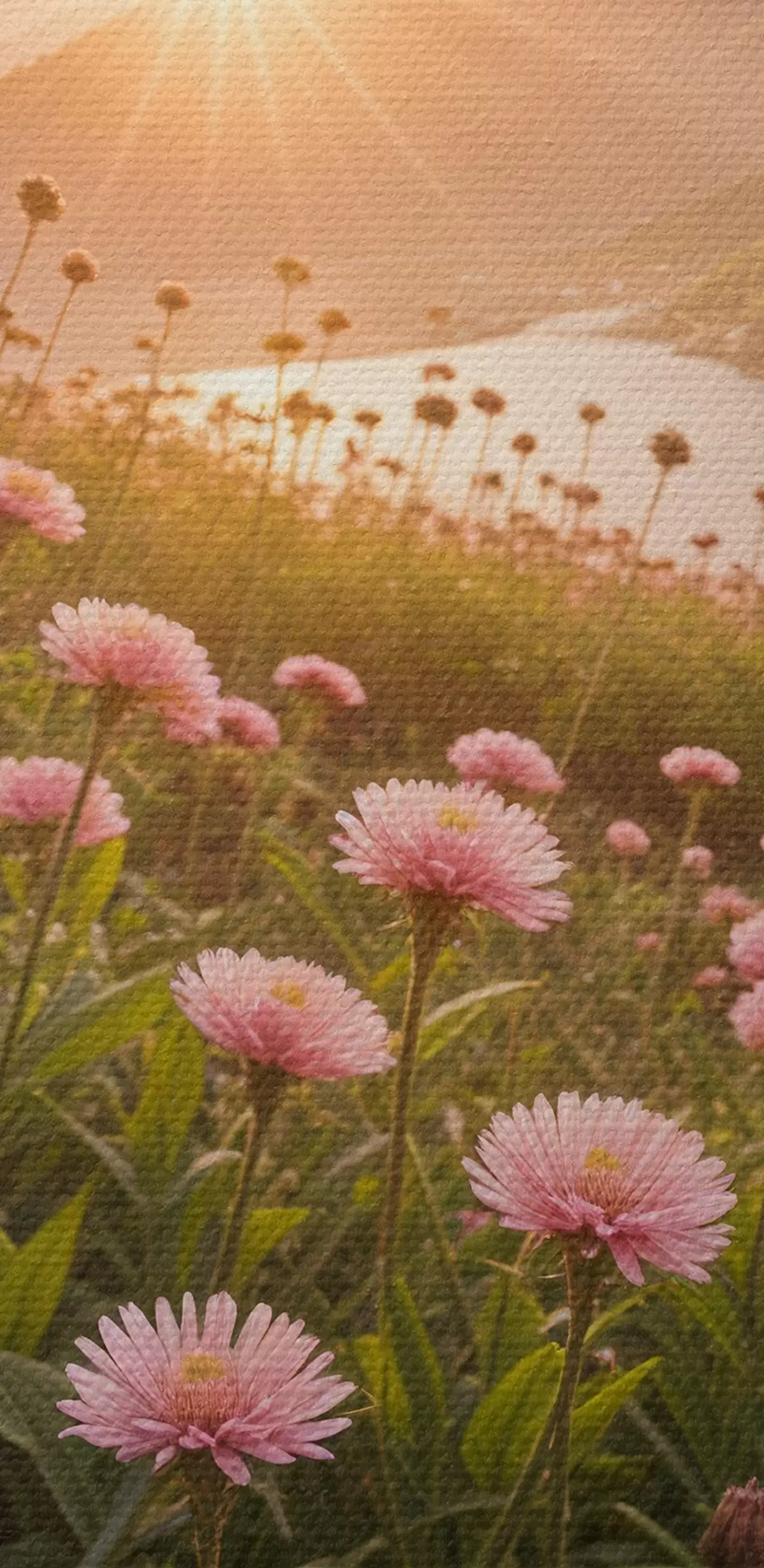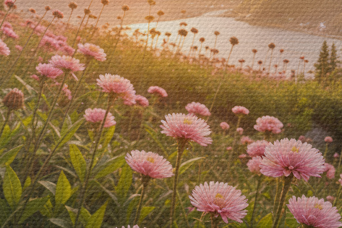 Pilt Esiplaanil roosade karikakrataoliste lillede väli, taamal suur mäeahelik Nr r40154