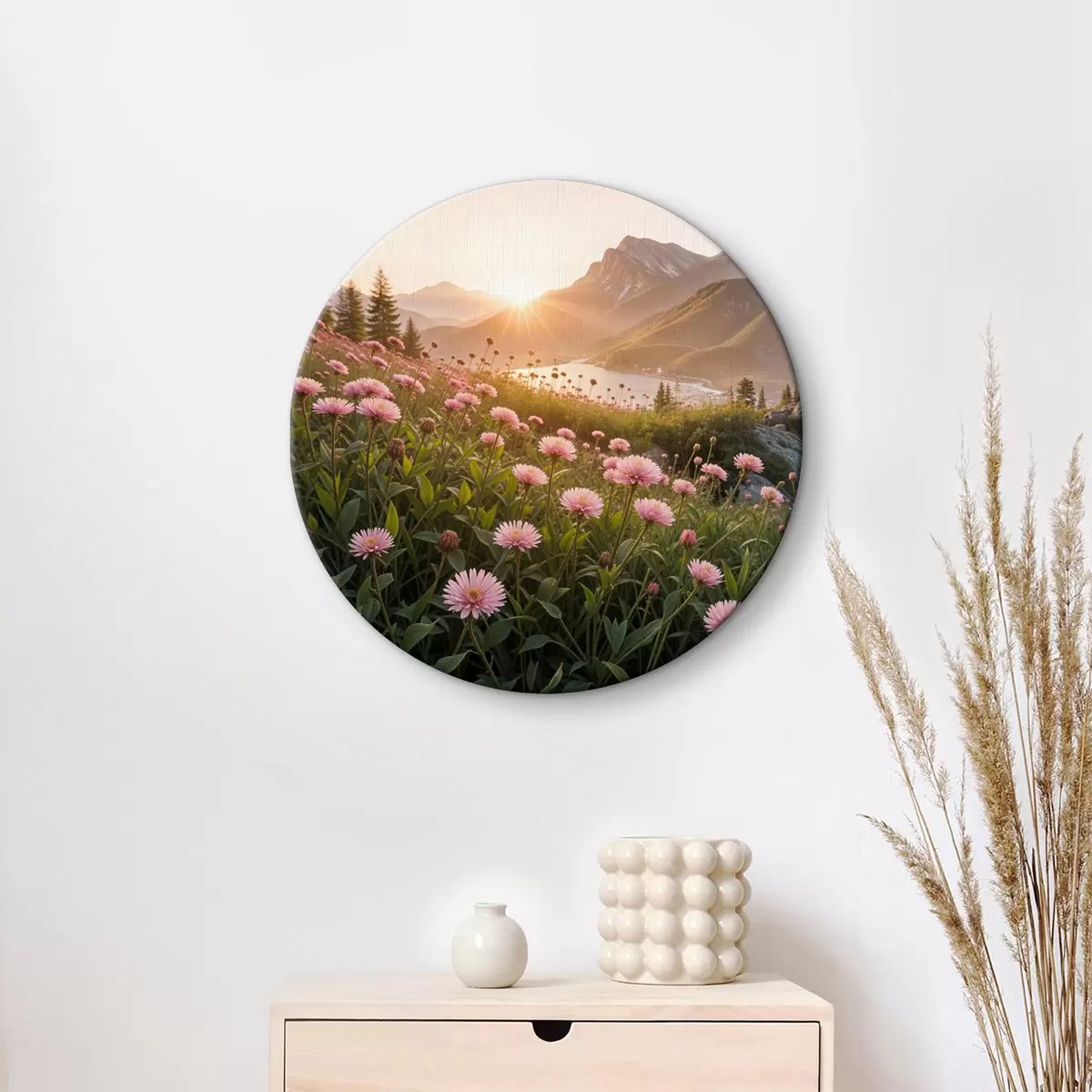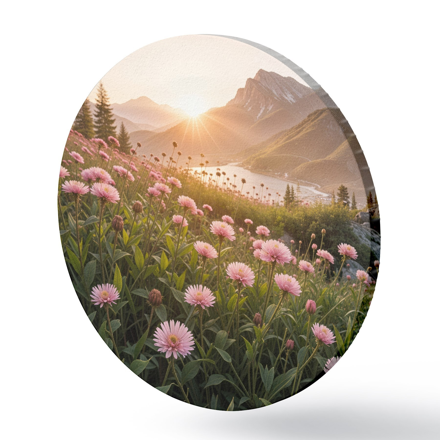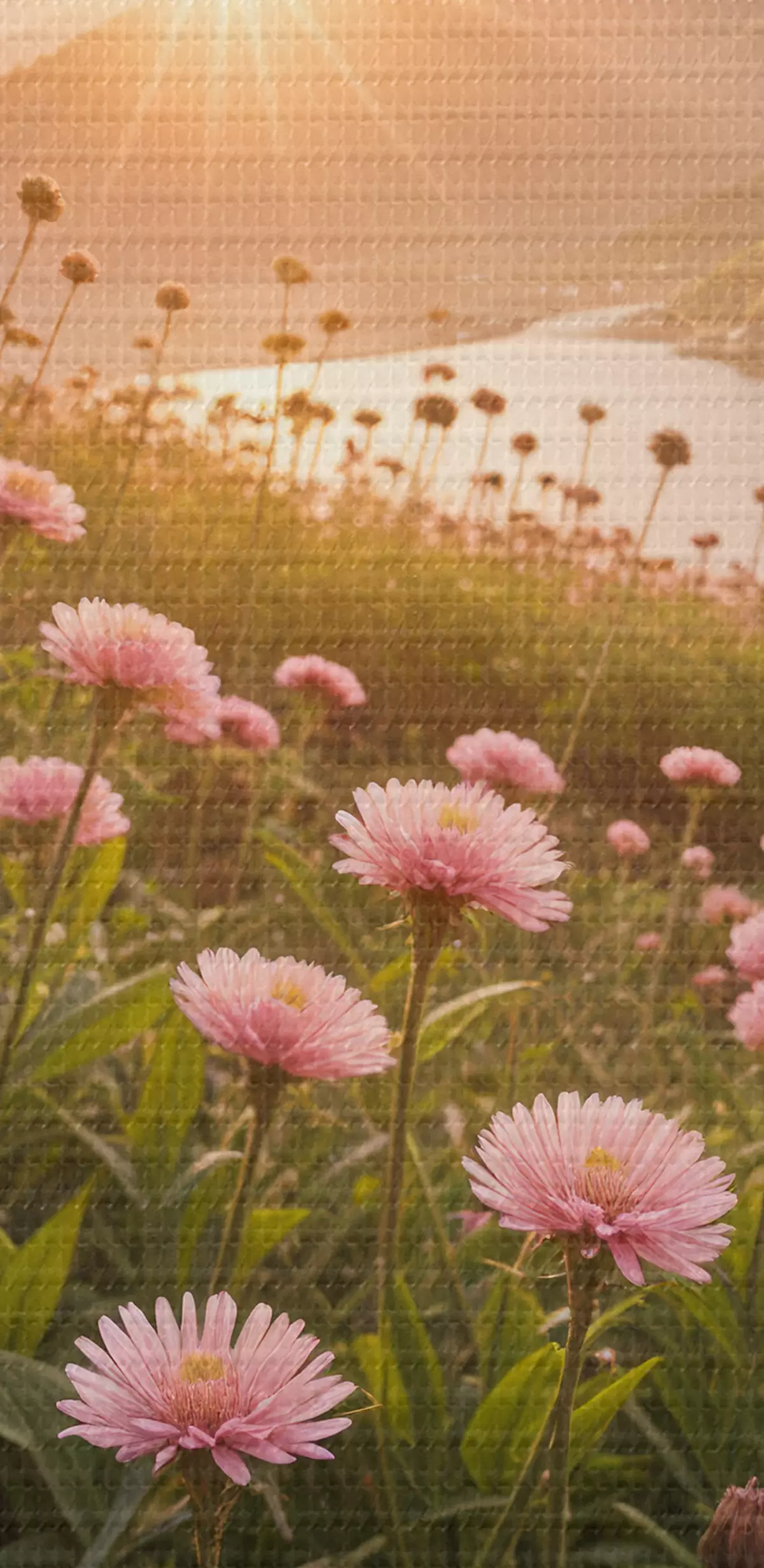 Pilt Esiplaanil roosade karikakrataoliste lillede väli, taamal suur mäeahelik Nr r40154