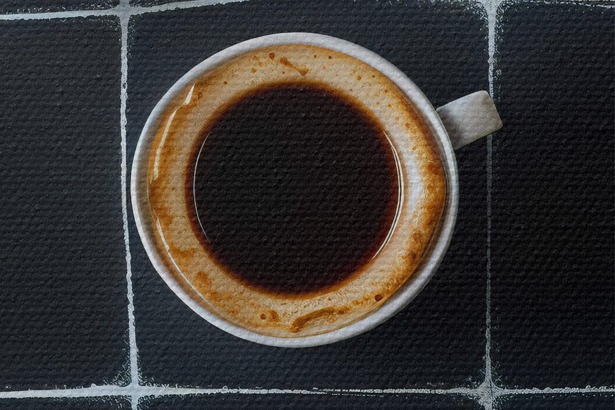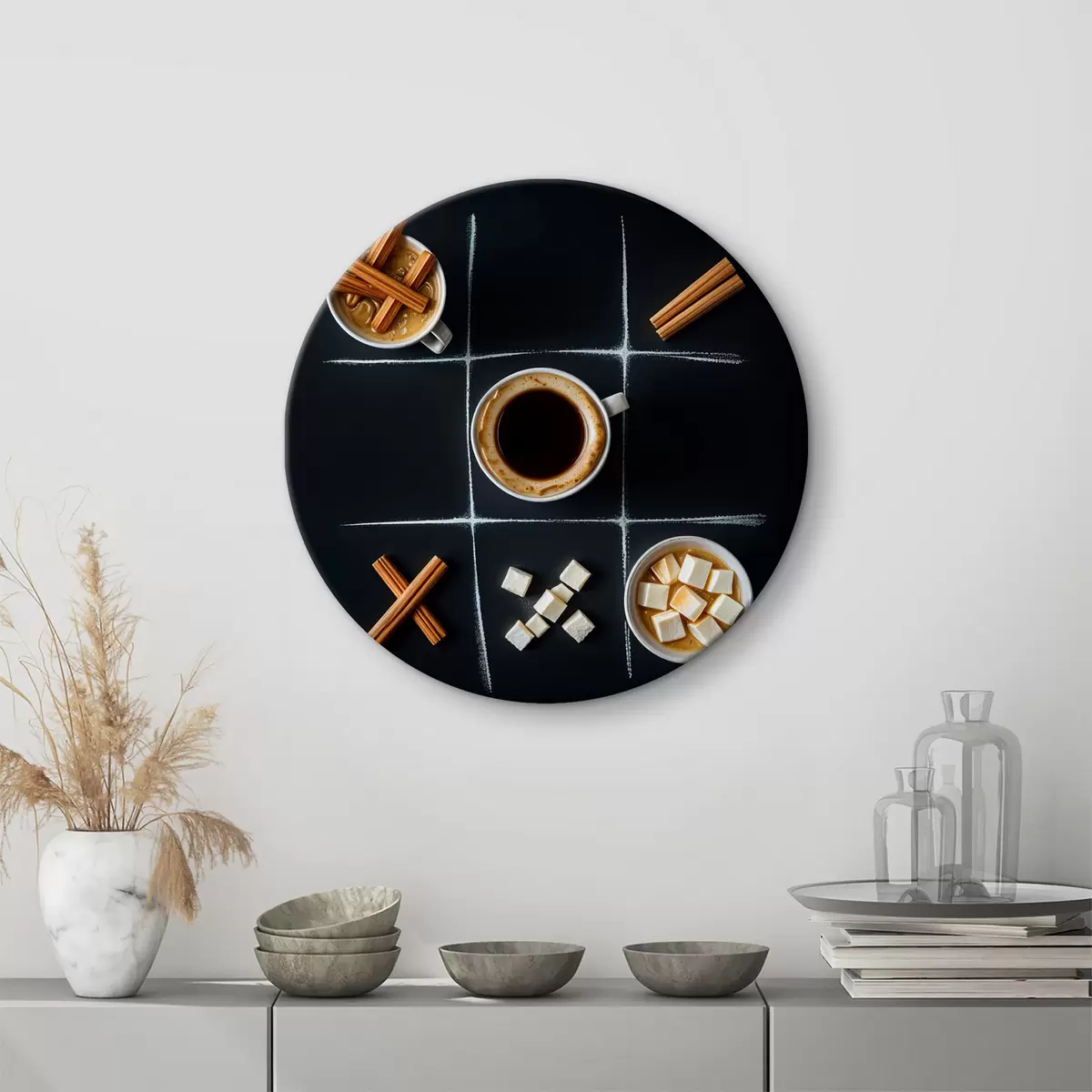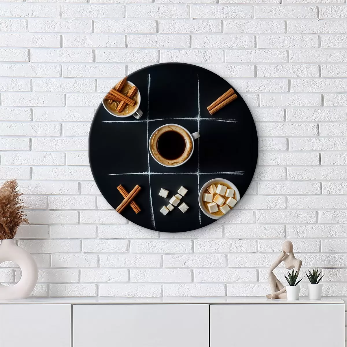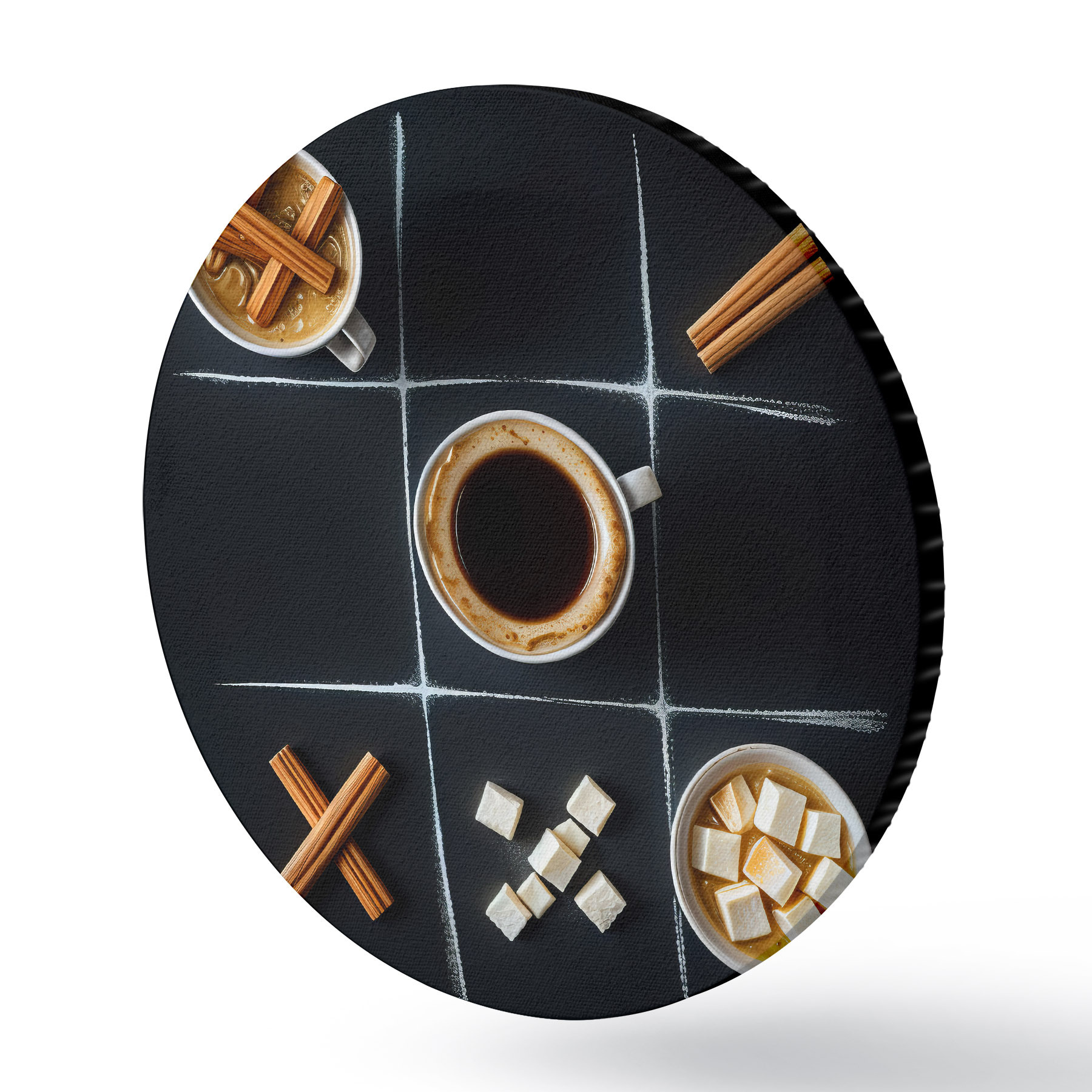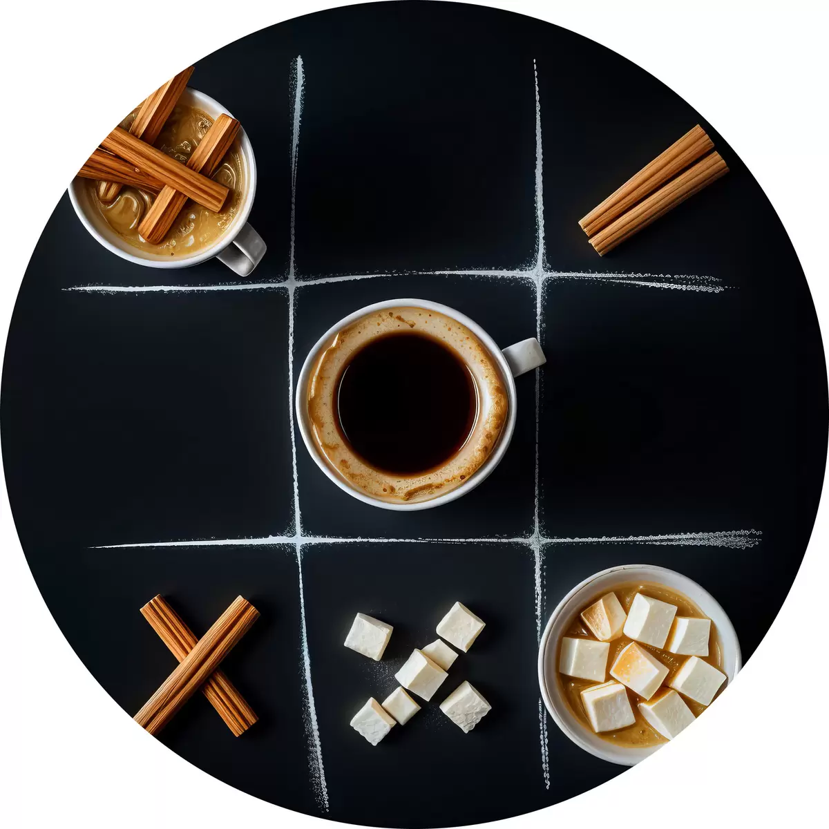 Pilt Tass kohvi kaneelipulkade, suhkrukuubikute ja vahukommidega, mis on paigutatud tic-tac-toe-võrku Nr r40163