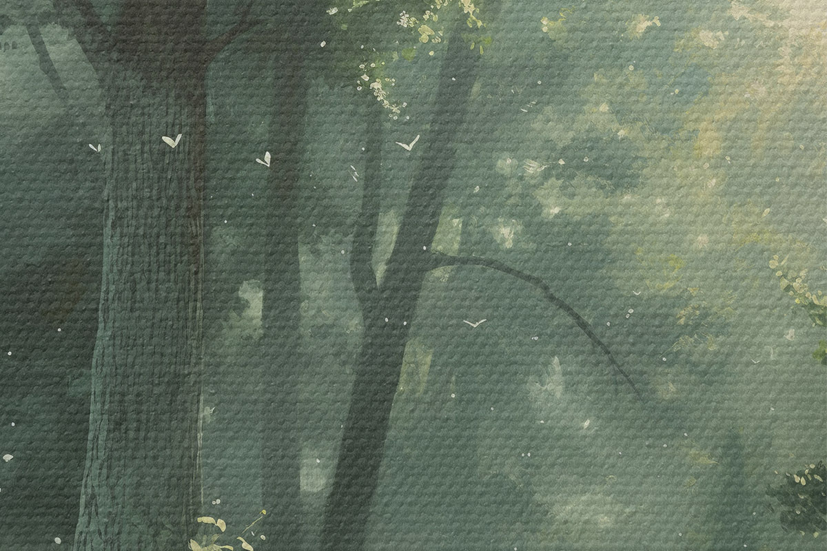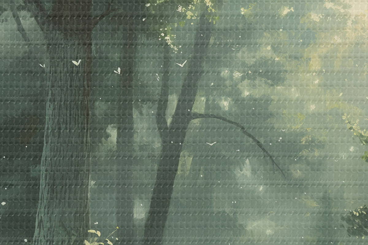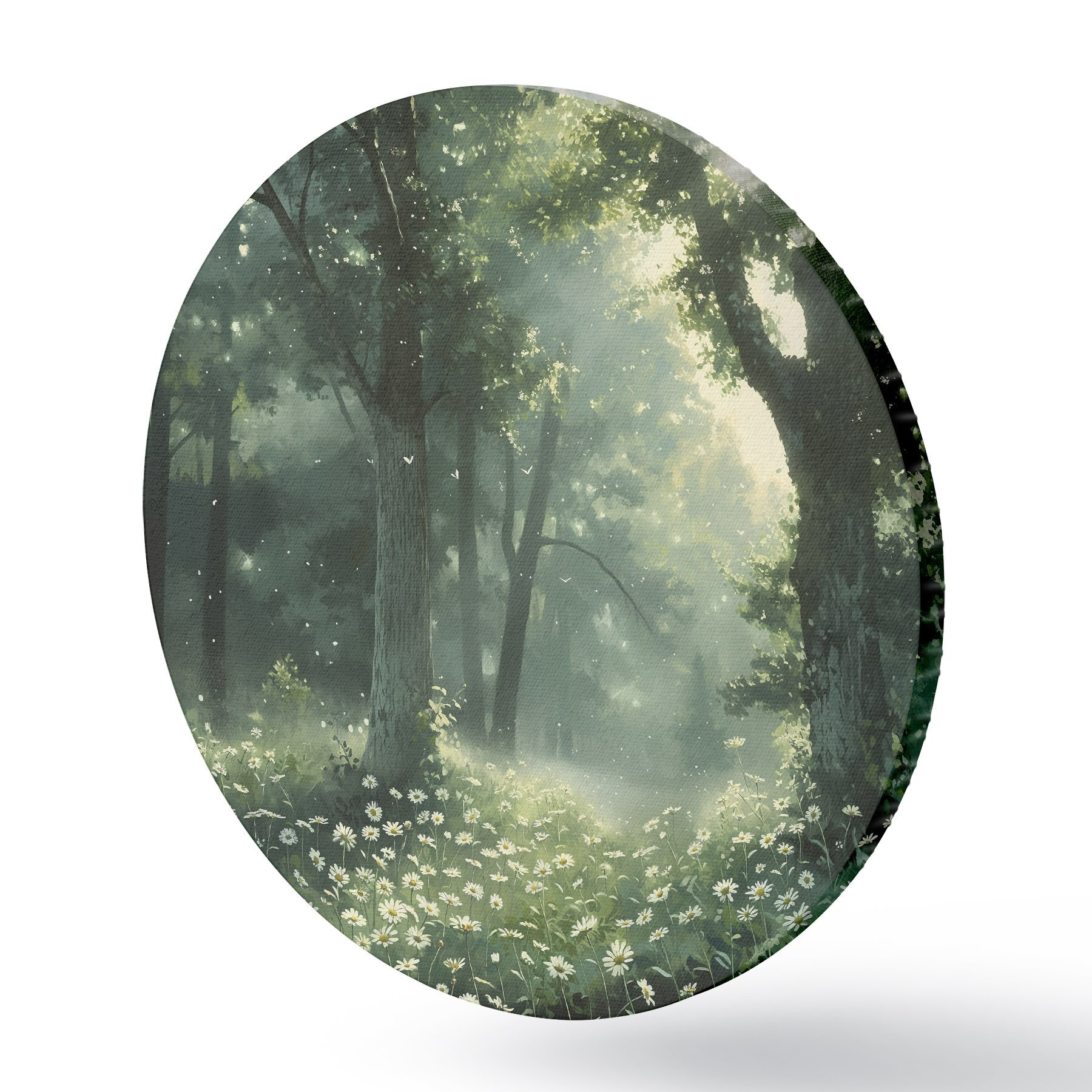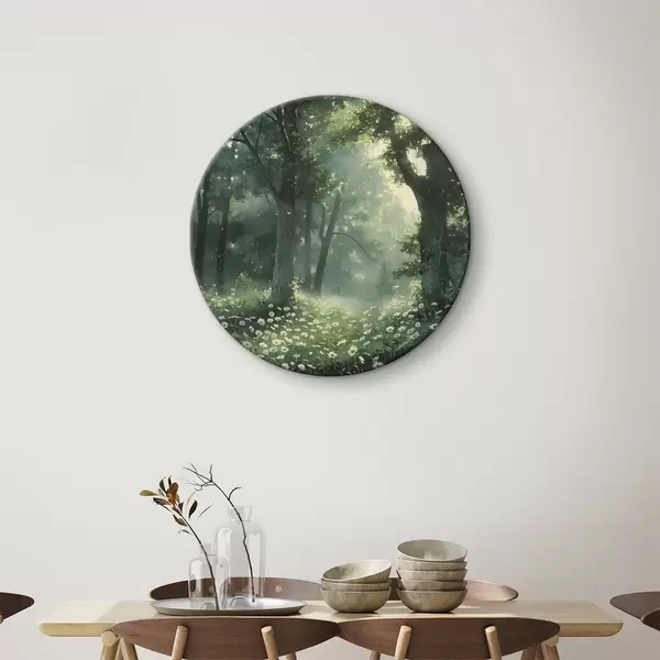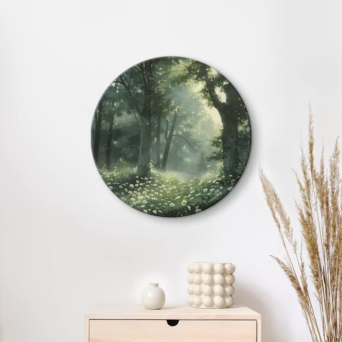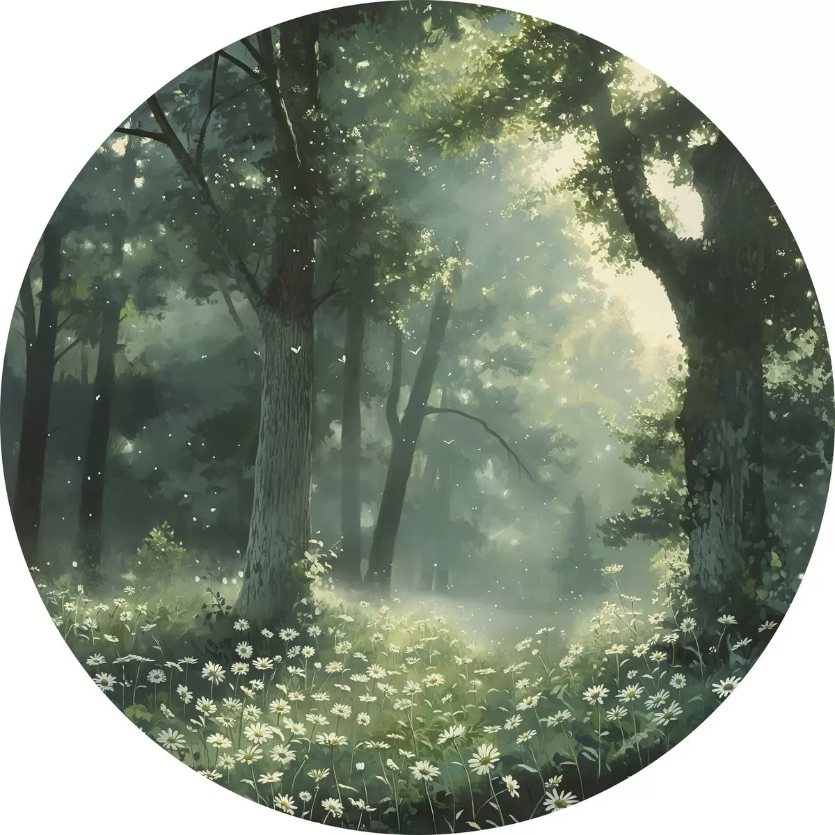 Pilt Tihe mets päikesevalguse puude sees, kummeliõied, roheline muru, loodus Nr r40224