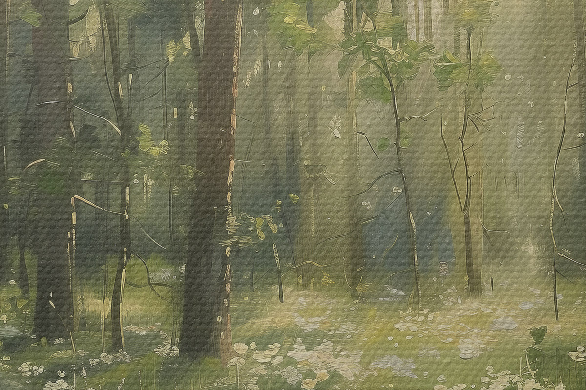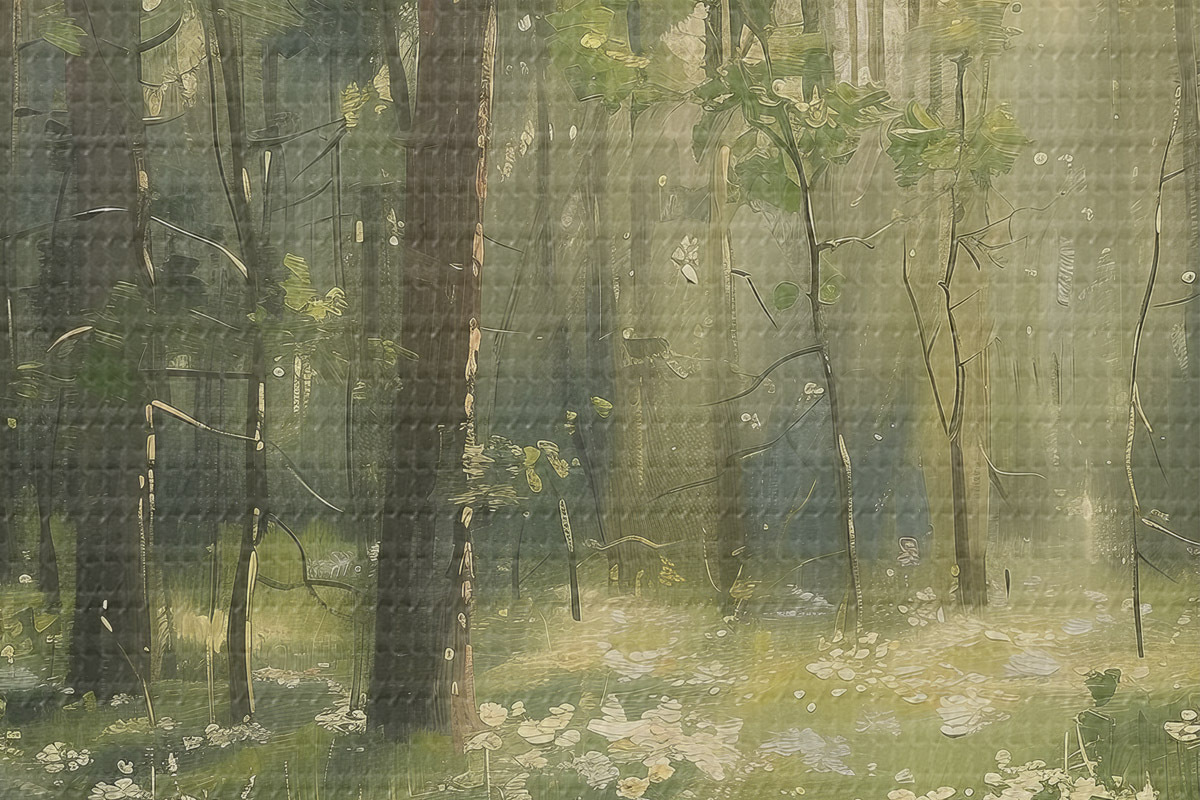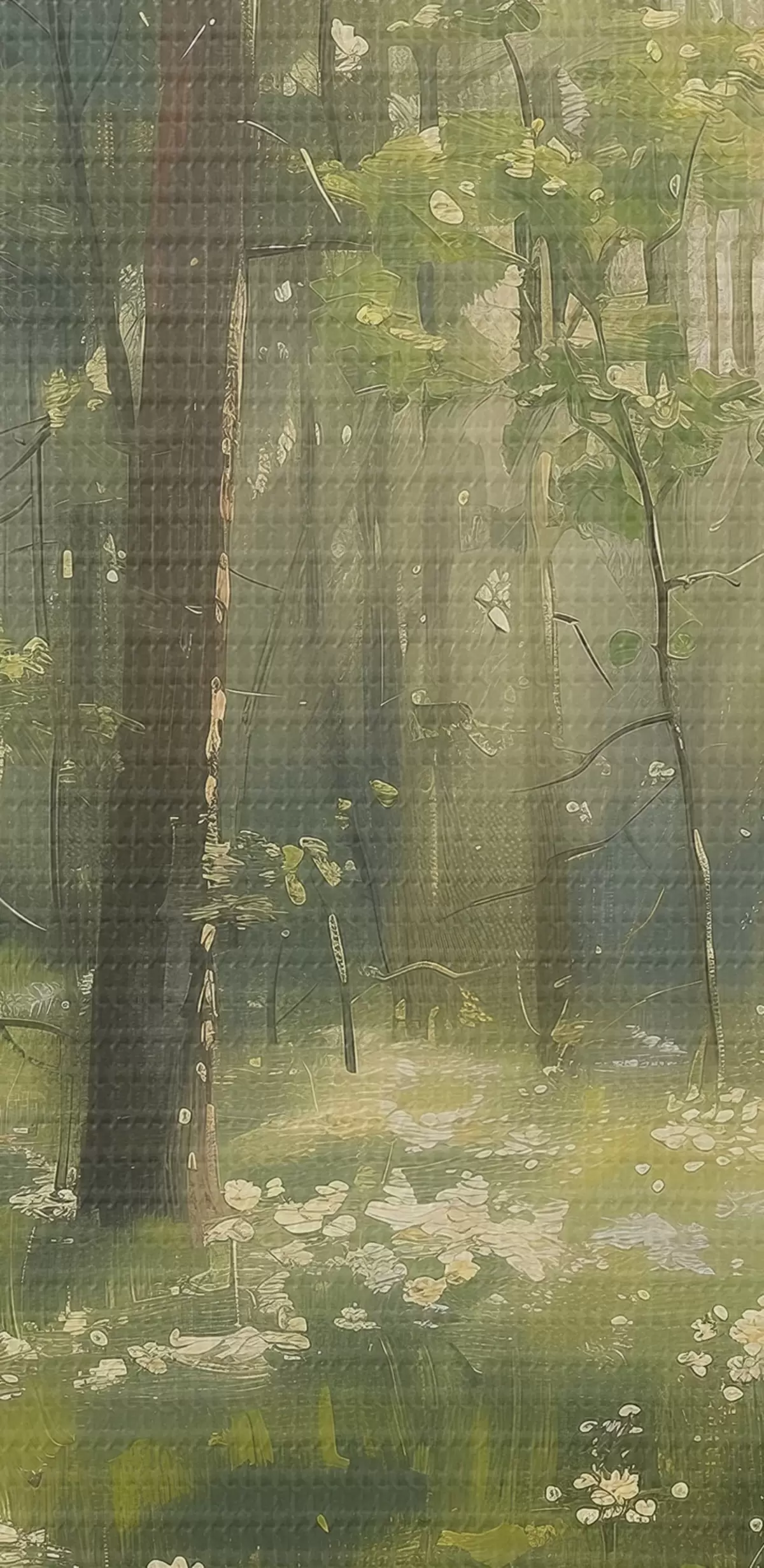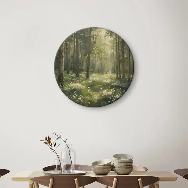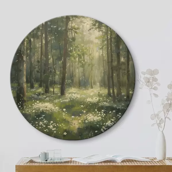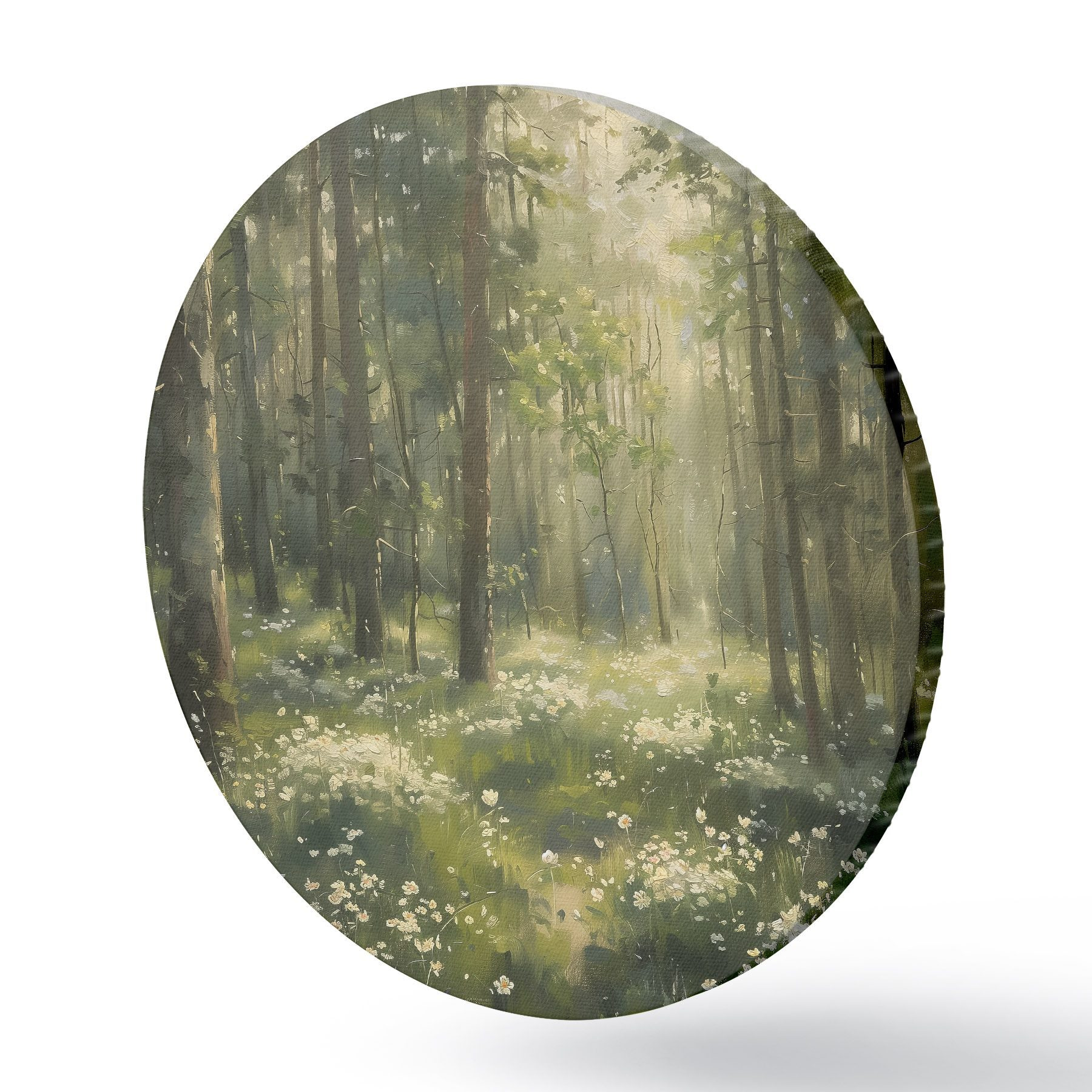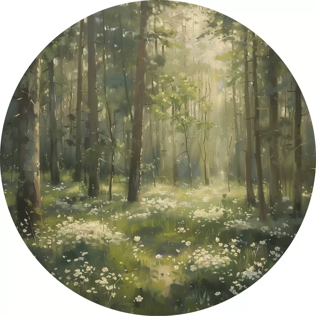 Pilt Mets päikesevalguse puude sees, kummeliõied, roheline muru, akrüüljoonistus Nr r40226