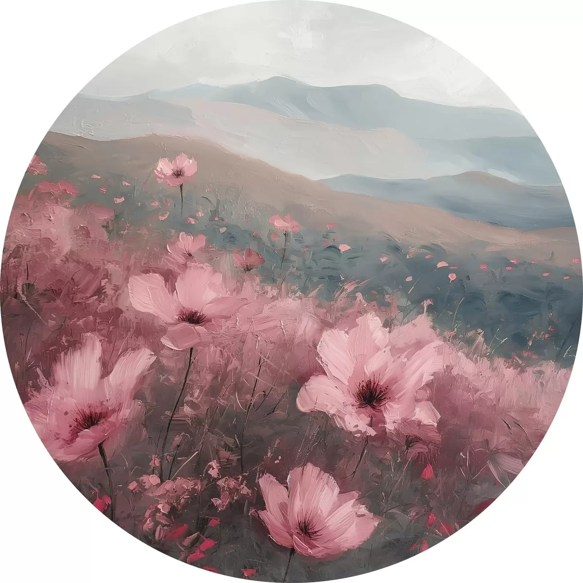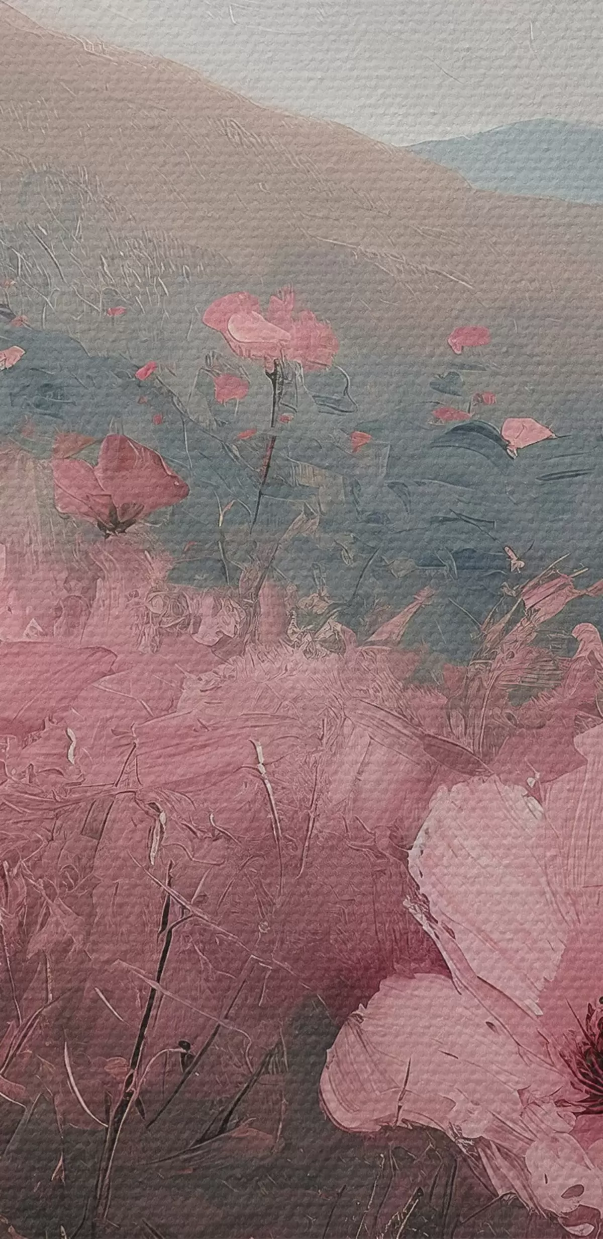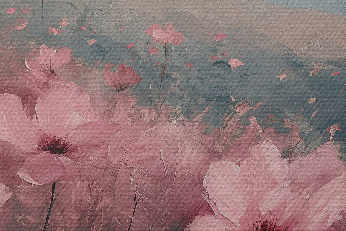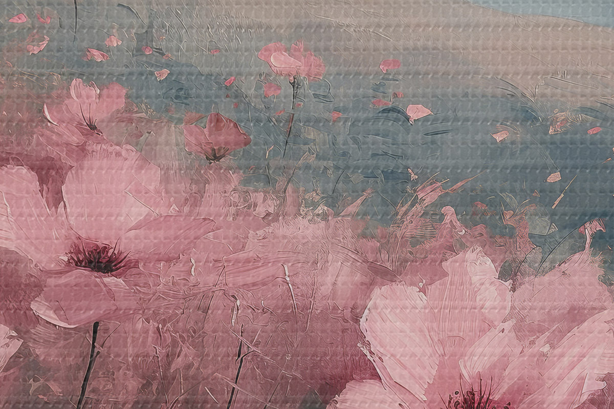 Pilt Roosad lilled heinamaal, loodusmaastik, mäed, õlimaal, erksad pintslitõmbed Nr r40233