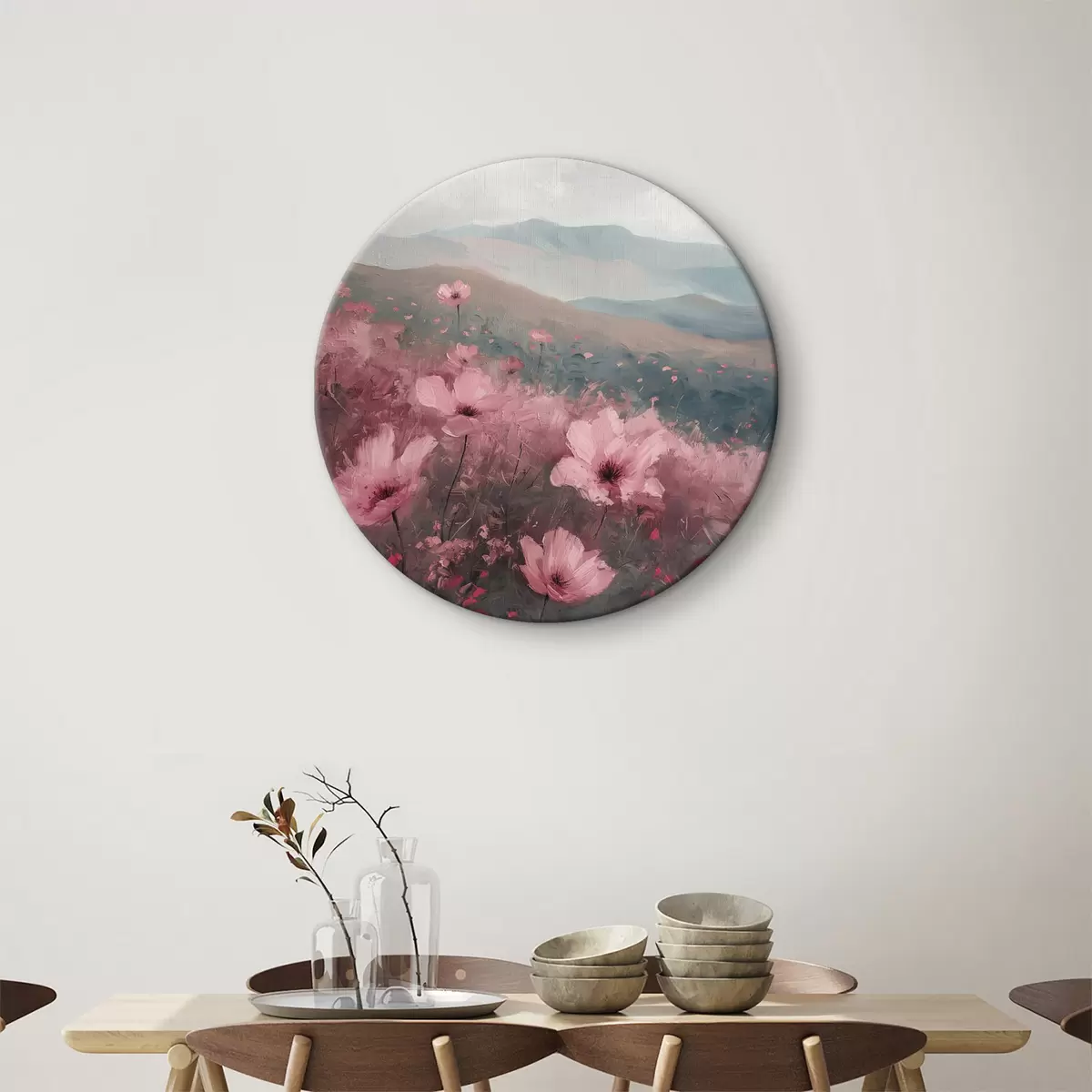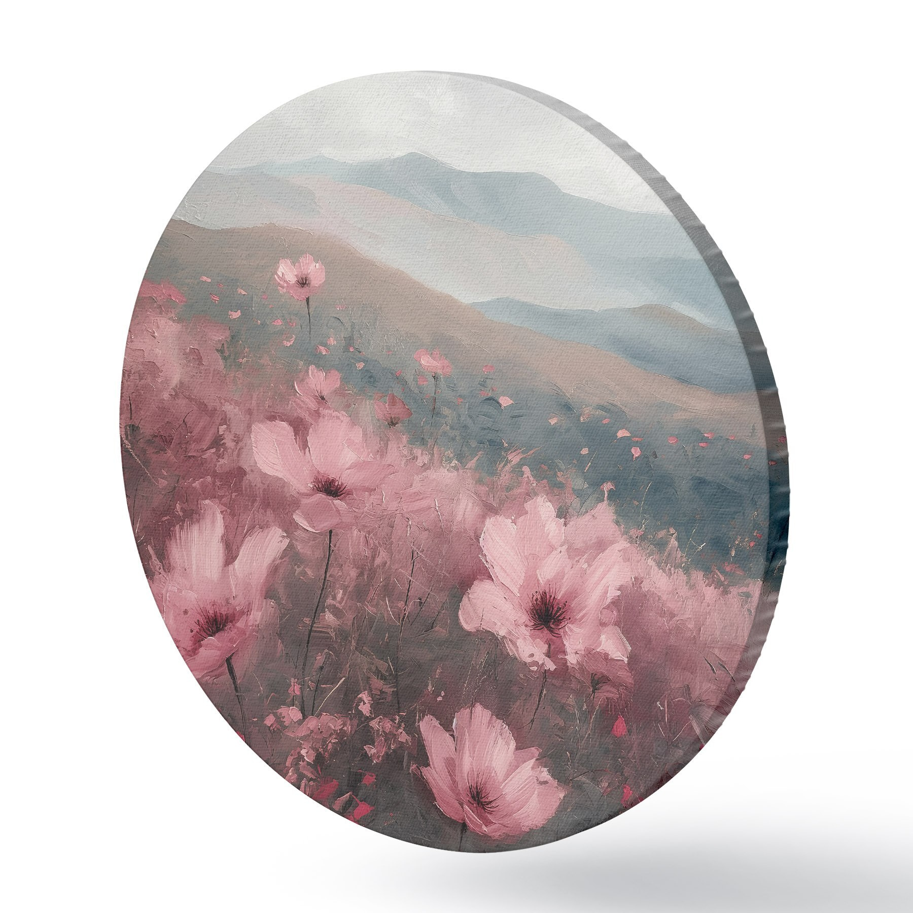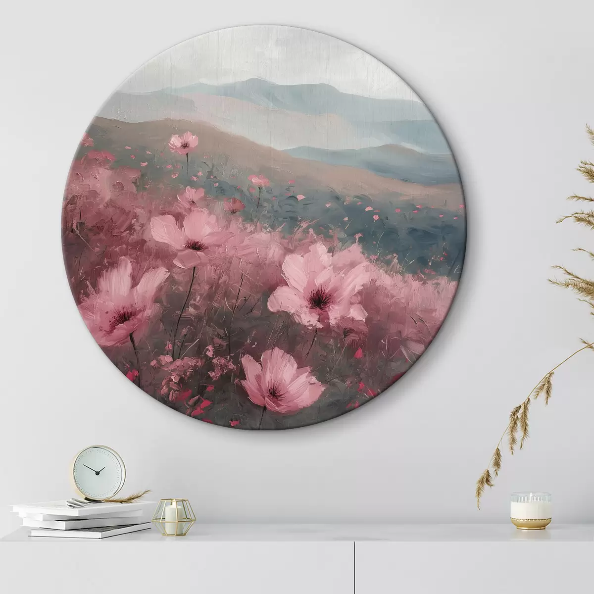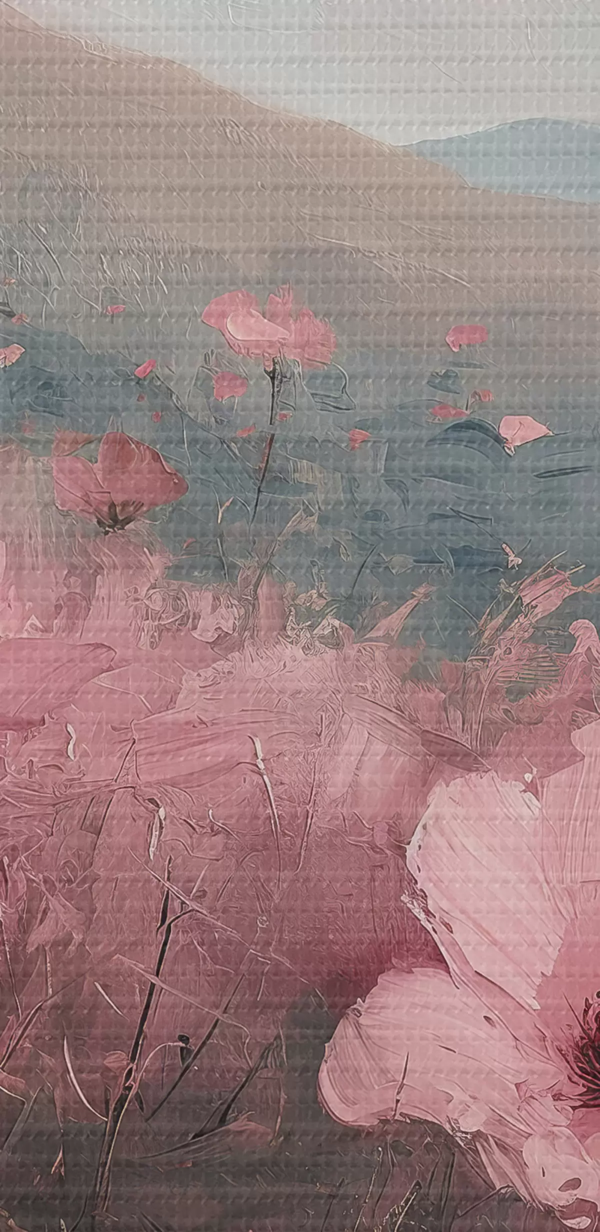 Pilt Roosad lilled heinamaal, loodusmaastik, mäed, õlimaal, erksad pintslitõmbed Nr r40233