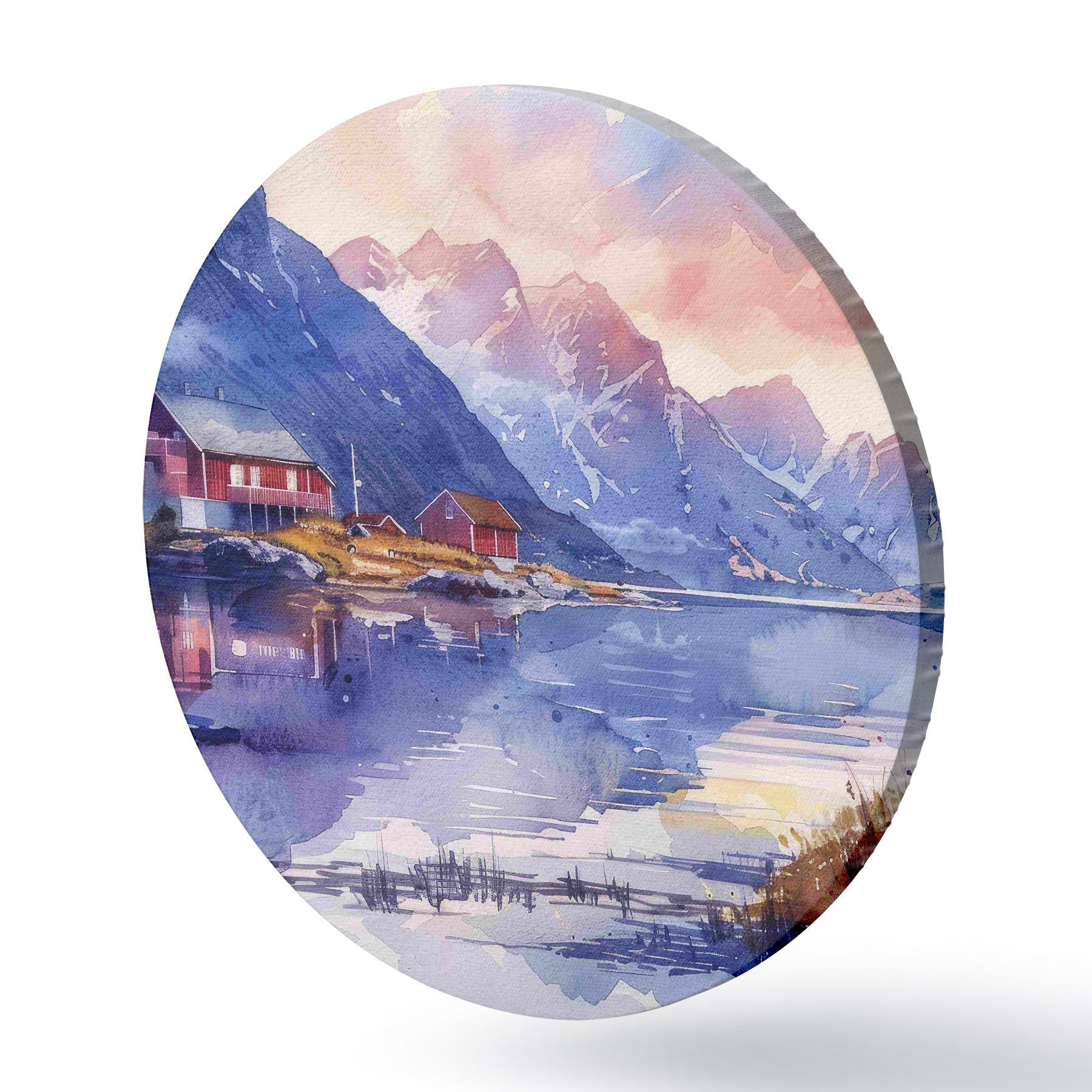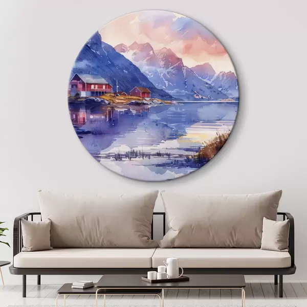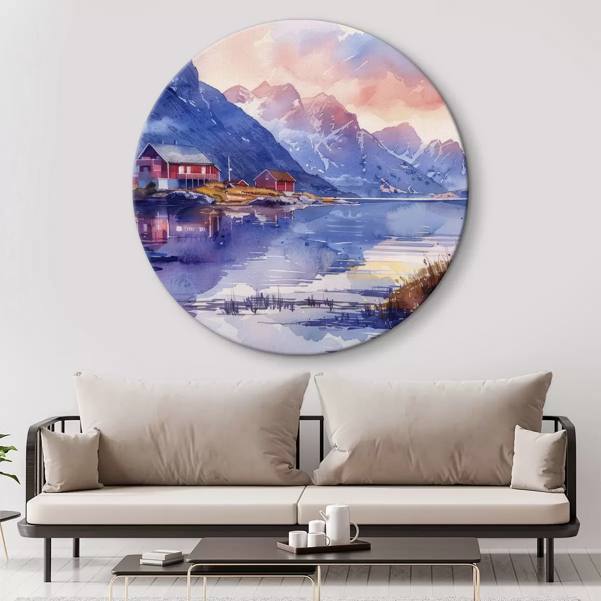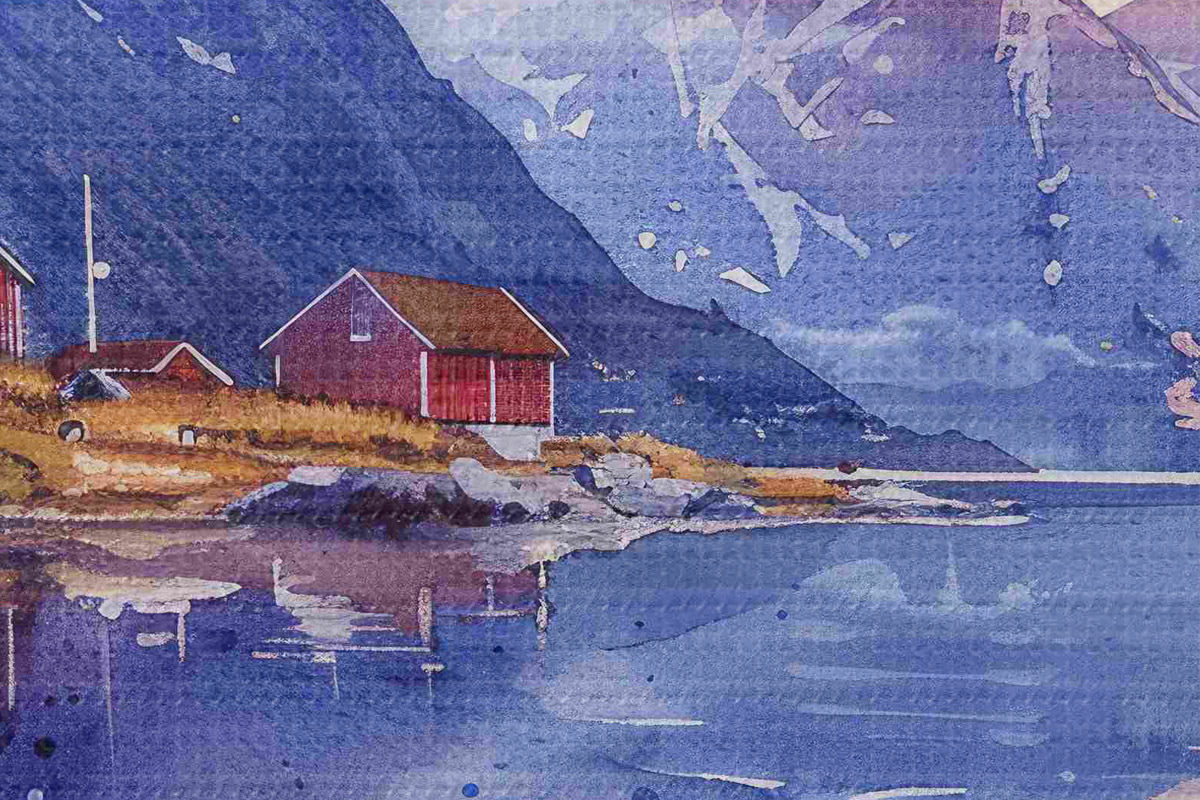 Pilt Norra küla, päikeseloojangu taevas, rahulik jõgi, mäed, akvarell Nr r40311