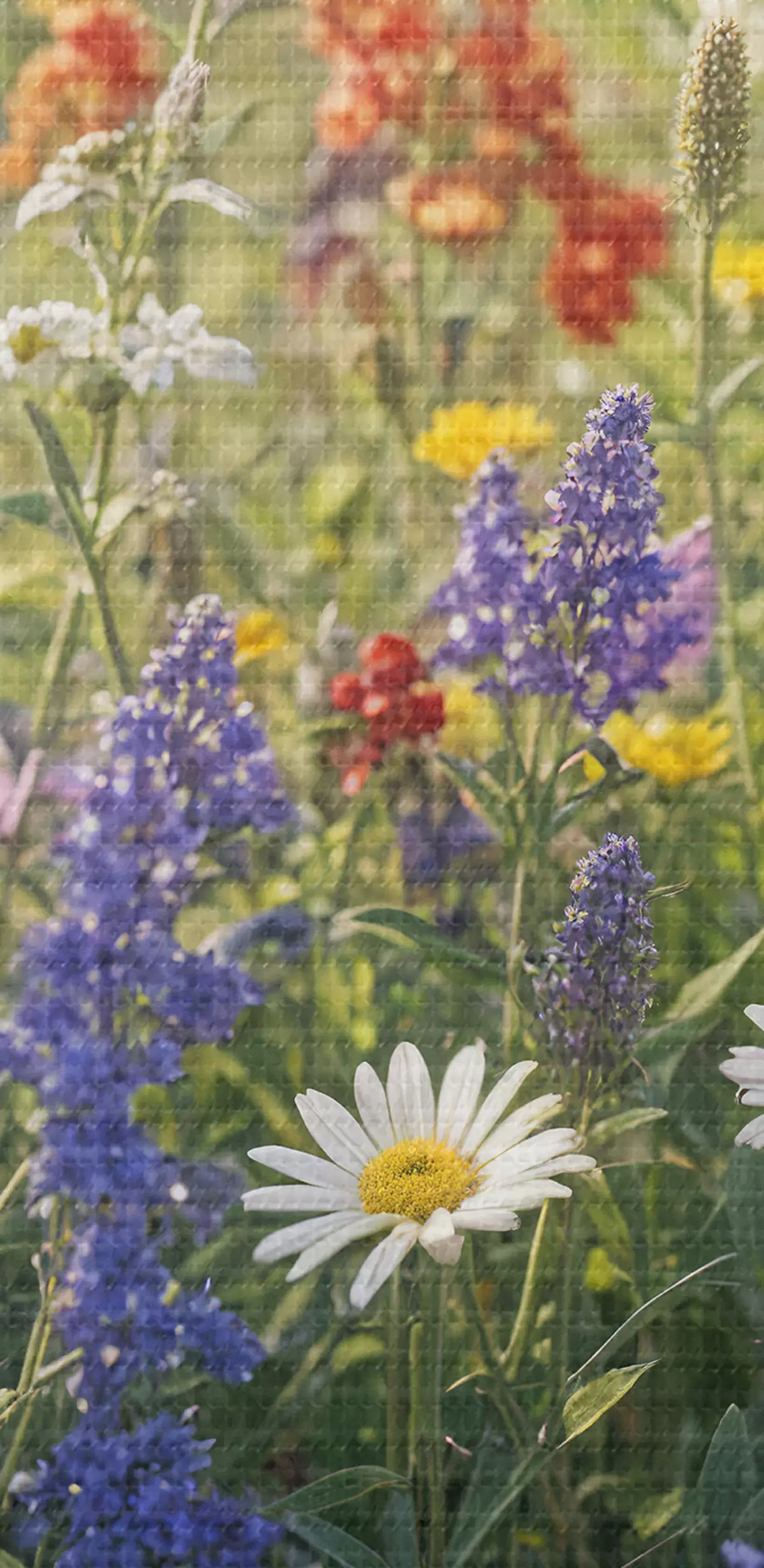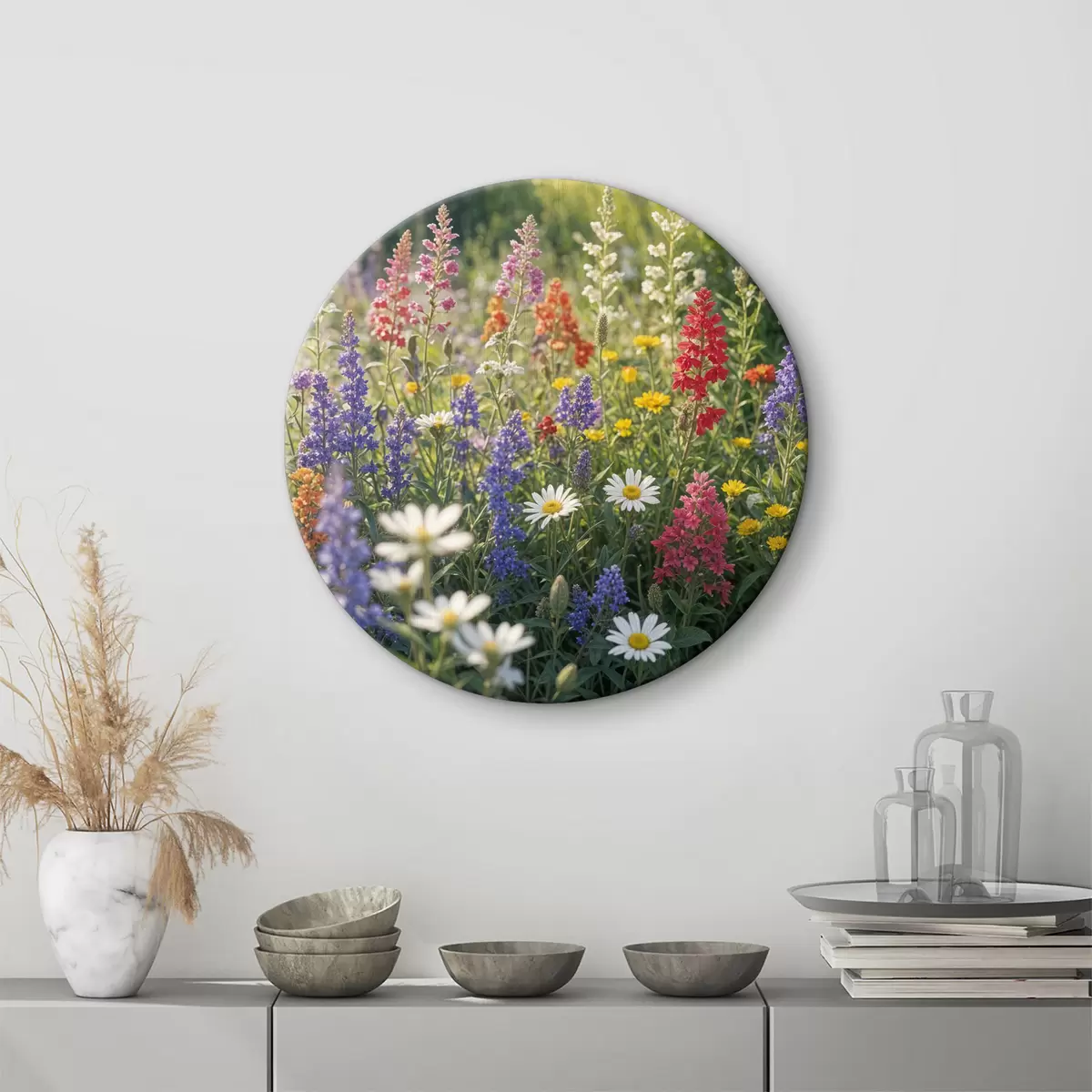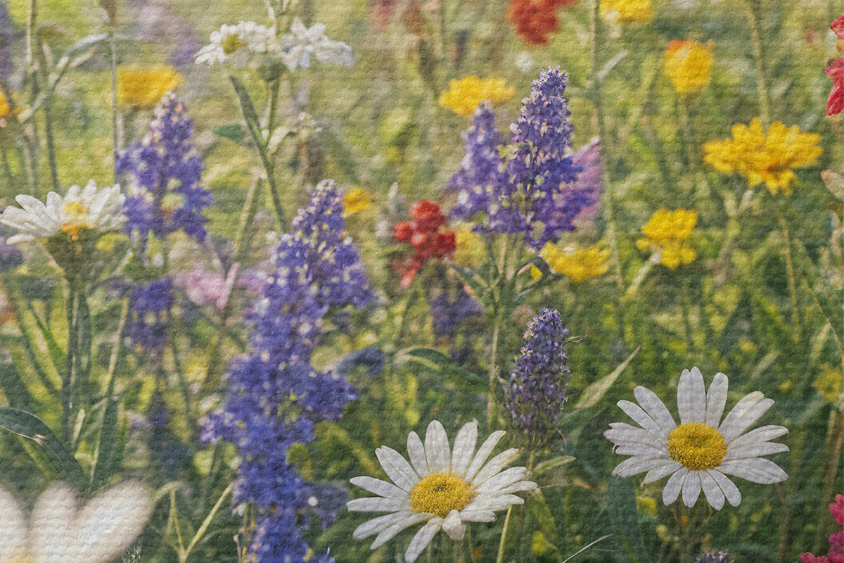 Pilt Värviline metslilleniit erinevate õitsevate lilledega, sealhulgas karikakrad, lavendel ja punased lilled Nr r40390