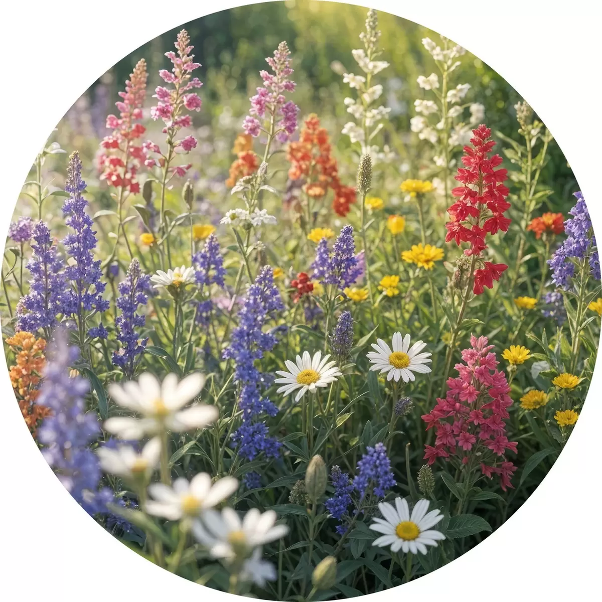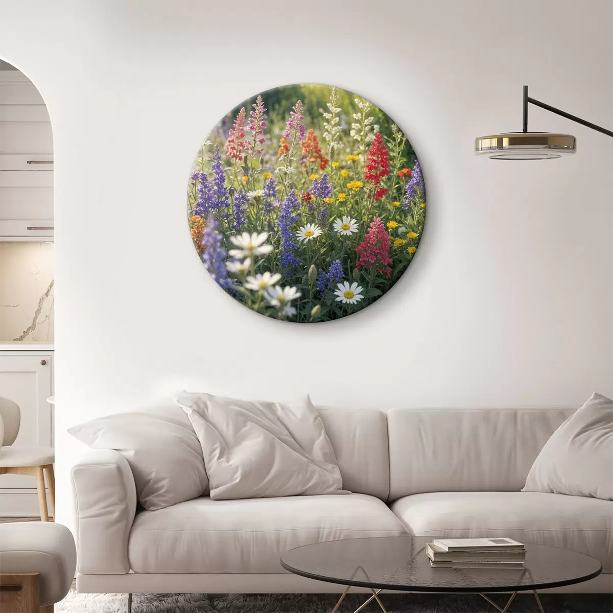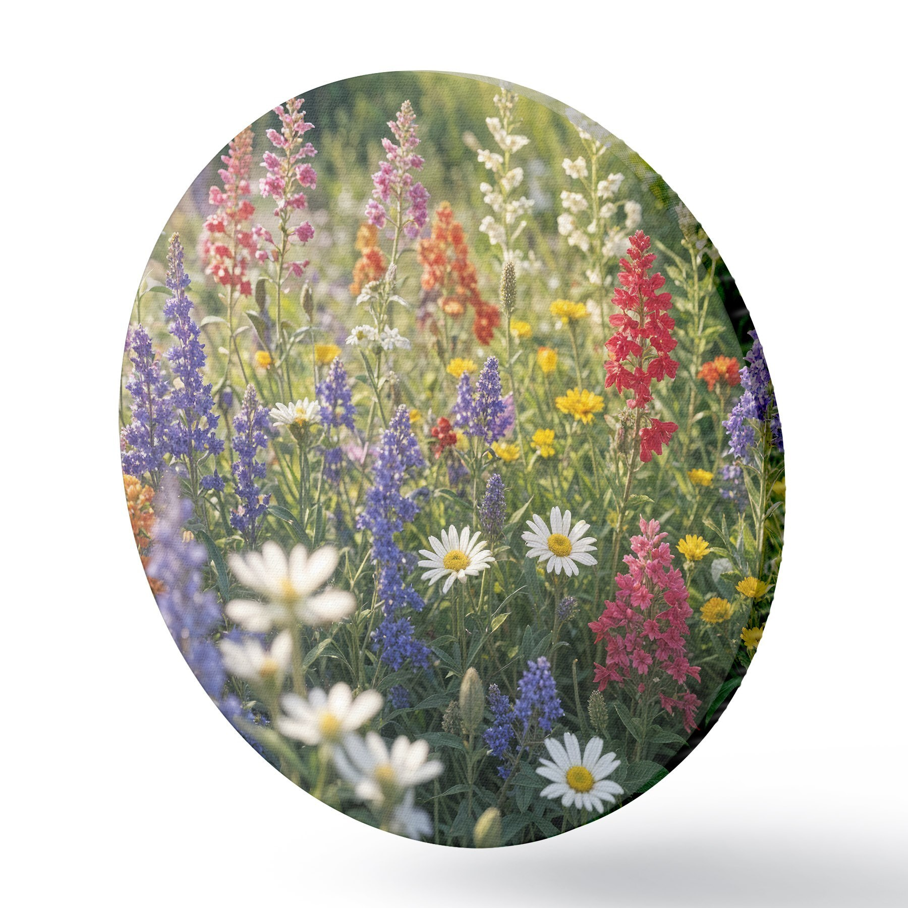 Pilt Värviline metslilleniit erinevate õitsevate lilledega, sealhulgas karikakrad, lavendel ja punased lilled Nr r40390