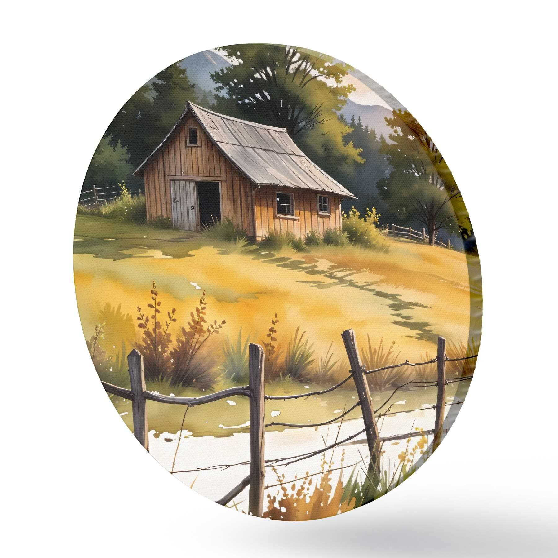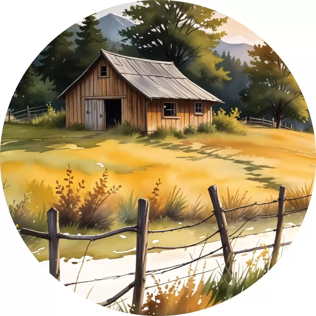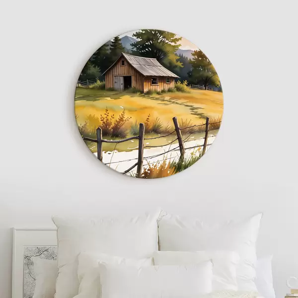 Pilt Vana puumaja maapiirkonnas, ümbritsetud rohuväljade, männipuude ja mägedega Nr r40394