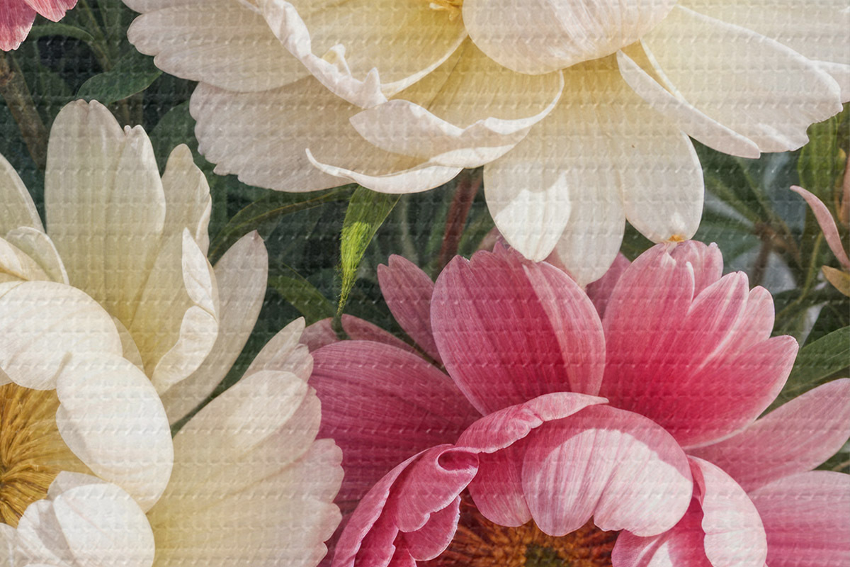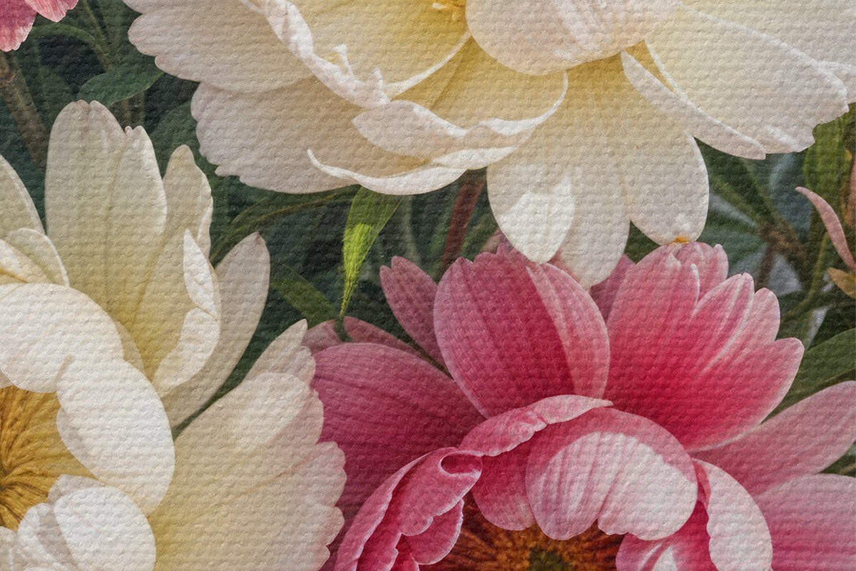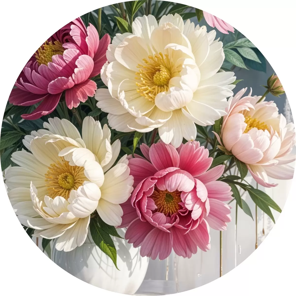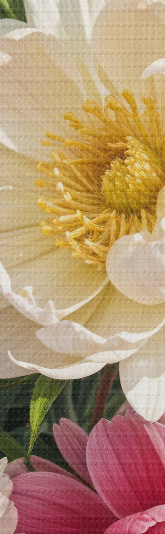 Pilt Erinevates roosade, valgete ja kollaste toonides elavate pojengide lillekimp koos värvipritsmetega Nr r40403