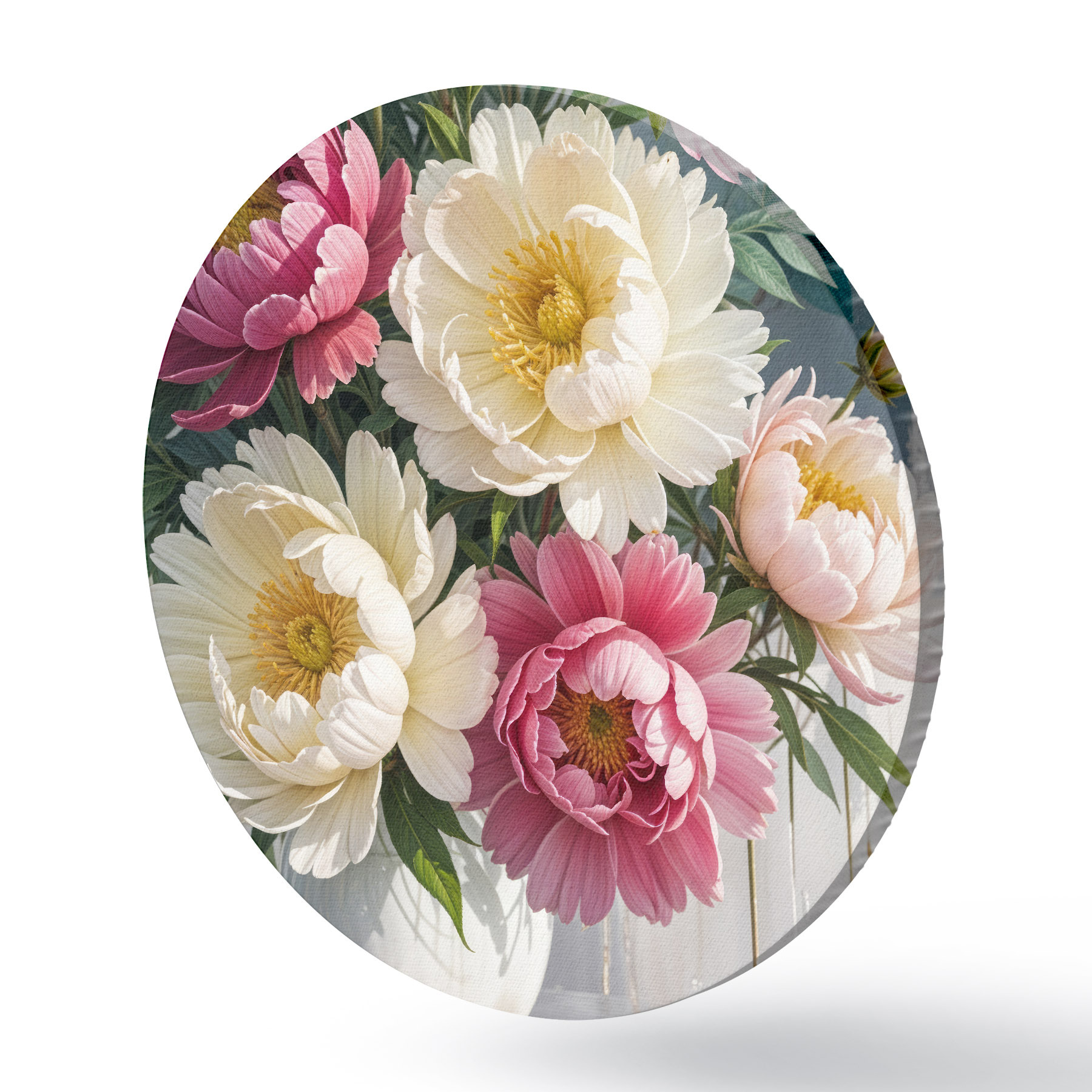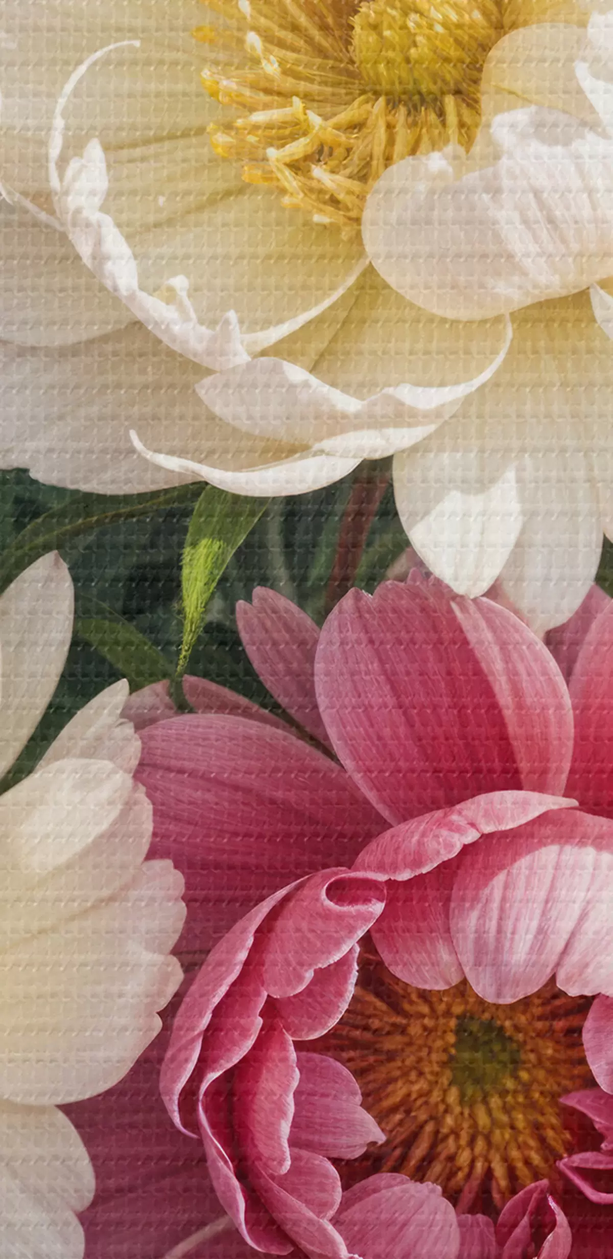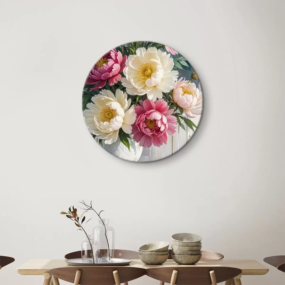 Pilt Erinevates roosade, valgete ja kollaste toonides elavate pojengide lillekimp koos värvipritsmetega Nr r40403