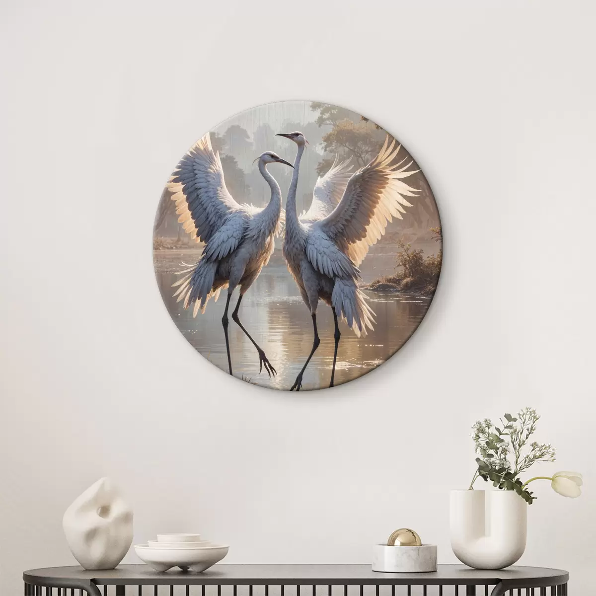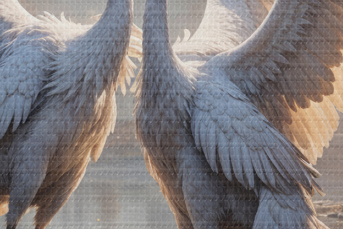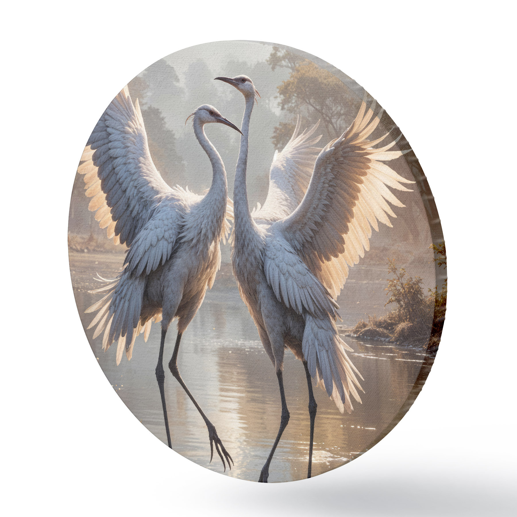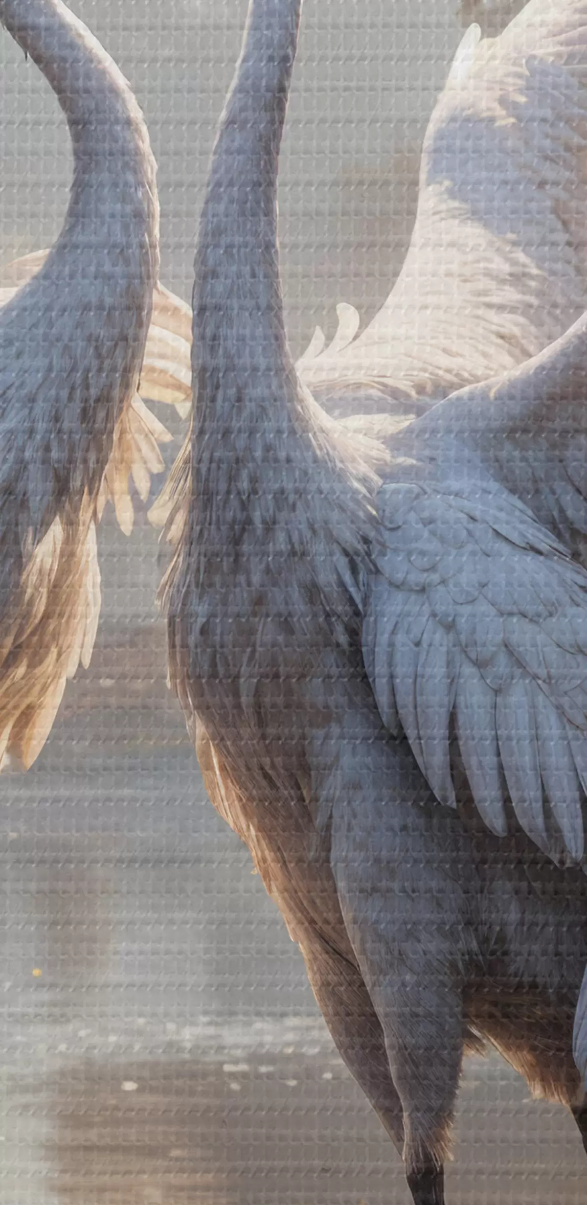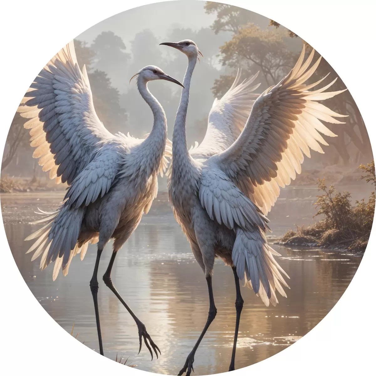 Pilt Kaks suurt halli, pikkade kaelade ja tiibadega kraanat, mis seisavad puudest ümbritsetud udujärves Nr r40404