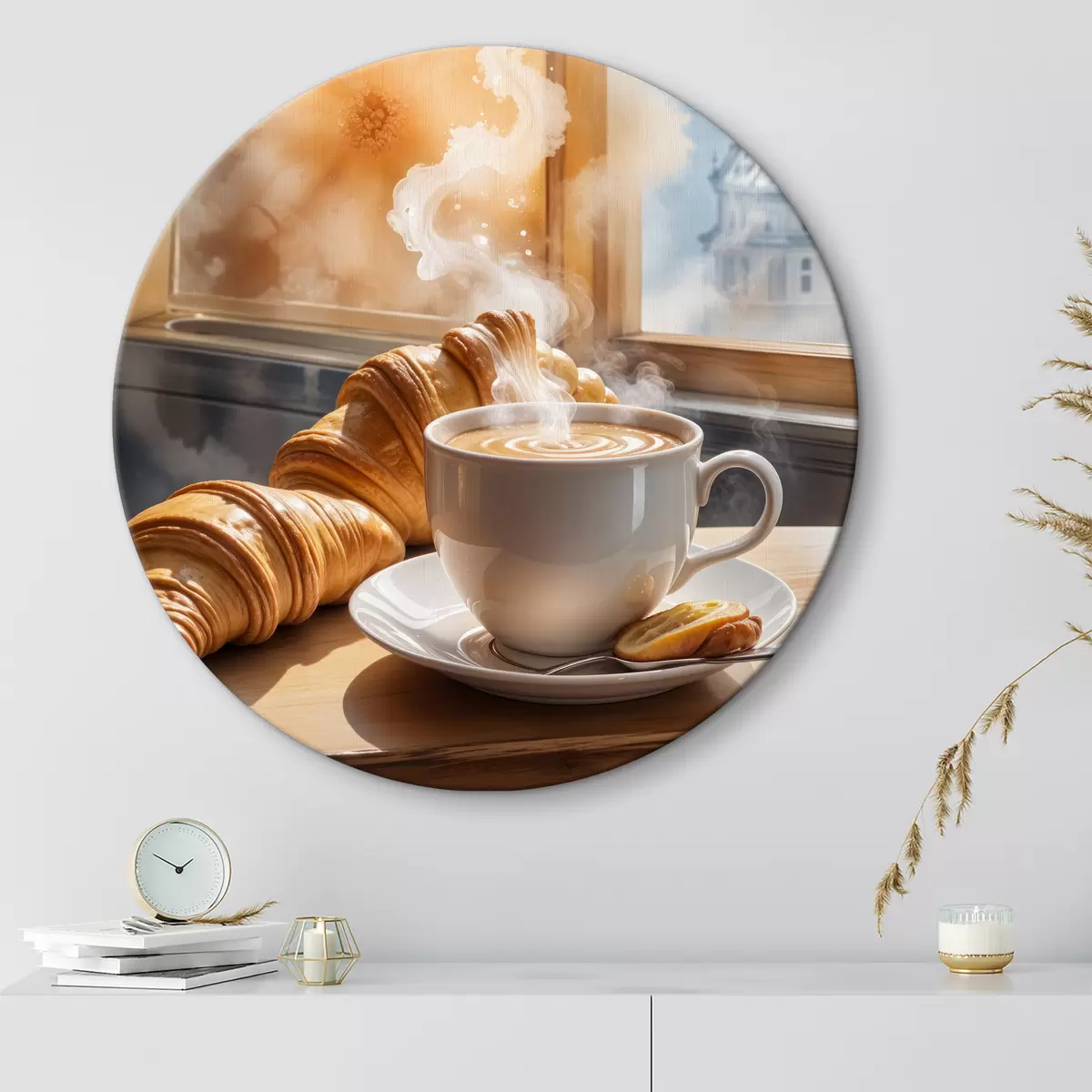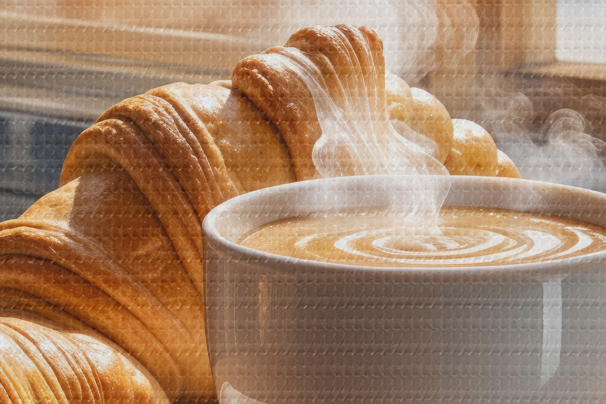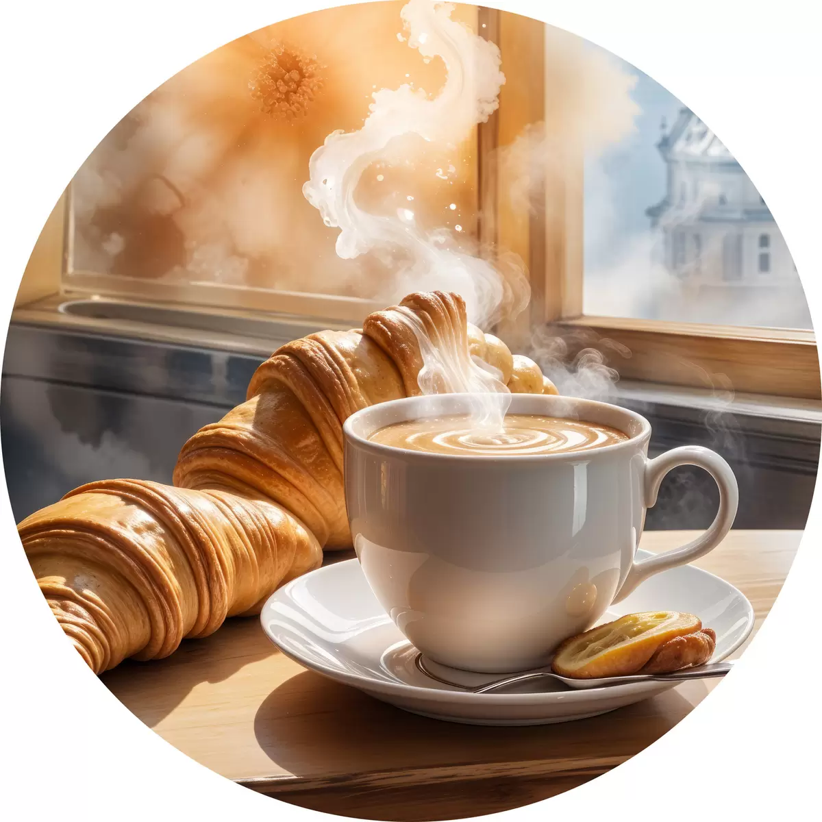 Pilt Soe kohvitass tõusva auruga, asetatud lauale sarvesaia kõrvale, vaatega ajaloolisele hoonele Nr r40405