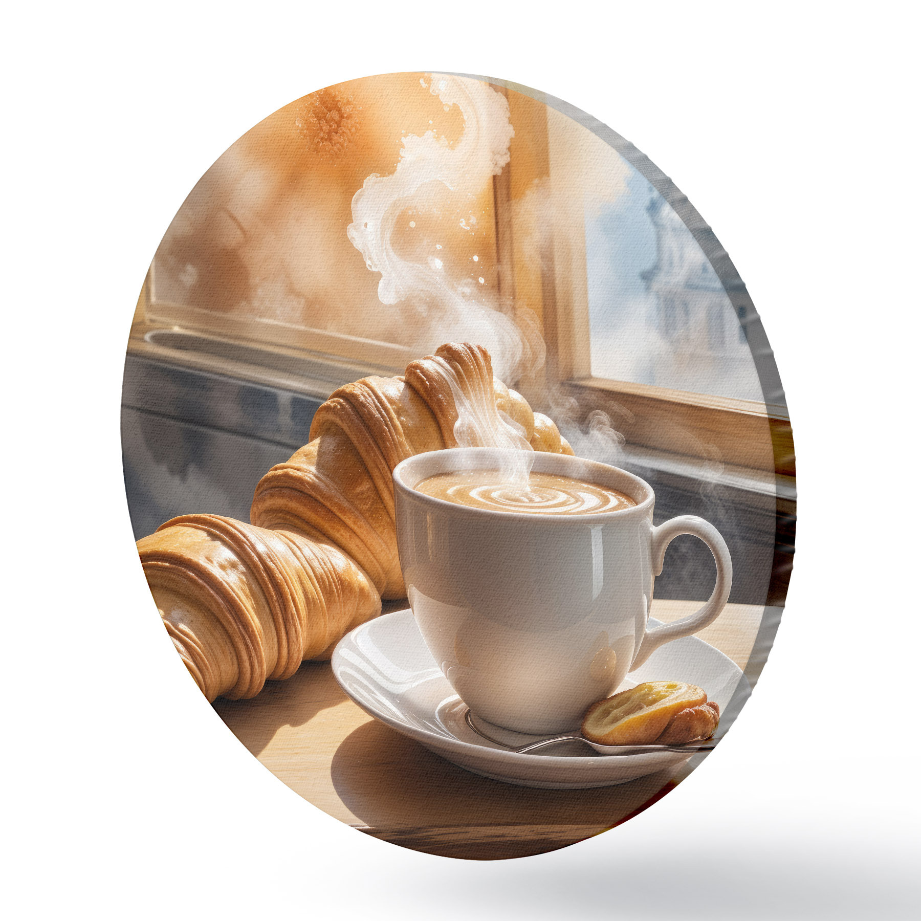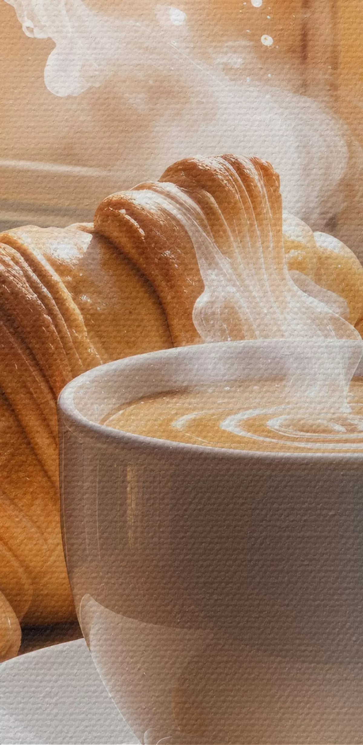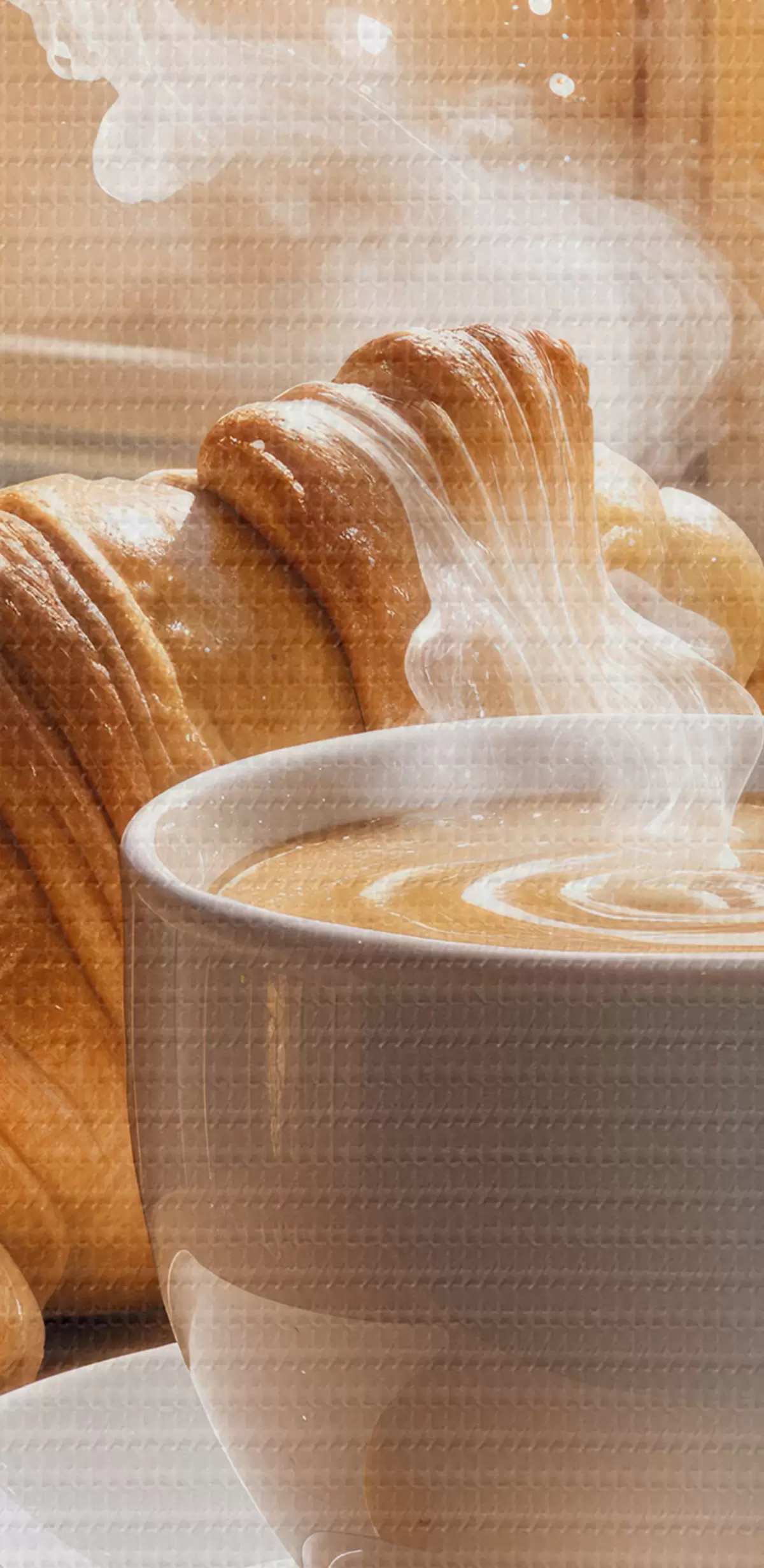 Pilt Soe kohvitass tõusva auruga, asetatud lauale sarvesaia kõrvale, vaatega ajaloolisele hoonele Nr r40405