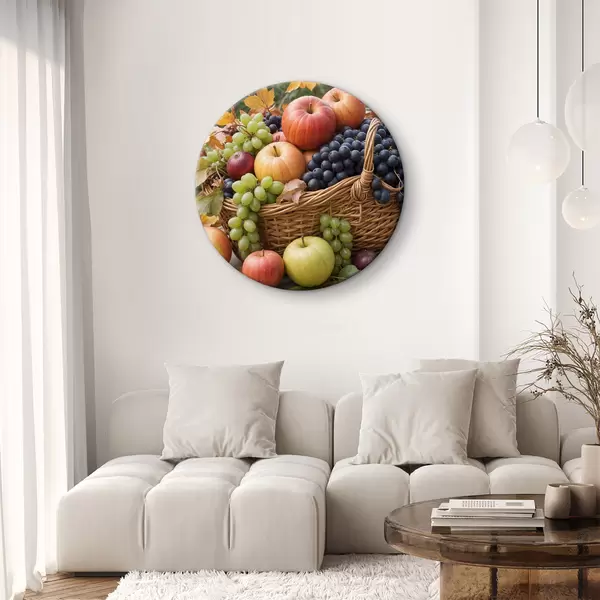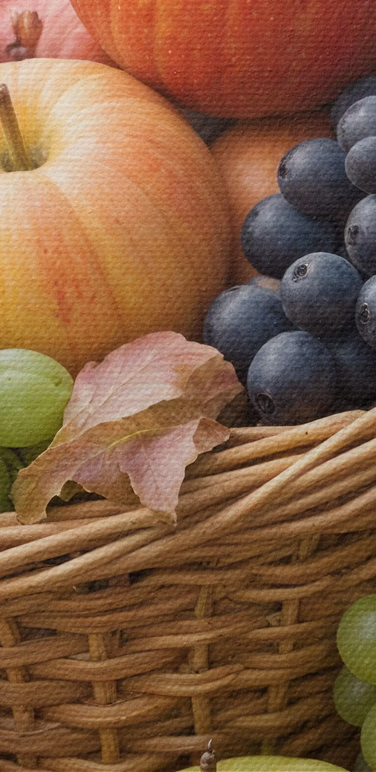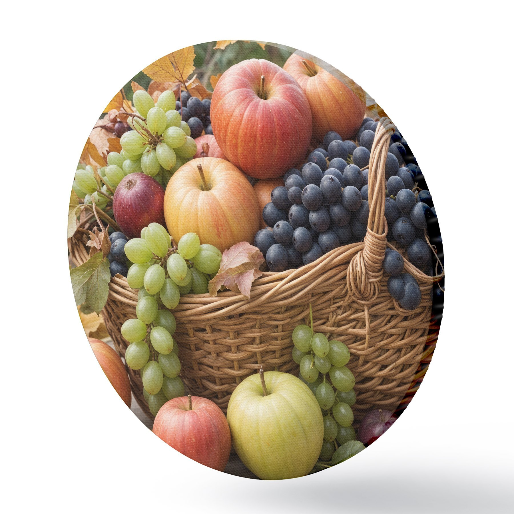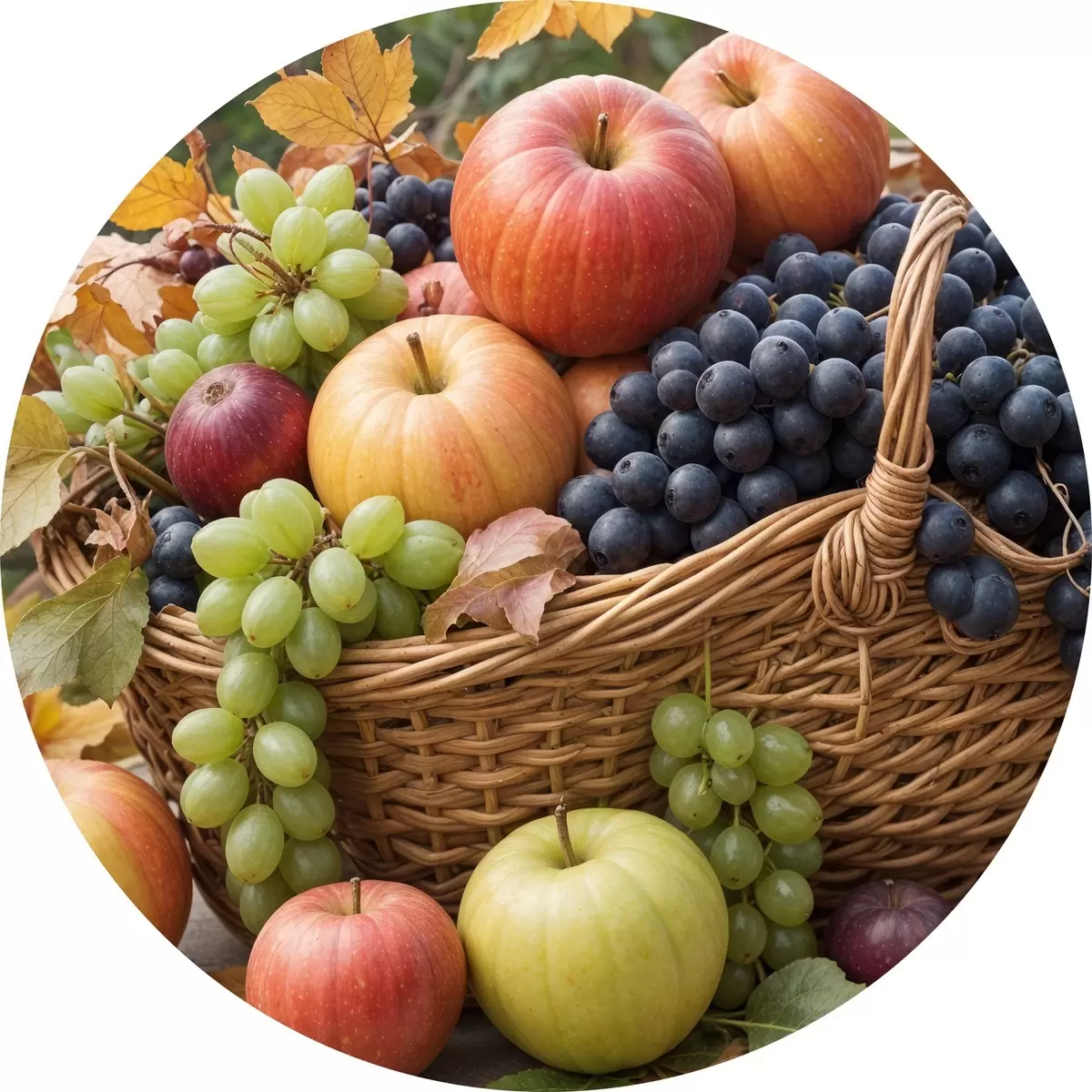 Pilt Erinevate sügisviljadega, sealhulgas õunte, viinamarjade ja pirnidega täidetud korv, mida ümbritsevad langenud lehed Nr r40409
