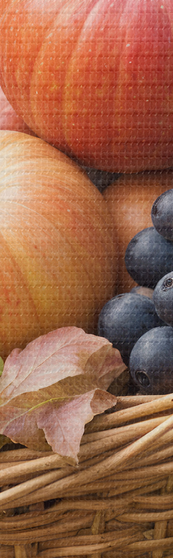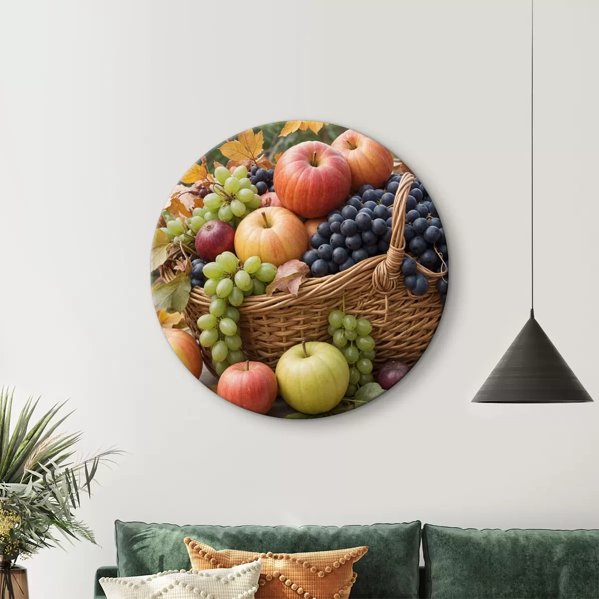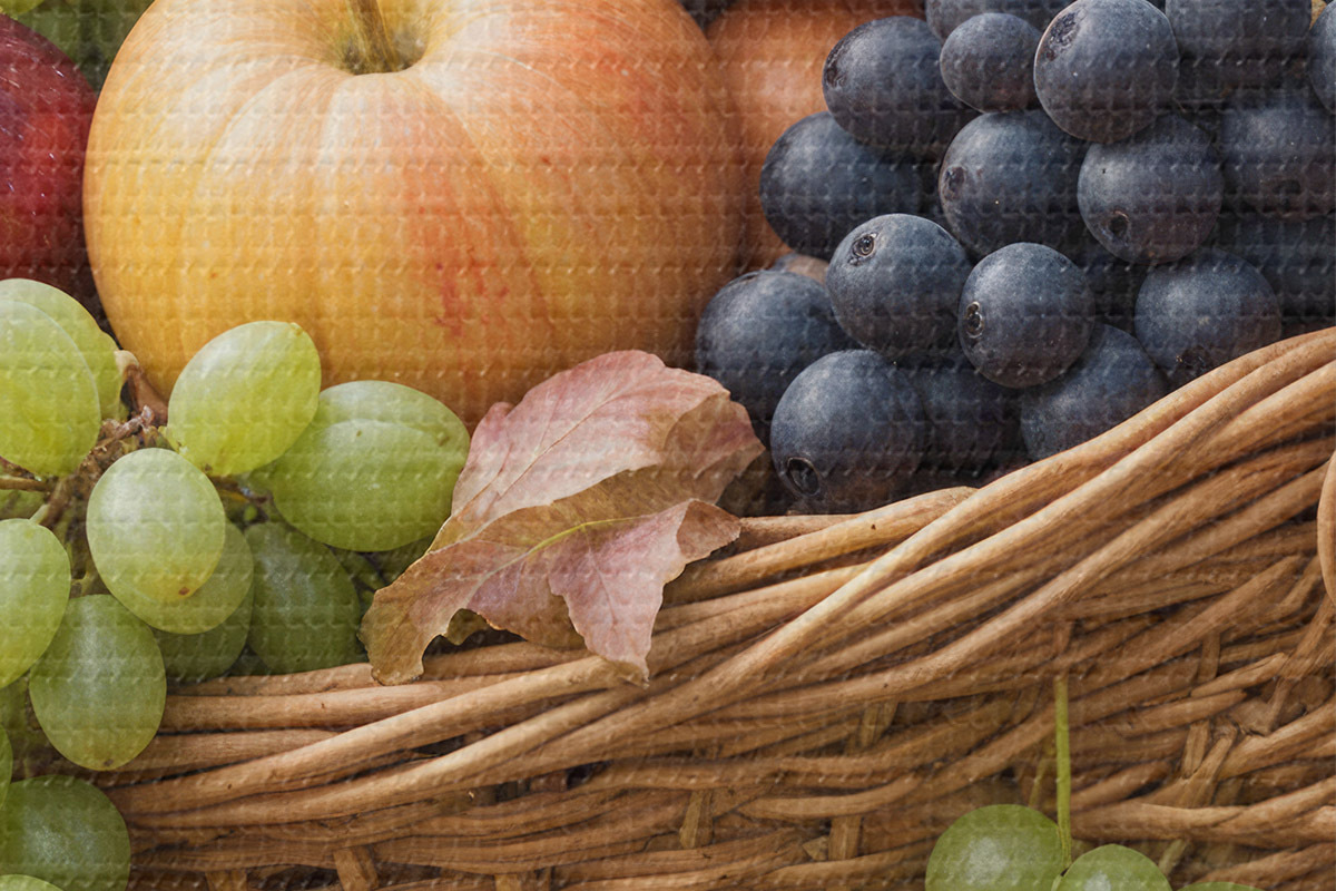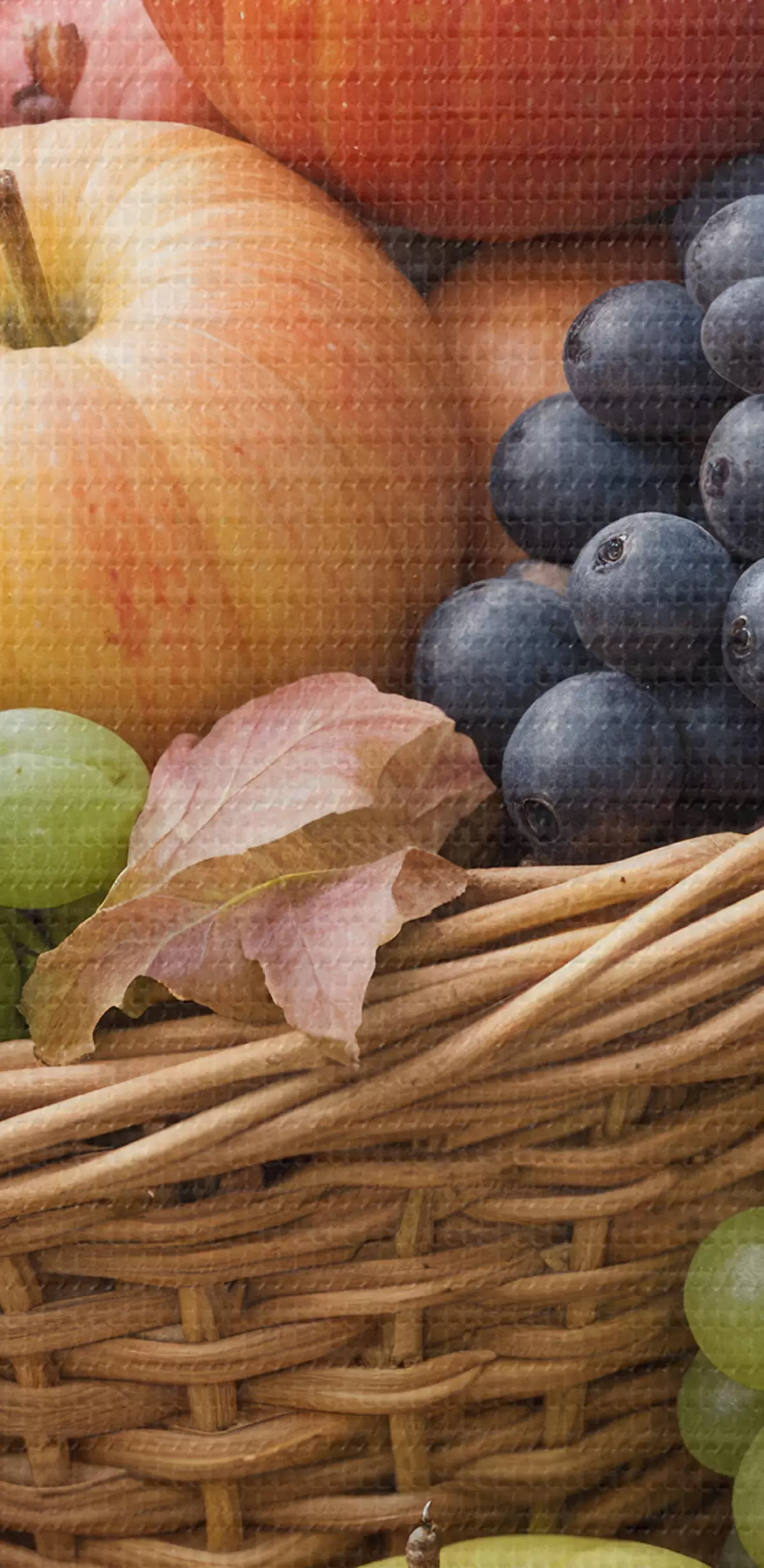 Pilt Erinevate sügisviljadega, sealhulgas õunte, viinamarjade ja pirnidega täidetud korv, mida ümbritsevad langenud lehed Nr r40409