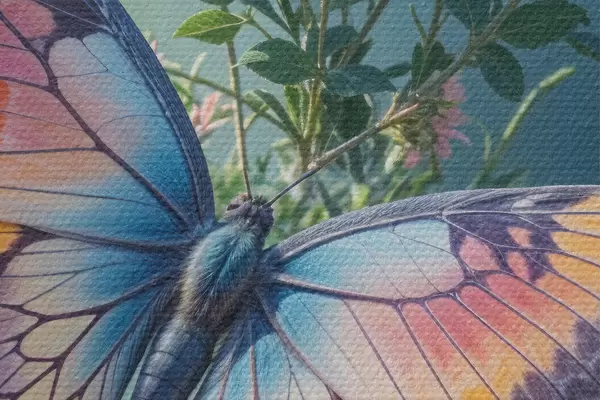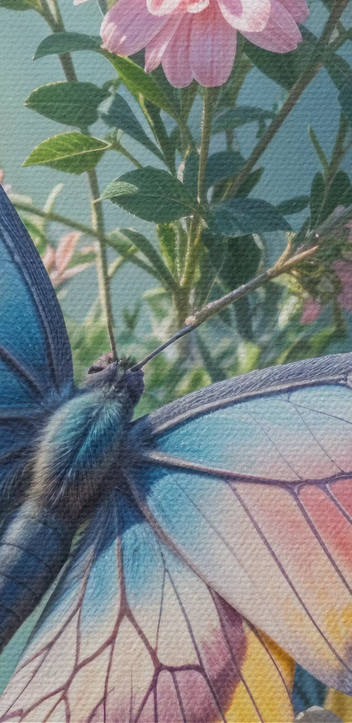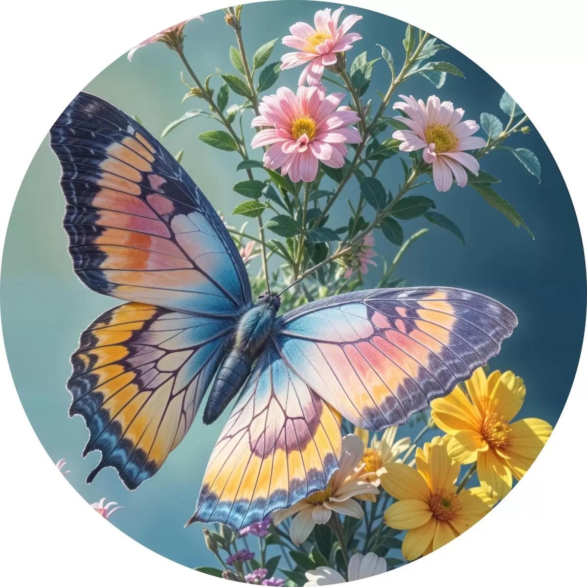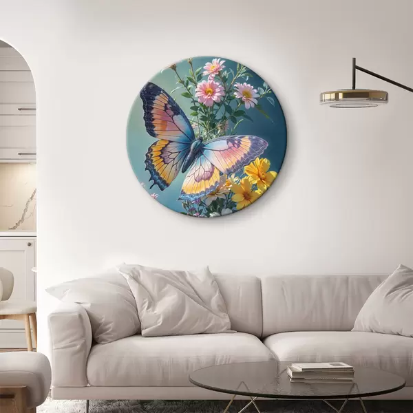 Pilt Suur värviline liblikas tumerohelisel taustal roosade ja kollaste lillede kimbul Nr r40411