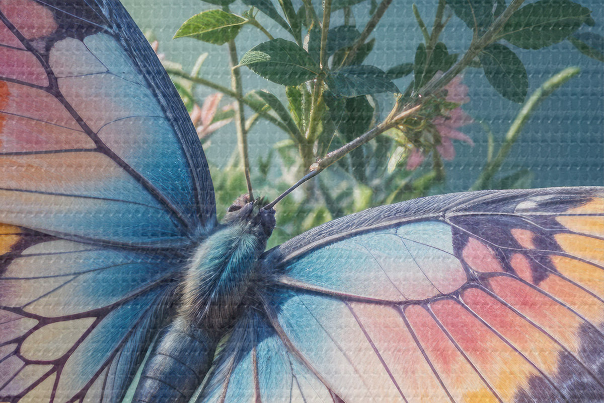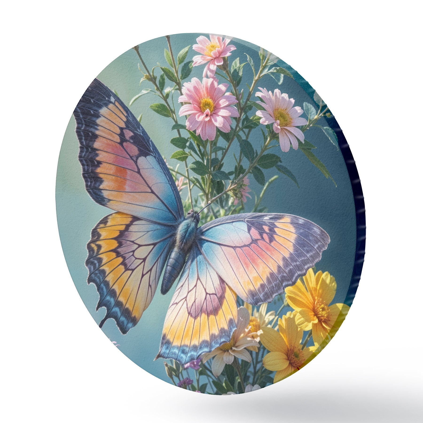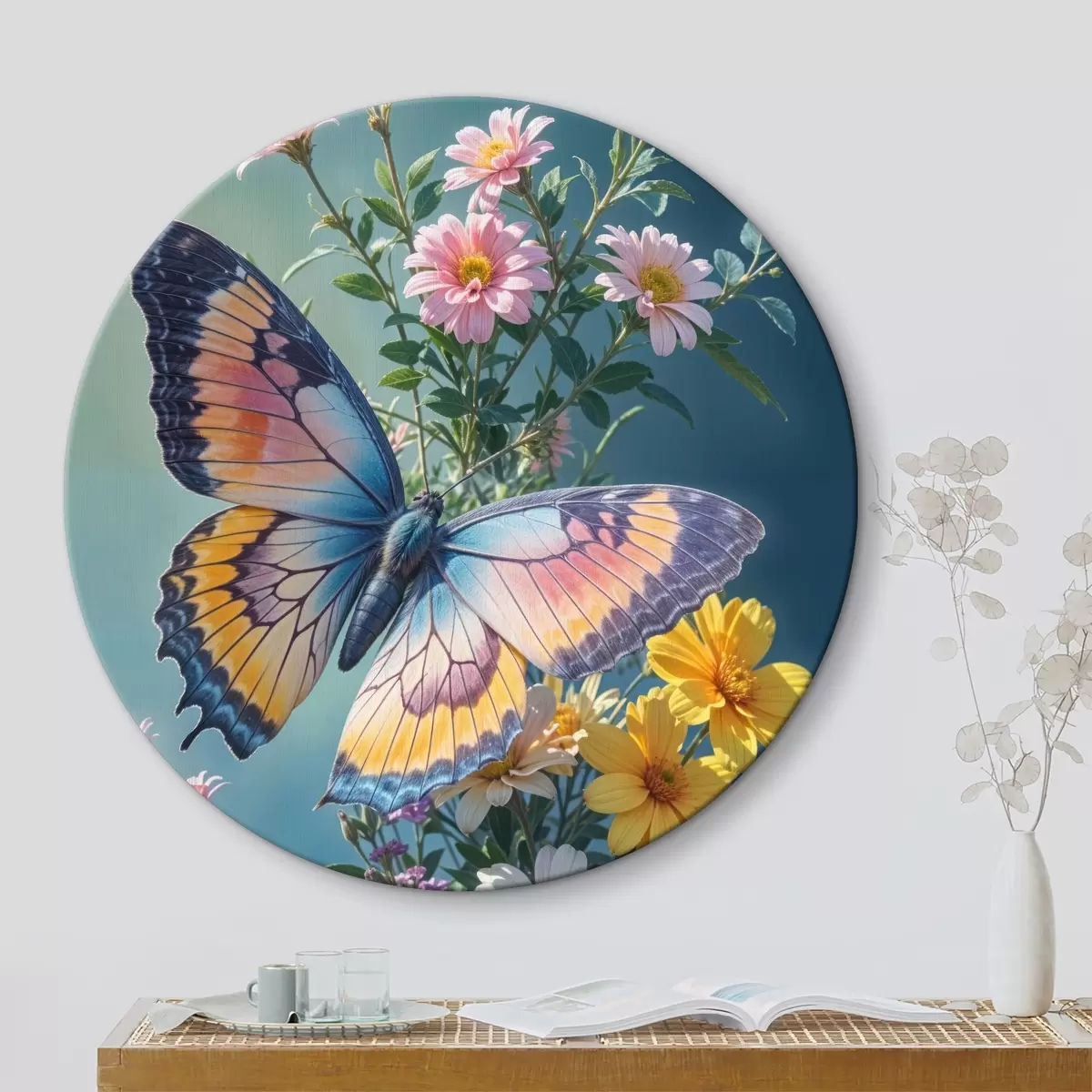 Pilt Suur värviline liblikas tumerohelisel taustal roosade ja kollaste lillede kimbul Nr r40411
